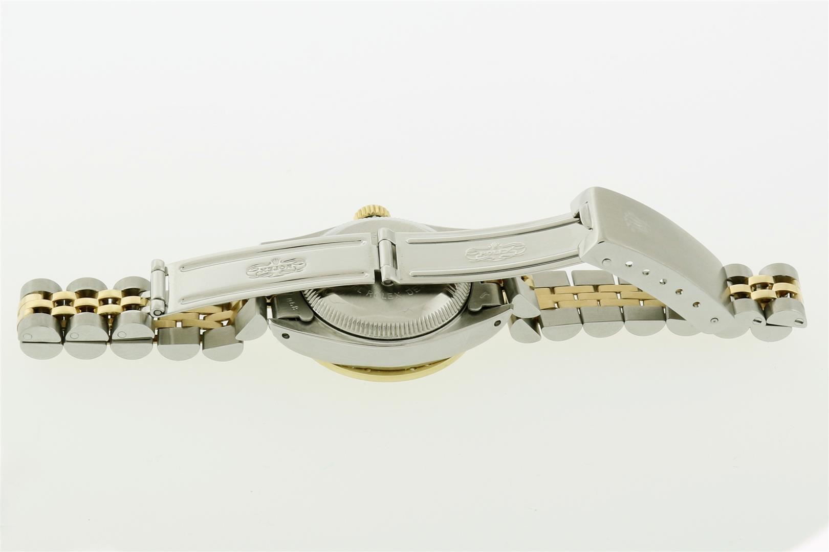 One Ladies Two Tone Rolex Datejust Polished Bright with Satin Finish, Serviced & Electronically Tested, Rolex Stainless Steel Case: 26mm, Rolex Stainless Steel Crown, Custom Diamond Lugs: 24 Diamonds On Lugs, Clarity: SI-VS, Color: G to H. Custom Bezel: New 18K Yellow Gold Emerald Beadset Bezel, Diamond Count: 28 Diamonds + 4 Emerald, Clarity: SI-VS, Color: G to H. Custom Crystal: New Sapphire with Magnified Date Window. Custom Hands: New Luminescent Hands. Rolex Movement: Automatic Winding Movement. Custom Dial: Refinished To Mother of Pearl with Custom Added Diamonds, 43 Diamonds in Dial G To H In Color, Clarity: VS. Date Window: 3 O'Clock Position Date Display, Model: Datejust Condition: G-6 Extra Fine. Rolex Bracelet: Stainless Steel Jubilee Band. Bright Polish & Satin Finish. 6.0 Inch Length, Adjustable. Standard Clasp, with Rolex Logo. This Pre Owned Watch Has Been Serviced Time Tested And Is In Excellent Condition It Is Free Of All Scratches And Dents.