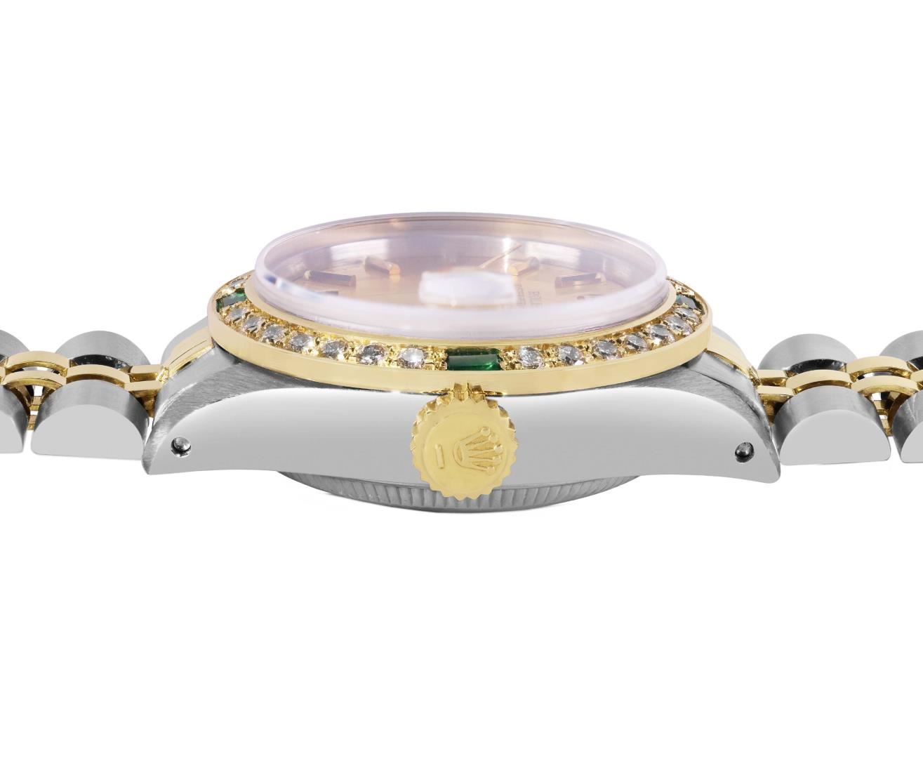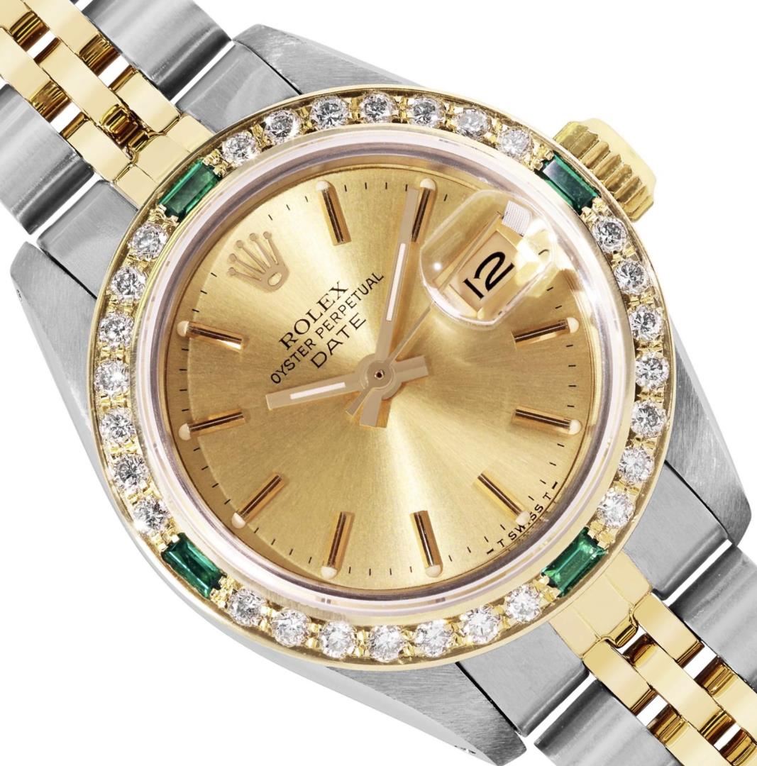 One Rolex Ladies Pre Owned Two Tone Yellow Gold & Stainless Steel Rolex Date Watch Polished, Serviced & Electronically Tested, Rolex Yellow Gold & Stainless Steel Case: 26mm, Rolex Yellow Gold Crown. Custom Bezel: New 18K Yellow Gold Emerald Beadset Diamond Bezel, Diamond + Gem Count: 36 Diamonds + 4 Emeralds, Clarity: SI-VS, Color: G to H. Custom Crystal: New Sapphire Crystal With Date Window. Custom Hands: New Luminescent Hands. Rolex Movement: Automatic Winding Movement 2030. Rolex Factory Dial: Champagne Dial With Baton Index Markers And Dash Track. Date Window: 3 O'Clock Position Date Display, Condition: G-6 Extra Fine. Rolex Bracelet: Two Tone 14K Yellow Gold & Stainless Steel Jubilee Band. Bright Polish & Satin Finish. 6.0 Inch Length, Adjustable. Standard Clasp, With Rolex Logo. This Watch Has Been Serviced Time Tested And Is In Excellent Condition It Is Free Of All Scratches And Dents. This Watch Comes With A Rolex Box.