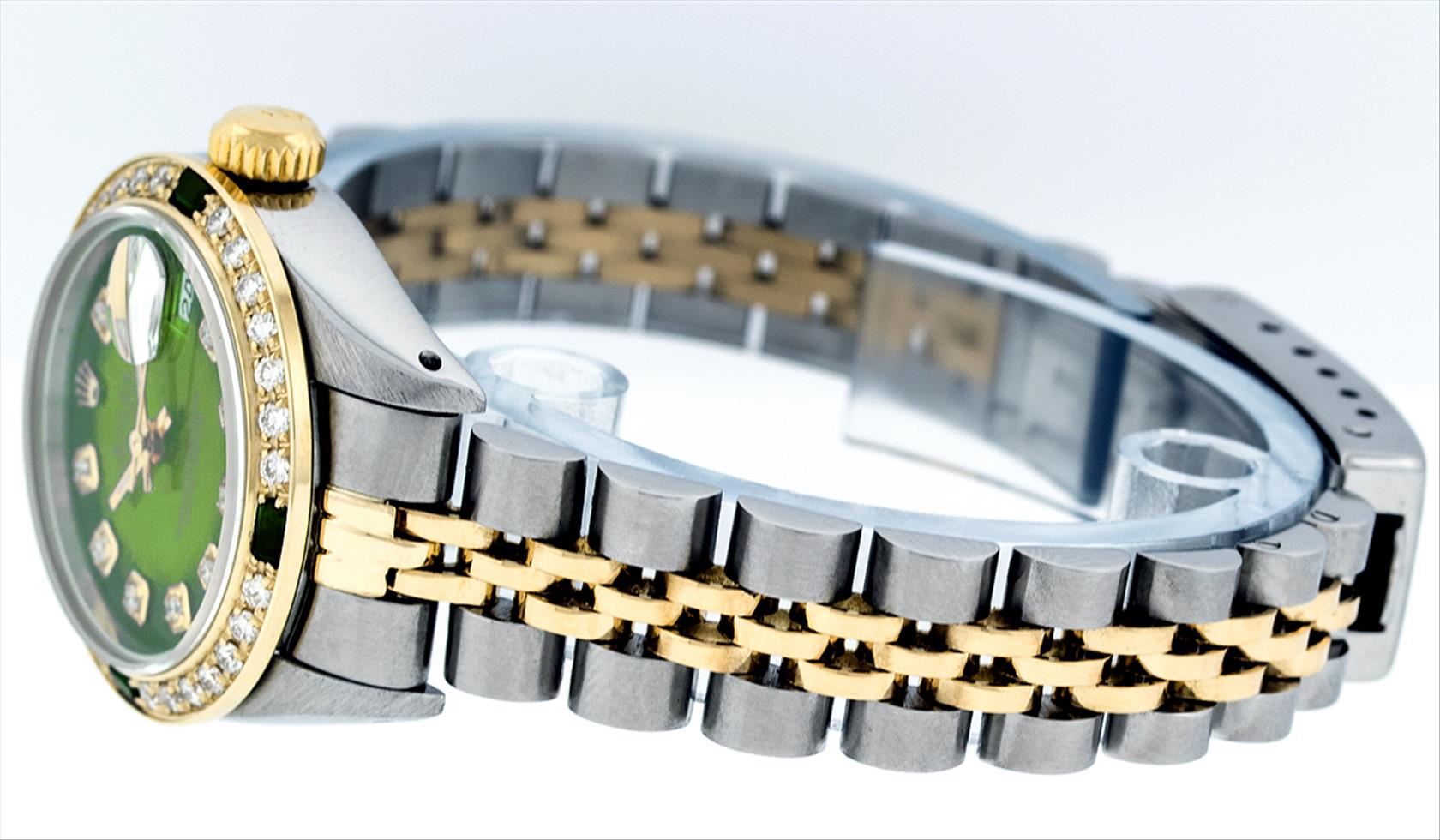 One Ladies Two Tone Rolex Datejust Polished, Serviced & Electronically Tested, 14K Yellow Gold & Stainless Steel Case:26mm, 14K Yellow Gold Crown, Custom Bezel: 18K Yellow Gold Emerald Beadset Diamond Bezel, Diamond Count: 28 Diamonds + 4 Emeralds Total Weight .70 Carat, Clarity: SI-VS, Color: G to H. Custom Crystal: Synthetic Sapphire Cyclops Lens. Movement: Automatic Winding Movement Caliber 2030. Custom Dial: Green Vignette With Diamond Hour Markers, Diamond Count: 10 Diamonds In Dial, Color: G to H, Clarity: SI-VS. Date Window: 3 O'Clock Position Date Display, Model: Datejust. Condition: G-6 Extra Fine. Bracelet: Two Tone 14K Yellow Gold & Stainless Steel Jubilee Band. Bright Polish. 5.5 Inch Length, Adjustable. Standard Clasp, With Rolex Logo.