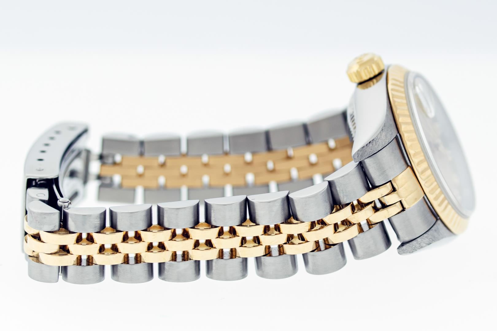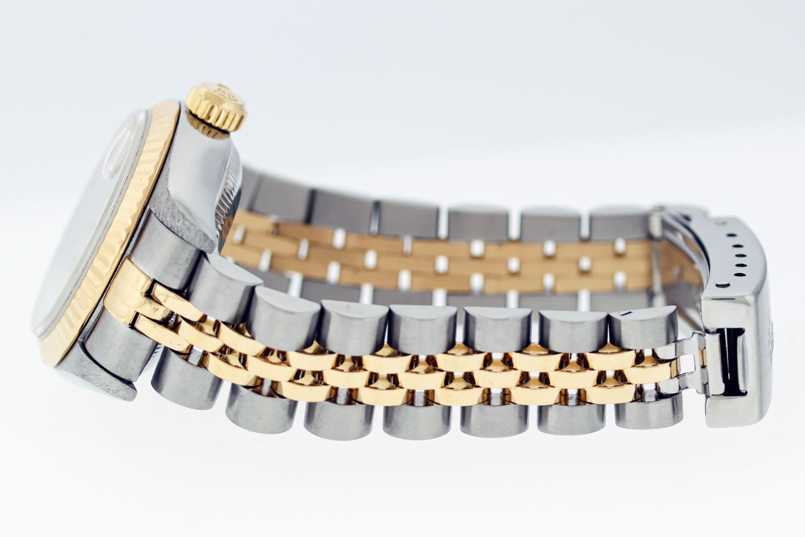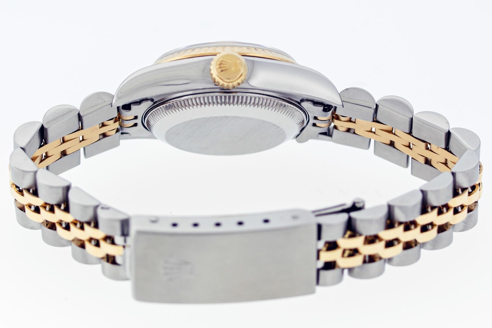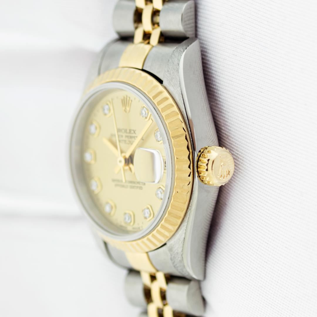 One Ladies Quickset Pre Owned Two Tone 18K Yellow Gold & Stainless Steel Rolex Datejust Polished, Serviced & Electronically Tested, Rolex Yellow Gold & Stainless Steel Case: 26mm, Rolex Yellow Gold Crown, Rolex Bezel: Rolex Yellow Gold Fluted Bezel. Crystal: Sapphire Crystal With Date Window. Hands: Solid Hands. Rolex Movement: Quickset Automatic Winding Movement. Rolex Factory Dial: Champagne With Diamond Hour Markers And Dash Track, Diamond Count: 10 Diamonds In Dial. Date Window: 3 O'Clock Position Date Display, Model: Quickset Datejust. Condition: G-6 Extra Fine. Rolex Bracelet: Two Tone 18K Yellow Gold & Stainless Steel Jubilee Band. Bright Polish. 6.0 Inch Length, Adjustable. Standard Clasp, With Rolex Logo. This Pre Owned Watch Has Been Serviced Time Tested And Is In Excellent Condition It Is Free Of All Scratches And Dents. This Watch Comes With A Rolex Box, Booklets, And Wallet.