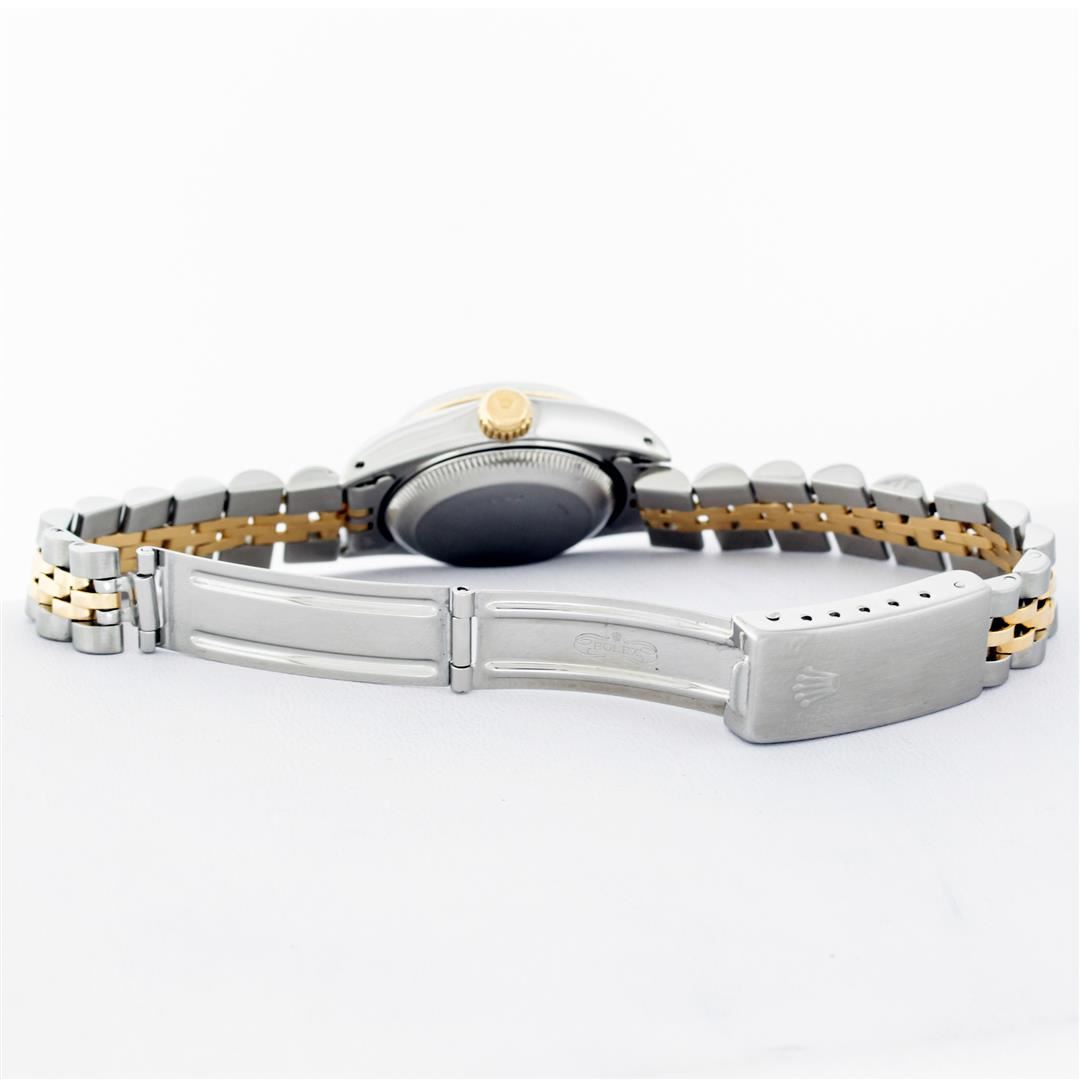 One Ladies Pre Owned Two Tone Rolex Datejust Polished, Serviced & Electronically Tested, Rolex Yellow Gold & Stainless Steel Case: 26mm, Rolex Yellow Gold Crown, Rolex Bezel: Yellow Gold Fluted Bezel. Custom Crystal: New With Cyclops Lens. Custom Hands: New Luminescent Hands. Rolex Movement: Automatic Winding Movement. Rolex Dial: Silver Index Tapestry With Square Track. Date Window: 3 O'Clock Position Date Display, Model: Datejust. Condition: G-6 Extra Fine. Rolex Bracelet: Two Tone Yellow Gold & Stainless Steel Jubilee Band. Bright Polish. 6.0 Inch Length, Adjustable. Standard Clasp, With Rolex Logo. This Watch Has Been Serviced Time Tested And Is In Excellent Condition It Is Free Of All Scratches And Dents.