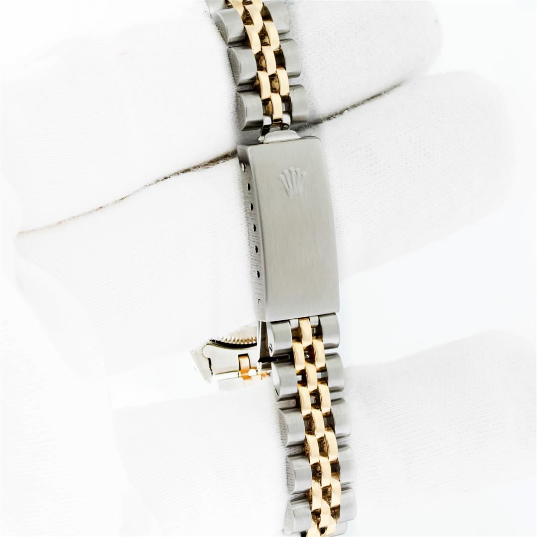 One Ladies Pre Owned Two Tone Rolex Datejust Polished, Serviced & Electronically Tested, Rolex Yellow Gold & Stainless Steel Case: 26mm, Rolex Yellow Gold Crown, Rolex Bezel: Yellow Gold Fluted Bezel. Custom Crystal: New With Cyclops Lens. Custom Hands: New Luminescent Hands. Rolex Movement: Automatic Winding Movement. Rolex Dial: Silver Index Tapestry With Square Track. Date Window: 3 O'Clock Position Date Display, Model: Datejust. Condition: G-6 Extra Fine. Rolex Bracelet: Two Tone Yellow Gold & Stainless Steel Jubilee Band. Bright Polish. 6.0 Inch Length, Adjustable. Standard Clasp, With Rolex Logo. This Watch Has Been Serviced Time Tested And Is In Excellent Condition It Is Free Of All Scratches And Dents.