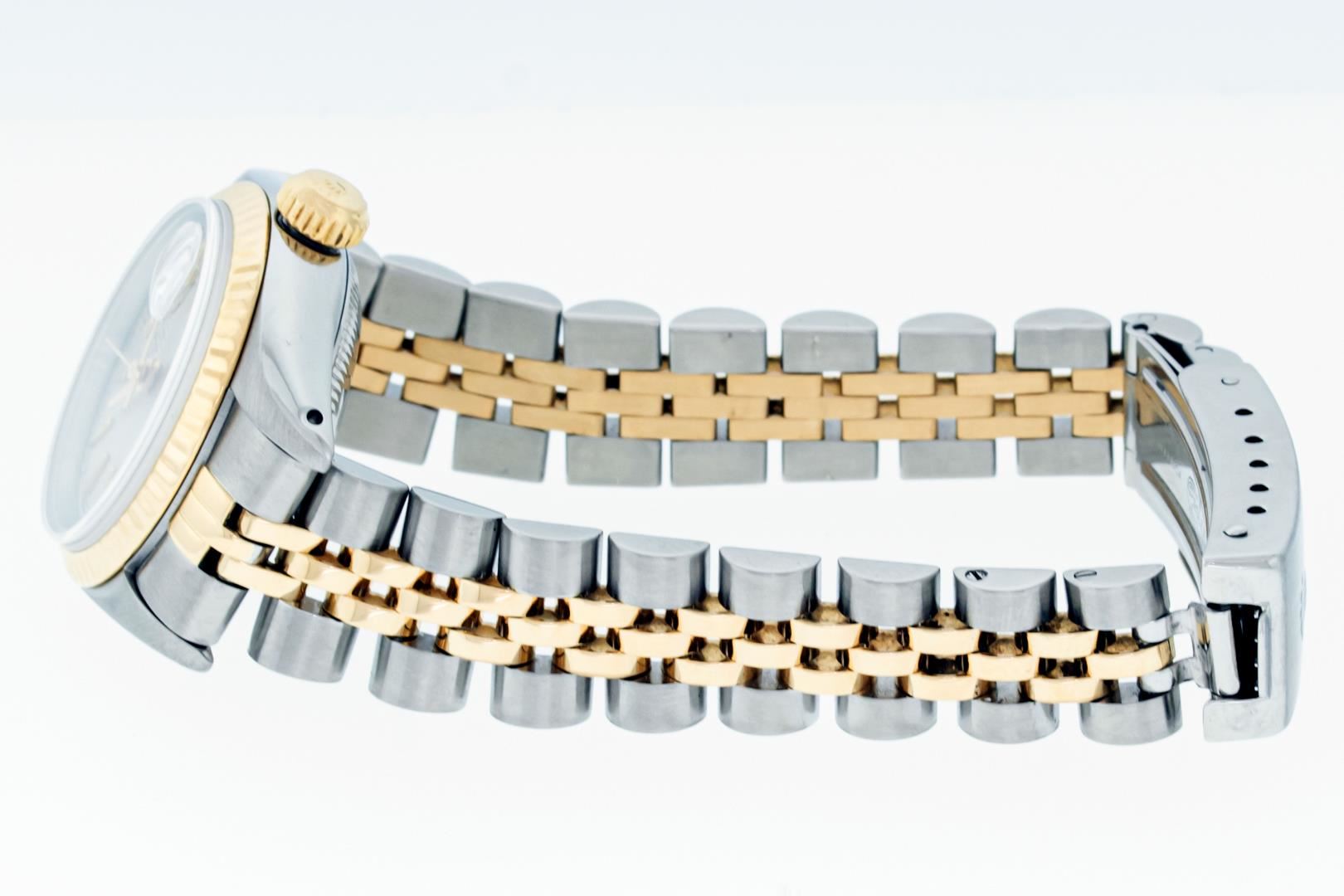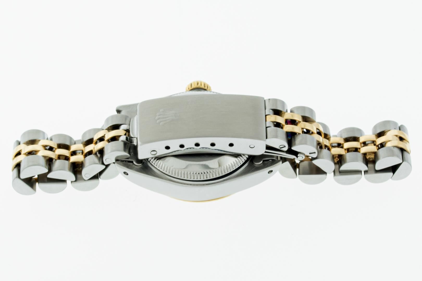 One Ladies Pre Owned 18K Two Tone Rolex Datejust Polished, Serviced & Electronically Tested, Rolex 18K Yellow Gold & Stainless Steel Case: 26mm, Rolex Yellow Gold Crown, Rolex Bezel: 18K Yellow Gold Fluted Bezel. Crystal: Sapphire With Magnified Date Window. Hands: Luminescent Hands. Rolex Movement: Quickset Automatic Winding Movement. Rolex Dial: Silver Index Tapestry With Square Track. Date Window: 3 O'Clock Position Date Display, Model: Quickset Datejust. Condition: G-6 Extra Fine. Rolex Bracelet: Two Tone 18K Yellow Gold & Stainless Steel Jubilee Band. Bright Polish. 6.0 Inch Length, Adjustable. Standard Clasp, With Rolex Logo. This Watch Has Been Serviced Time Tested And Is In Excellent Condition It Is Free Of All Scratches And Dents.