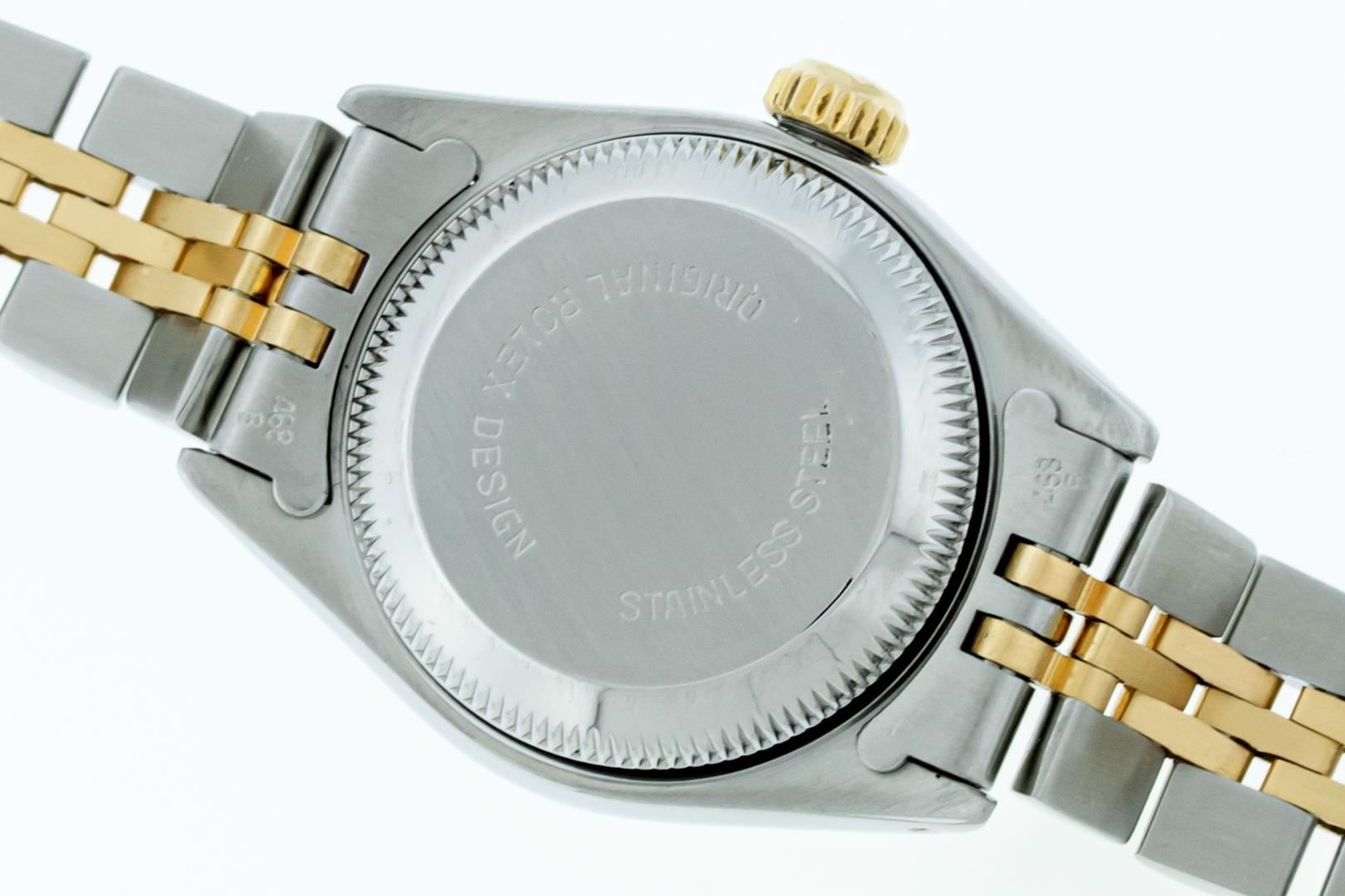 One Ladies Pre Owned 18K Two Tone Rolex Datejust Polished, Serviced & Electronically Tested, Rolex 18K Yellow Gold & Stainless Steel Case: 26mm, Rolex Yellow Gold Crown, Rolex Bezel: 18K Yellow Gold Fluted Bezel. Crystal: Sapphire With Magnified Date Window. Hands: Luminescent Hands. Rolex Movement: Quickset Automatic Winding Movement. Rolex Dial: Silver Index Tapestry With Square Track. Date Window: 3 O'Clock Position Date Display, Model: Quickset Datejust. Condition: G-6 Extra Fine. Rolex Bracelet: Two Tone 18K Yellow Gold & Stainless Steel Jubilee Band. Bright Polish. 6.0 Inch Length, Adjustable. Standard Clasp, With Rolex Logo. This Watch Has Been Serviced Time Tested And Is In Excellent Condition It Is Free Of All Scratches And Dents.