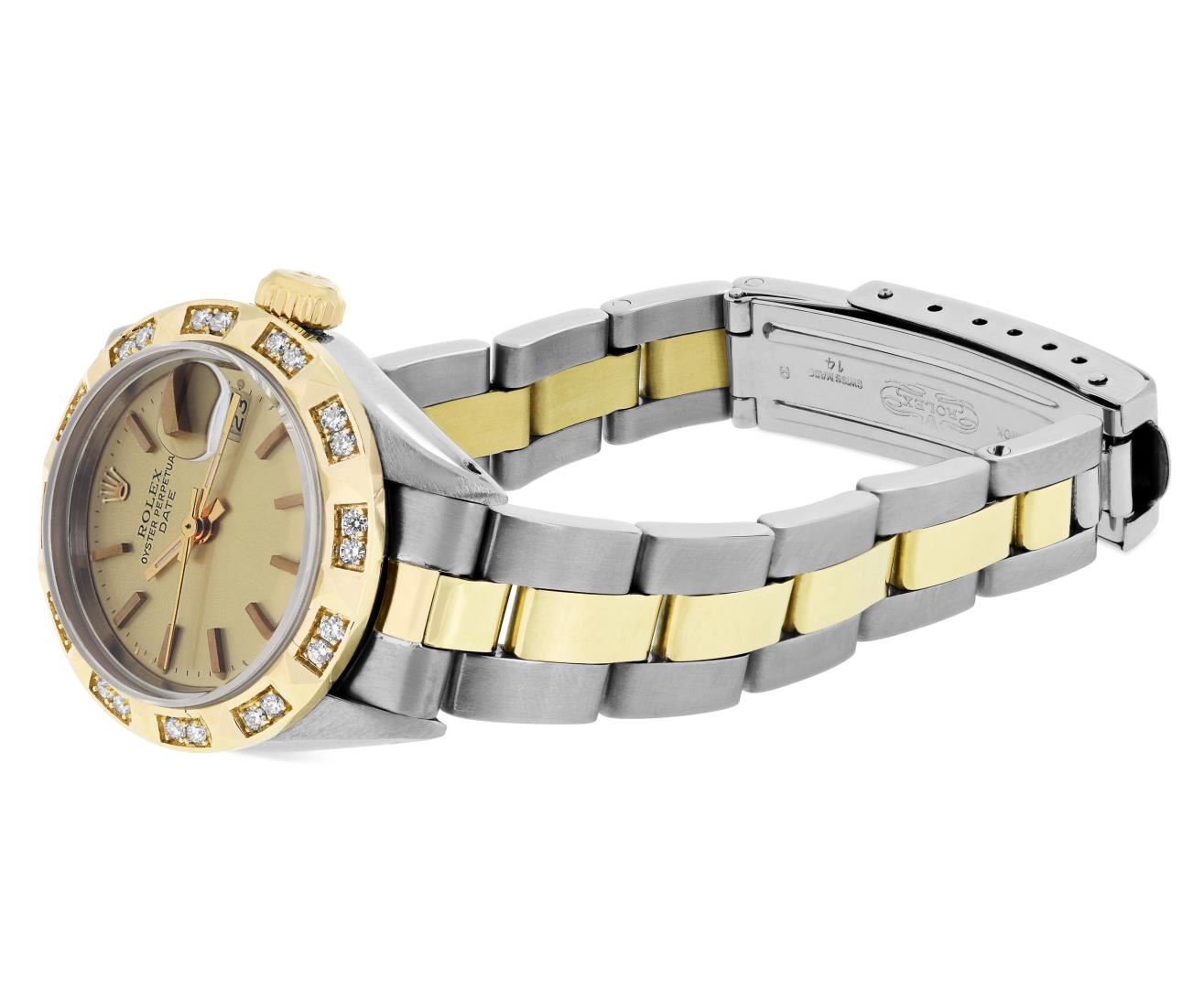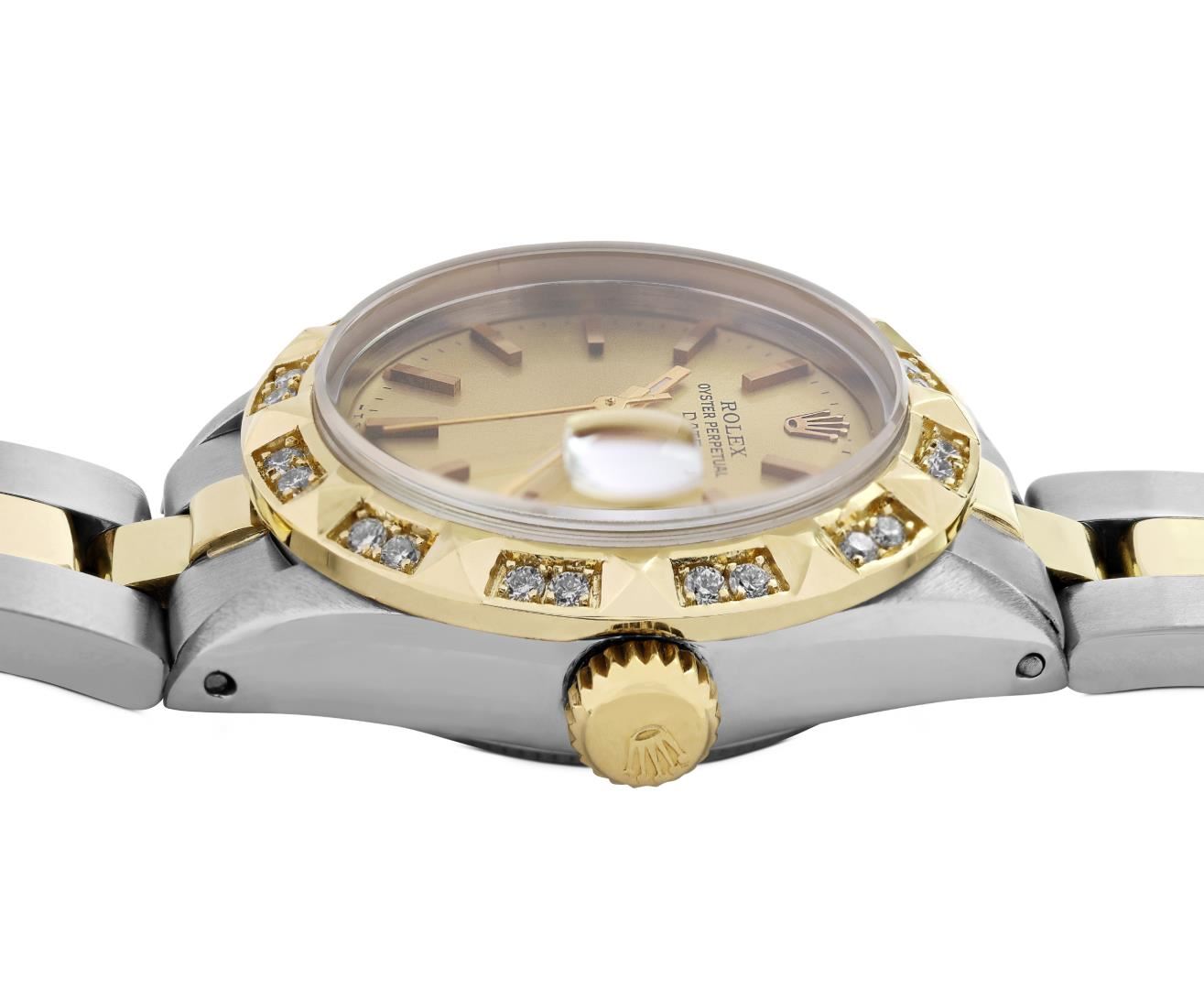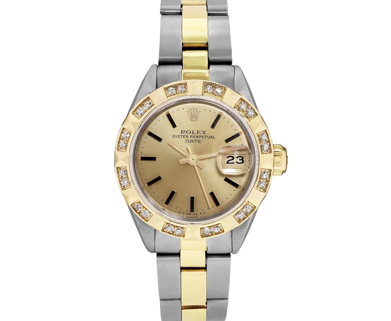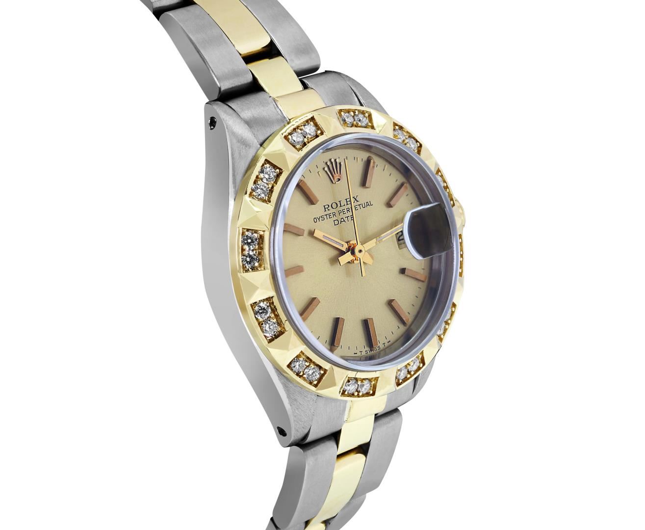One Rolex Ladies Pre Owned Two Tone 14K Yellow Gold And Stainless Steel Rolex Date Polished, Serviced & Electronically Tested, Rolex Yellow Gold And Stainless Steel Case: 26mm, Rolex Yellow Gold Crown. Custom Bezel: New 18K Yellow Gold Pyramid Diamond Bezel, Diamond Count: 24 Diamonds On Bezel. Crystal: Sapphire Crystal With Date Window. Hands: Luminescent Hands. Rolex Movement: Automatic Winding Movement 2035. Rolex Factory Dial: Champagne With Index Hour Markers And Dash Track. Date Window: 3 O'Clock Position Date Display, Condition: G-6 Extra Fine. Rolex Bracelet: Two Tone 14K Yellow Gold And Stainless Steel Oyster Band. Bright Polish. 6.0 Inch Length, Adjustable. Standard Clasp, With Rolex Logo. This Watch Has Been Serviced Time Tested And Is In Excellent Condition It Is Free Of All Scratches And Dents. This Watch Comes With A Rolex Box.