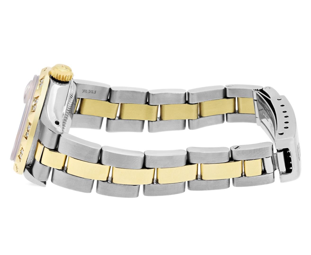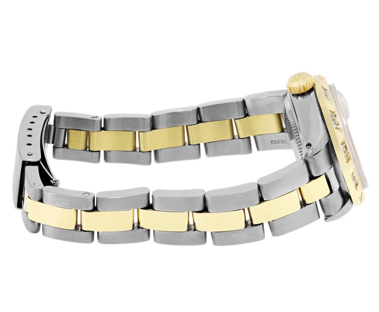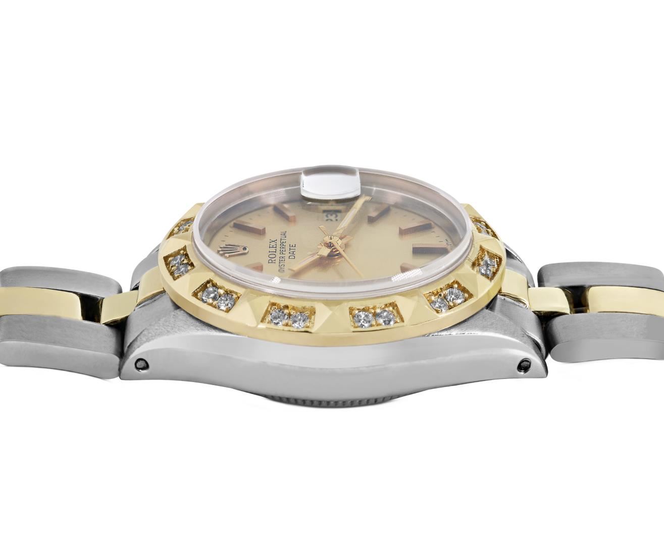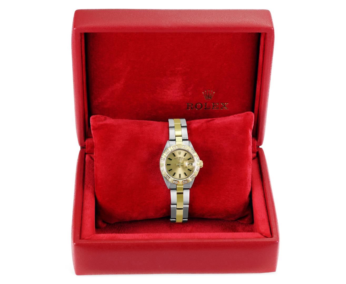 One Rolex Ladies Pre Owned Two Tone 14K Yellow Gold And Stainless Steel Rolex Date Polished, Serviced & Electronically Tested, Rolex Yellow Gold And Stainless Steel Case: 26mm, Rolex Yellow Gold Crown. Custom Bezel: New 18K Yellow Gold Pyramid Diamond Bezel, Diamond Count: 24 Diamonds On Bezel. Crystal: Sapphire Crystal With Date Window. Hands: Luminescent Hands. Rolex Movement: Automatic Winding Movement 2035. Rolex Factory Dial: Champagne With Index Hour Markers And Dash Track. Date Window: 3 O'Clock Position Date Display, Condition: G-6 Extra Fine. Rolex Bracelet: Two Tone 14K Yellow Gold And Stainless Steel Oyster Band. Bright Polish. 6.0 Inch Length, Adjustable. Standard Clasp, With Rolex Logo. This Watch Has Been Serviced Time Tested And Is In Excellent Condition It Is Free Of All Scratches And Dents. This Watch Comes With A Rolex Box.
