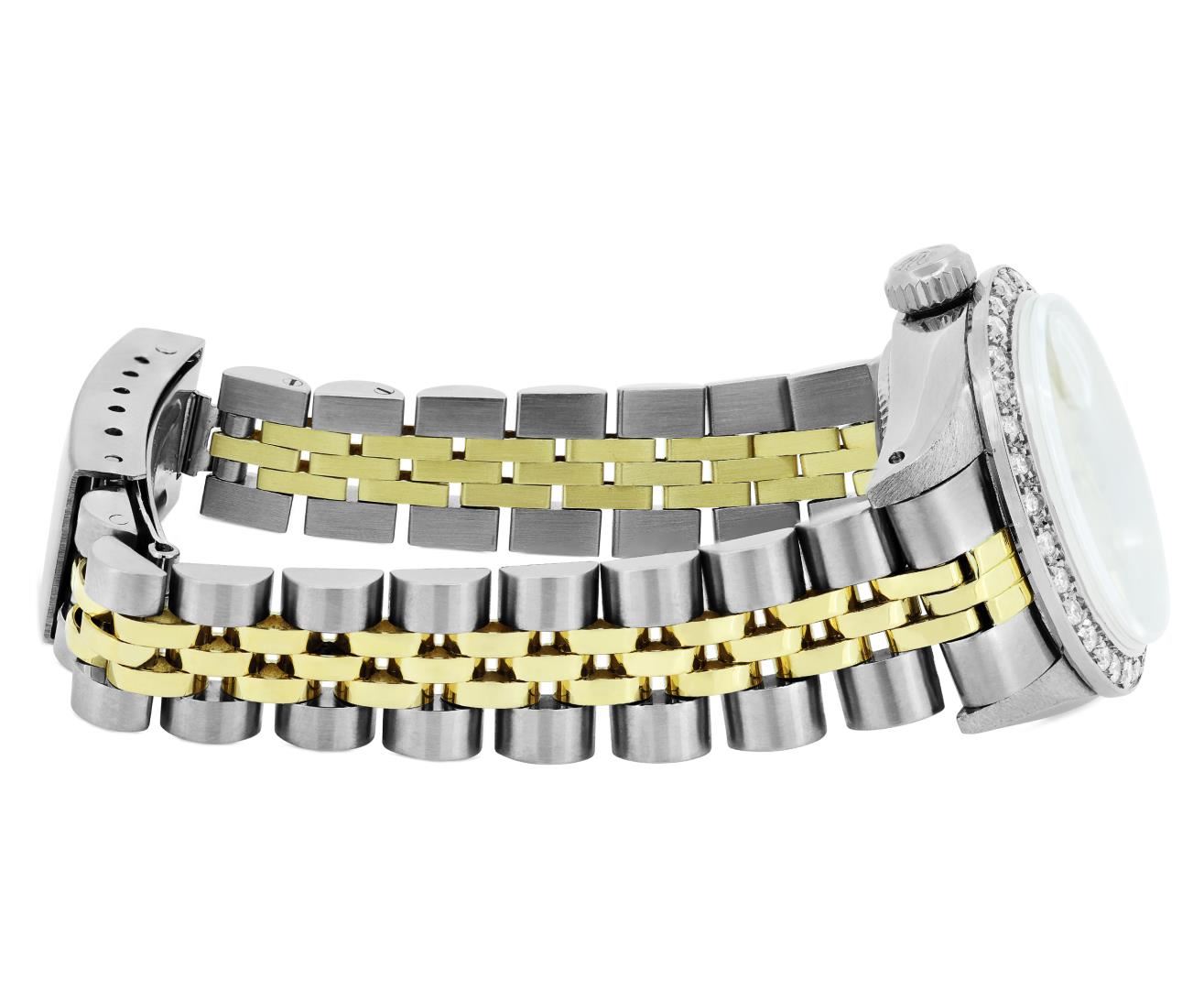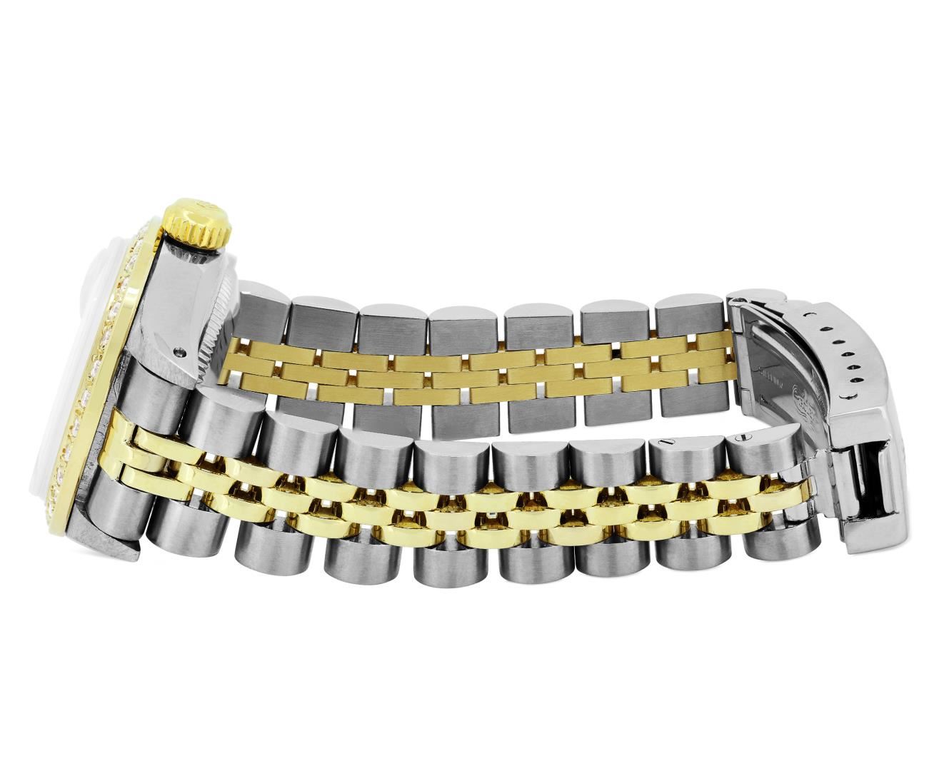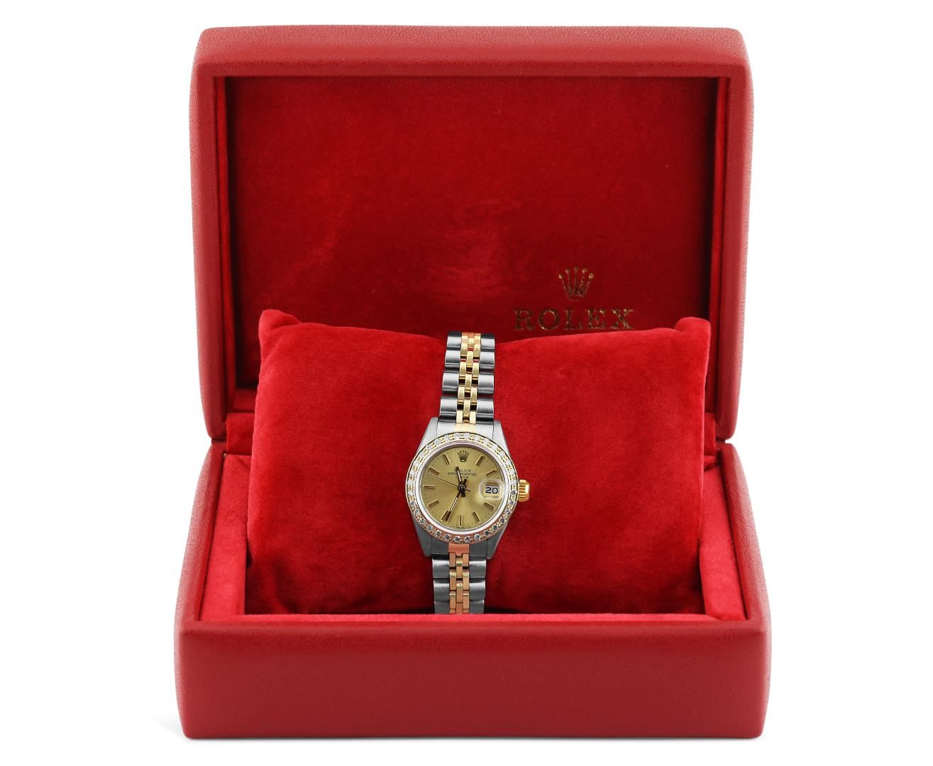 One Rolex Ladies Pre Owned Two Tone Yellow Gold And Stainless Steel Rolex Date Polished, Serviced & Electronically Tested, Rolex Yellow Gold And Stainless Steel Case: 26mm, Rolex Yellow Gold Crown. Custom Bezel: New 18K Yellow Gold Beadset Diamond Bezel, Diamond Count: 32 Diamonds On Bezel. Custom Crystal: Sapphire Crystal With Date Window. Custom Hands: Luminescent Hands. Rolex Movement: Automatic Winding Movement 2035. Rolex Factory Dial: Champagne With Index Hour Markers And Dash Track. Date Window: 3 O'Clock Position Date Display, Condition: G-6 Extra Fine. Rolex Bracelet: Two Tone 18K Yellow Gold And Stainless Steel Jubilee Band. Bright Polish & Satin Finish. 6.0 Inch Length, Adjustable. Standard Clasp, With Rolex Logo. This Watch Has Been Serviced Time Tested And Is In Excellent Condition It Is Free Of All Scratches And Dents. This Watch Comes With A Rolex Box.