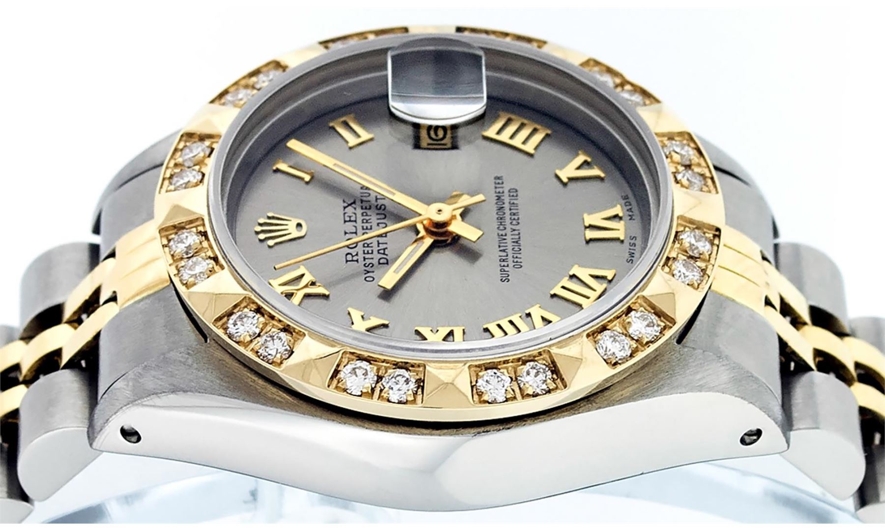 One Ladies Pre Owned 14K Two Tone Yellow Gold & Stainless Steel Rolex Polished, Serviced & Electronically Tested, 14K Yellow Gold & Stainless Steel Case: 26mm, Yellow Gold Crown, Custom Bezel: New 18K Yellow Gold Pyramid Diamond Bezel, Diamond Count: 24 Diamonds In Bezel. Total Weight .50 Carat, Clarity: SI-VS, Color: G to H. Custom Crystal: New Sapphire With Magnified Date Window. Custom Hands: New Luminescent Hands. Rolex Movement: Automatic Winding Movement 2030. Custom Dial: Slate Grey With Roman Hour Markers. Date Window: 3 O'Clock Position Date Display, Model: Datejust. Condition: G-6 Extra Fine The Watch Is In Very Good Condition Free Of All Scratches And Dents. Bracelet: Two Tone 14K Yellow Gold & Stainless Steel Jubilee. Bright Polish. 6.0 Inch Length, Adjustable. Standard Clasp, With Rolex Logo. This Watch Has Been Serviced Time Tested And Is In Excellent Condition It Is Free Of All Scratches And Dents.