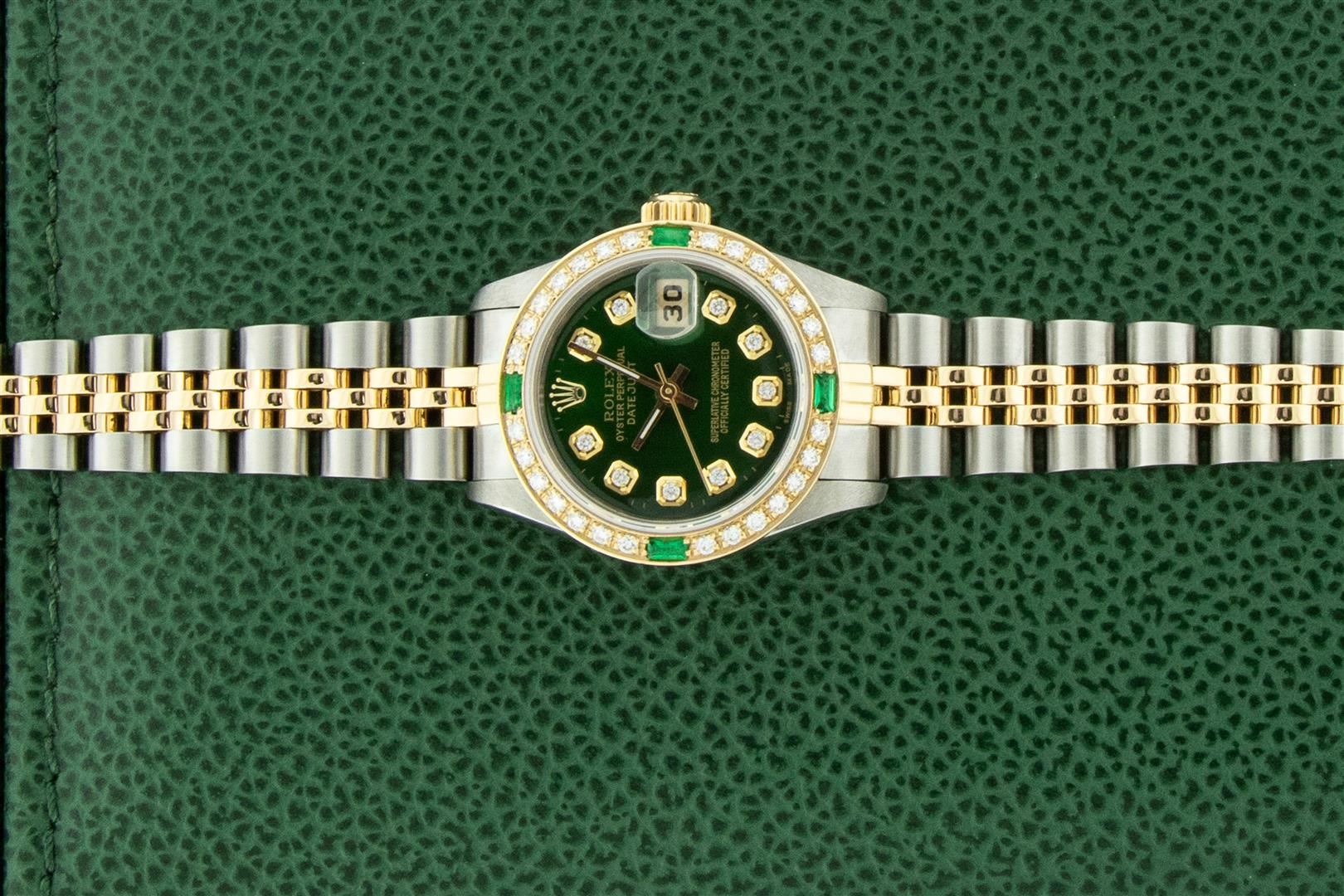 One Ladies Two Tone Rolex Datejust Polished, Serviced & Electronically Tested, Rolex Yellow Gold & Stainless Steel Case: 26mm, Rolex Yellow Gold Crown, Custom Bezel: New 18K Yellow Gold Emerald Beadset Diamond Bezel, Diamond + Gem Count: 28 Diamonds + 4 Emeralds Total Weight .70 Carat, Clarity: SI-VS, Color: G to H. Custom Crystal: New Sapphire With Magnified Date Window. Custom Hands: New Luminescent Hands. Rolex Movement: Automatic Winding Movement. Custom Dial: Refinished To Green With Added Diamond Hour Markers, Diamond Count: 10 Diamonds in Dial, G To H In Color, SI-VS Clarity. Date Window: 3 O'clock Position Date Display, Model: Datejust, Condition: G-6 Extra Fine. Rolex Bracelet: Two Tone Yellow Gold & Stainless Steel Jubilee Band. Bright Polish. 6.0 Inch Length, Adjustable. Standard Clasp, With Rolex Logo. This Pre Owned Watch Has Been Serviced Time Tested And Is In Excellent Condition It Is Free Of All Scratches And Dents. This Watch Comes With A Rolex Box.