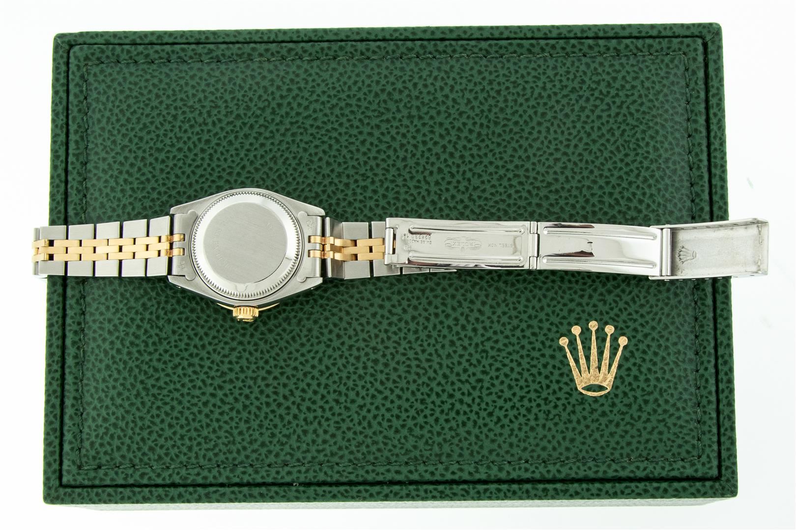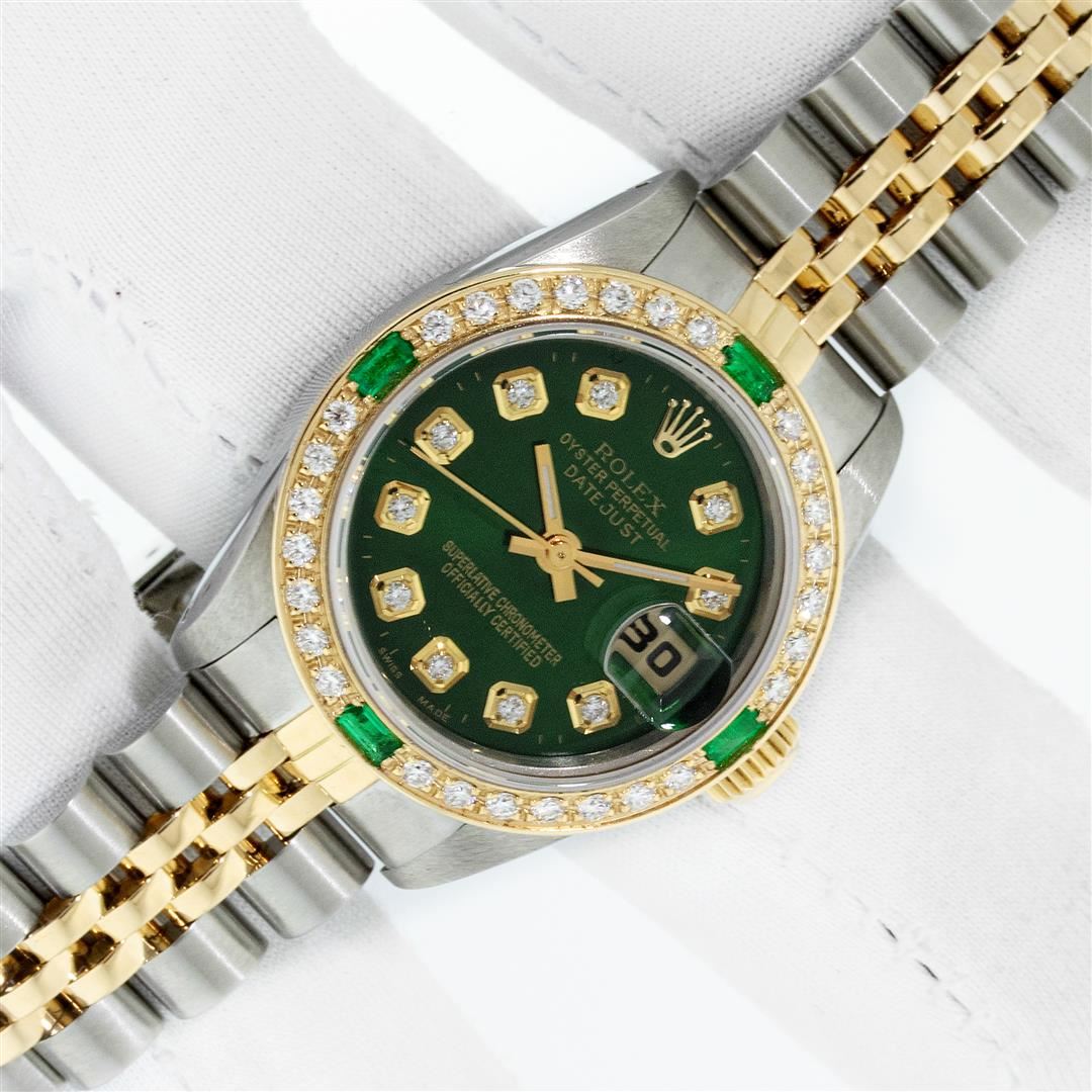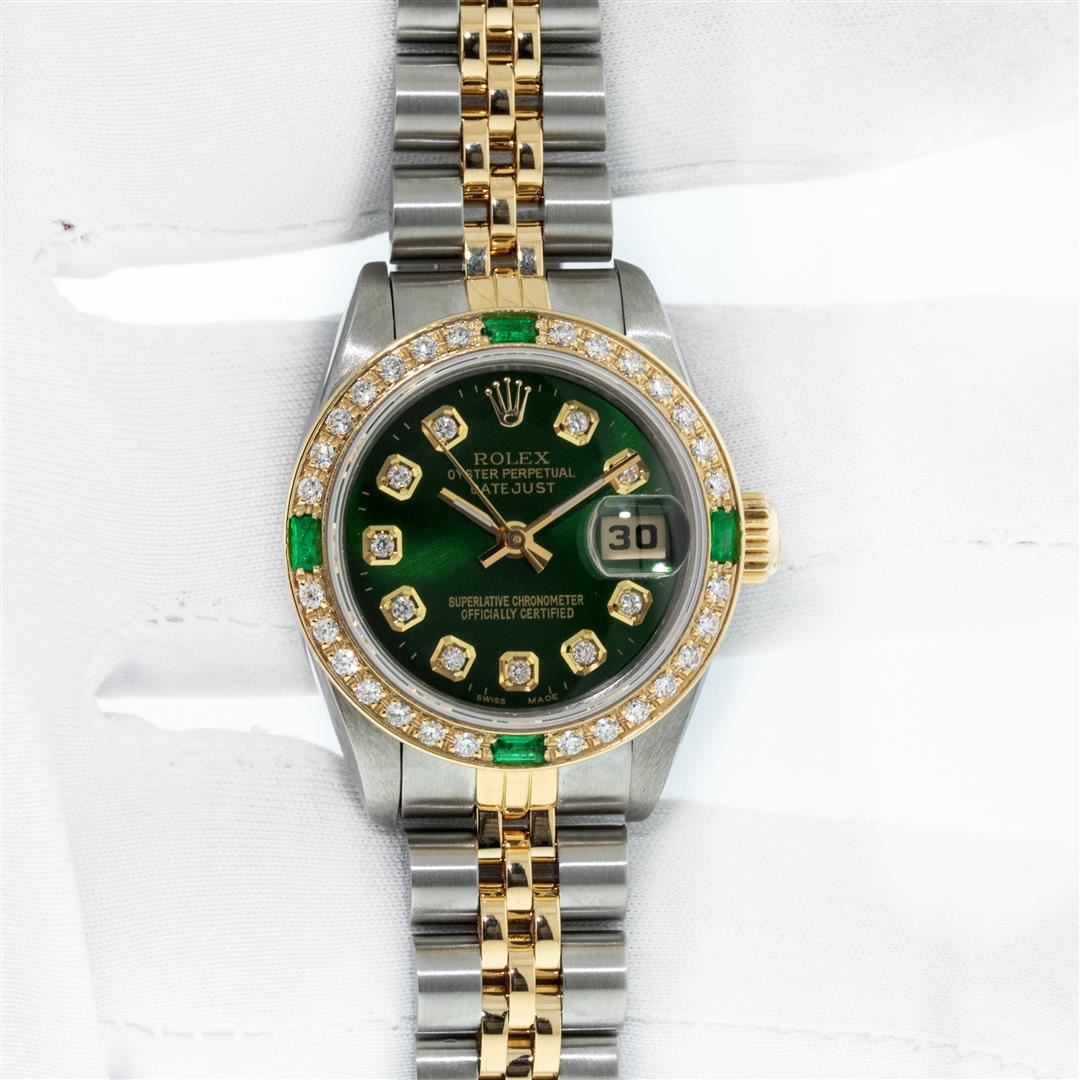 One Ladies Two Tone Rolex Datejust Polished, Serviced & Electronically Tested, Rolex Yellow Gold & Stainless Steel Case: 26mm, Rolex Yellow Gold Crown, Custom Bezel: New 18K Yellow Gold Emerald Beadset Diamond Bezel, Diamond + Gem Count: 28 Diamonds + 4 Emeralds Total Weight .70 Carat, Clarity: SI-VS, Color: G to H. Custom Crystal: New Sapphire With Magnified Date Window. Custom Hands: New Luminescent Hands. Rolex Movement: Automatic Winding Movement. Custom Dial: Refinished To Green With Added Diamond Hour Markers, Diamond Count: 10 Diamonds in Dial, G To H In Color, SI-VS Clarity. Date Window: 3 O'clock Position Date Display, Model: Datejust, Condition: G-6 Extra Fine. Rolex Bracelet: Two Tone Yellow Gold & Stainless Steel Jubilee Band. Bright Polish. 6.0 Inch Length, Adjustable. Standard Clasp, With Rolex Logo. This Pre Owned Watch Has Been Serviced Time Tested And Is In Excellent Condition It Is Free Of All Scratches And Dents. This Watch Comes With A Rolex Box.