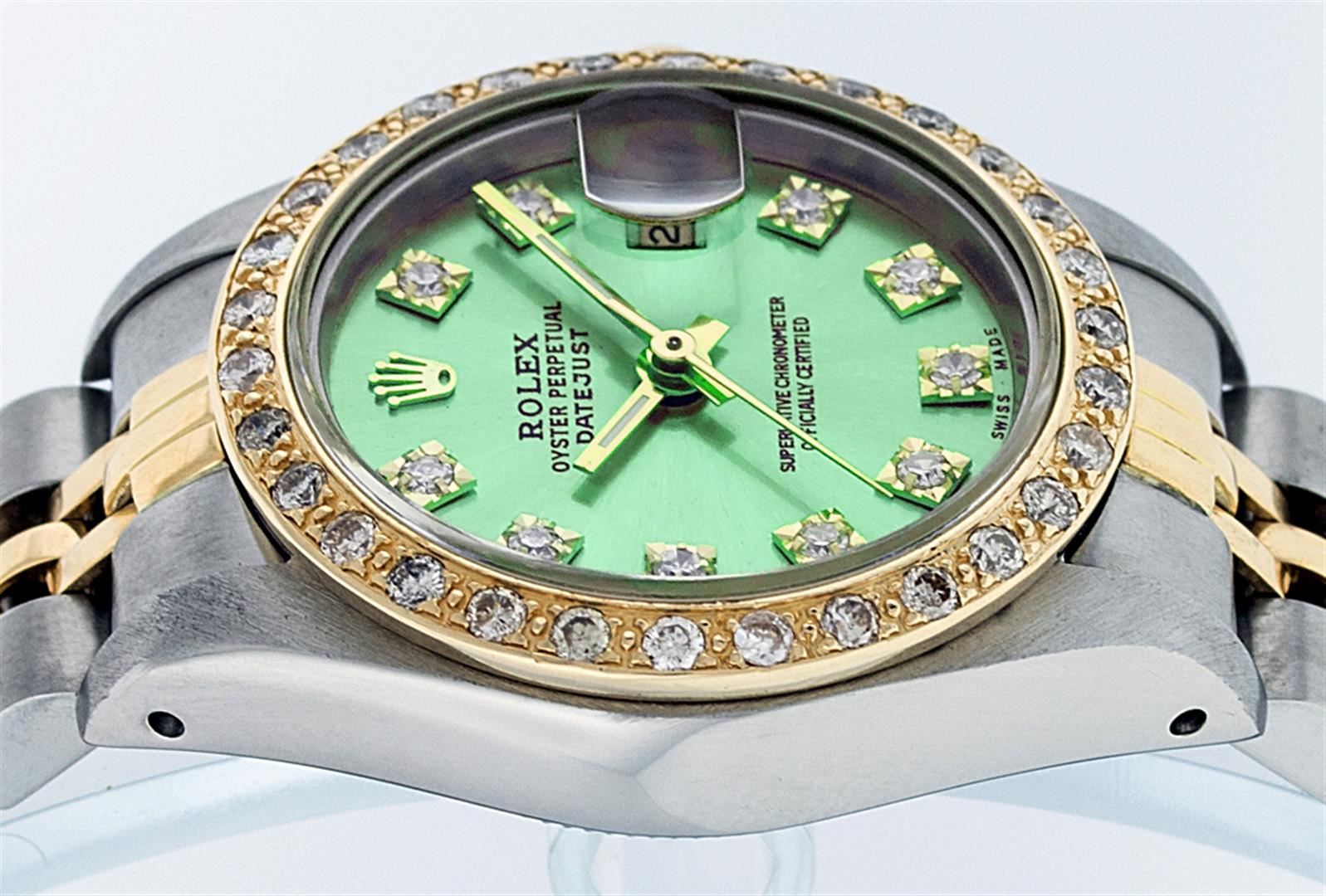 One Ladies Two Tone Rolex Datejust Polished, Serviced & Electronically Tested, 14K Yellow Gold & Stainless Steel Case:26mm, 14K Yellow Gold Crown, Custom Bezel: 18K Yellow Gold Beadset Diamond Bezel, Diamond Count: 32 Diamonds. Total Weight .70 Carat, Clarity: Si-VS, Color: G to H. Custom Crystal: Synthetic Sapphire Cyclops Lens. Movement: Automatic Winding Movement Caliber 2030. Custom Dial: Ice Green Single Cut VS Diamond Dial. Stone Count: 10 Diamonds In Dial, Clarity: VS, Color: G to H. Date Window: 3 O'Clock Position Date Display, Model: Datejust. Condition: G-6 Extra Fine. Bracelet: Two Tone 14K Yellow Gold & Stainless Steel Jubilee Band. Bright Polish. 6.0 Inch Length, Adjustable. Standard Clasp, With Rolex Logo.