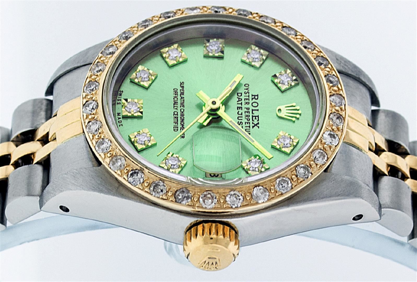 One Ladies Two Tone Rolex Datejust Polished, Serviced & Electronically Tested, 14K Yellow Gold & Stainless Steel Case:26mm, 14K Yellow Gold Crown, Custom Bezel: 18K Yellow Gold Beadset Diamond Bezel, Diamond Count: 32 Diamonds. Total Weight .70 Carat, Clarity: Si-VS, Color: G to H. Custom Crystal: Synthetic Sapphire Cyclops Lens. Movement: Automatic Winding Movement Caliber 2030. Custom Dial: Ice Green Single Cut VS Diamond Dial. Stone Count: 10 Diamonds In Dial, Clarity: VS, Color: G to H. Date Window: 3 O'Clock Position Date Display, Model: Datejust. Condition: G-6 Extra Fine. Bracelet: Two Tone 14K Yellow Gold & Stainless Steel Jubilee Band. Bright Polish. 6.0 Inch Length, Adjustable. Standard Clasp, With Rolex Logo.