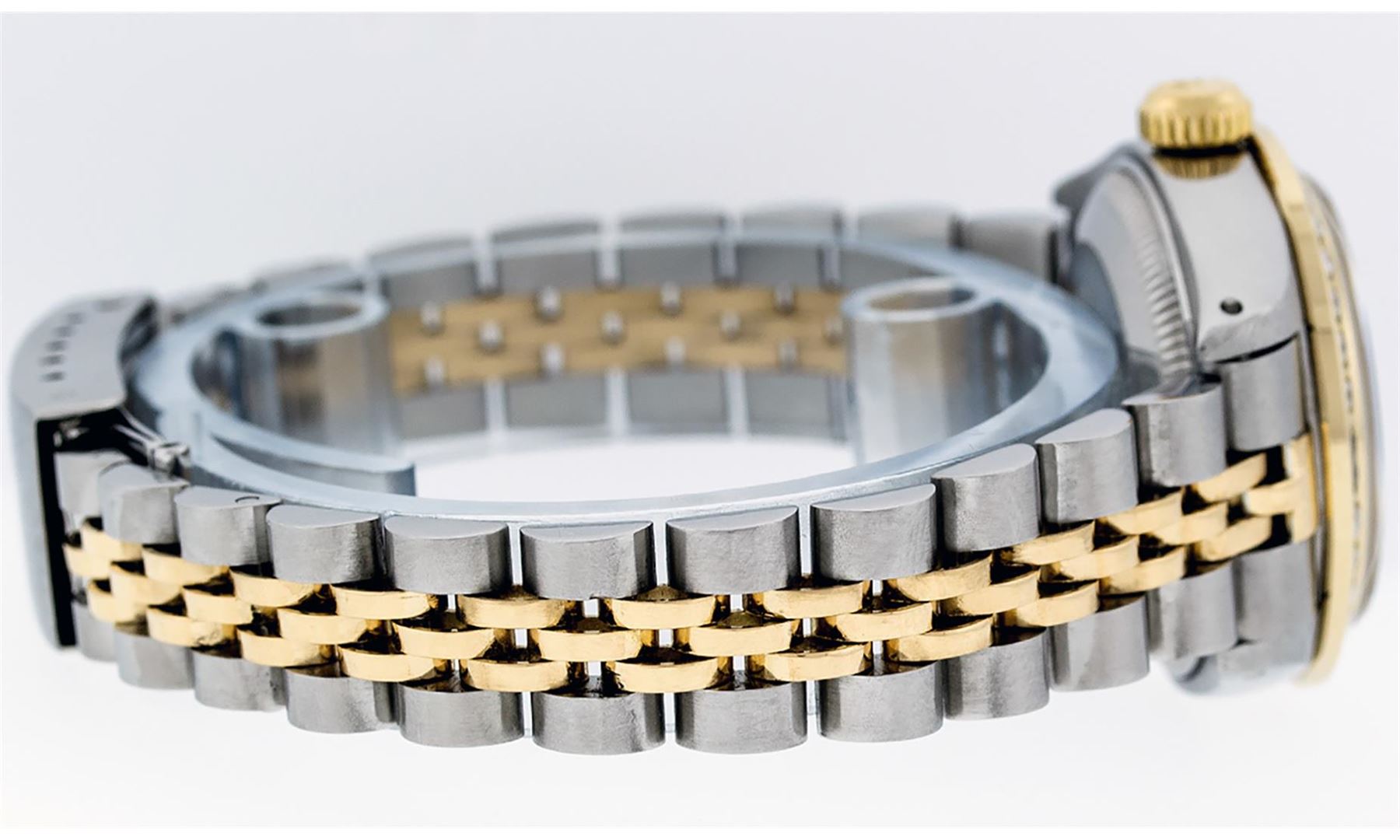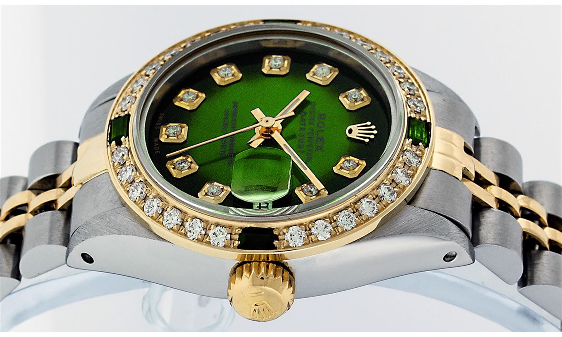One Ladies 14K Two Tone Rolex Datejust Polished, Serviced & Electronically Tested, 14K Yellow Gold & Stainless Steel Case: 26mm, 14K Yellow Gold Crown, Custom Bezel: New 18K Yellow Gold Emerald Beadset Diamond Bezel, Diamond + Gem Count: 28 Diamonds + 4 Emeralds, Total Weight .70 Carat, Clarity: SI-VS, Color: G to H. Custom Crystal: New Synthetic Sapphire Cyclops Lens. Custom Hands: New Luminescent Hands. Movement: Automatic Winding Movement Caliber 2030. Custom Dial: Green Vignette Dial Set With Diamond Hour Markers, Diamond Count: 10 Diamond in Dial, G To H In Color, SI-VS Clarity. Date Window: 3 O'clock Position Date Display, Model: Datejust, Condition: G-6 Extra Fine. Bracelet: Two Tone 14K Yellow Gold & Stainless Steel Jubilee. Bright Polish. 6.0 Inch Length, Adjustable. Standard Clasp, With Rolex Logo. This Watch Has Been Serviced Time Tested And Is In Excellent Condition It Is Free Of All Scratches And Dents.