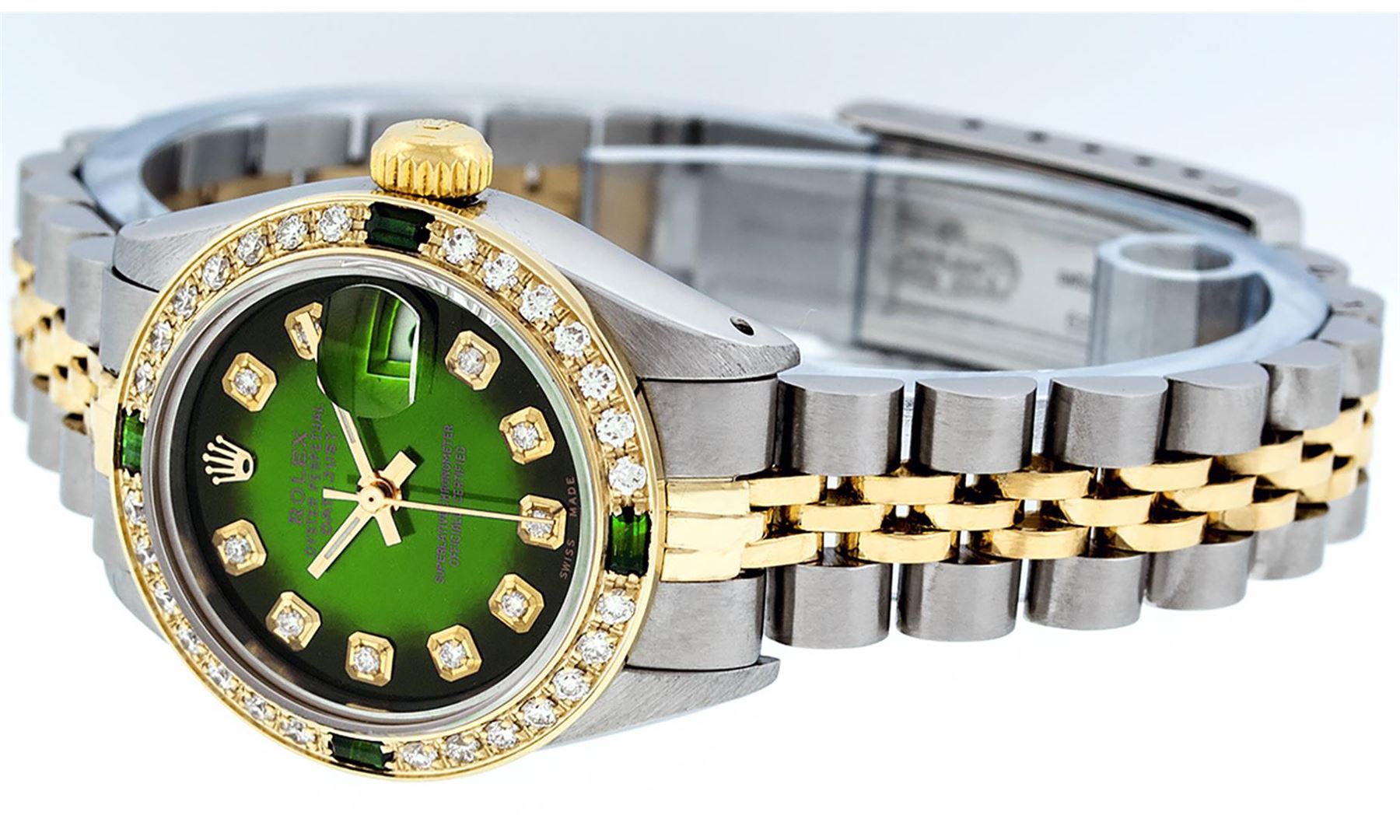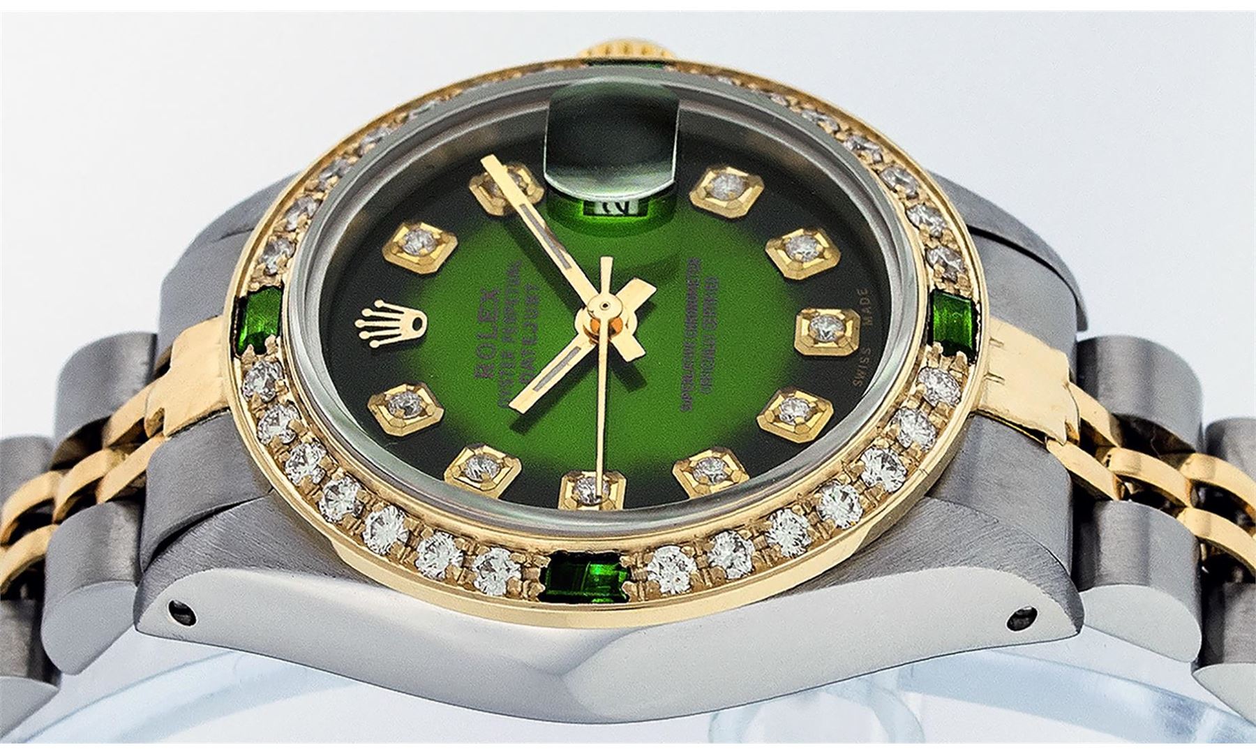 One Ladies Two Tone Rolex Datejust Polished, Serviced & Electronically Tested, Yellow Gold & Stainless Steel Case: 26mm, Yellow Gold Crown, Custom Bezel: New 18K Yellow Gold Synthetic Emerald Beadset Diamond Bezel, Diamond + Gem Count: 28 Diamonds + 4 Emeralds, Total Weight .70 Carat, Clarity: SI-VS, Color: G to H. Custom Crystal: New Synthetic Sapphire Cyclops Lens. Custom Hands: New Luminescent Hands. Movement: Automatic Winding Movement. Custom Dial: Green Vignette Dial Set With Diamond Hour Markers, Diamond Count: 10 Diamond in Dial, G To H In Color, SI-VS Clarity. Date Window: 3 O'clock Position Date Display, Model: Datejust, Condition: G-6 Extra Fine. Bracelet: Two Tone Yellow Gold & Stainless Steel Jubilee. Bright Polish. 6.0 Inch Length, Adjustable. Standard Clasp, With Rolex Logo. This Watch Has Been Serviced Time Tested And Is In Excellent Condition It Is Free Of All Scratches And Dents.