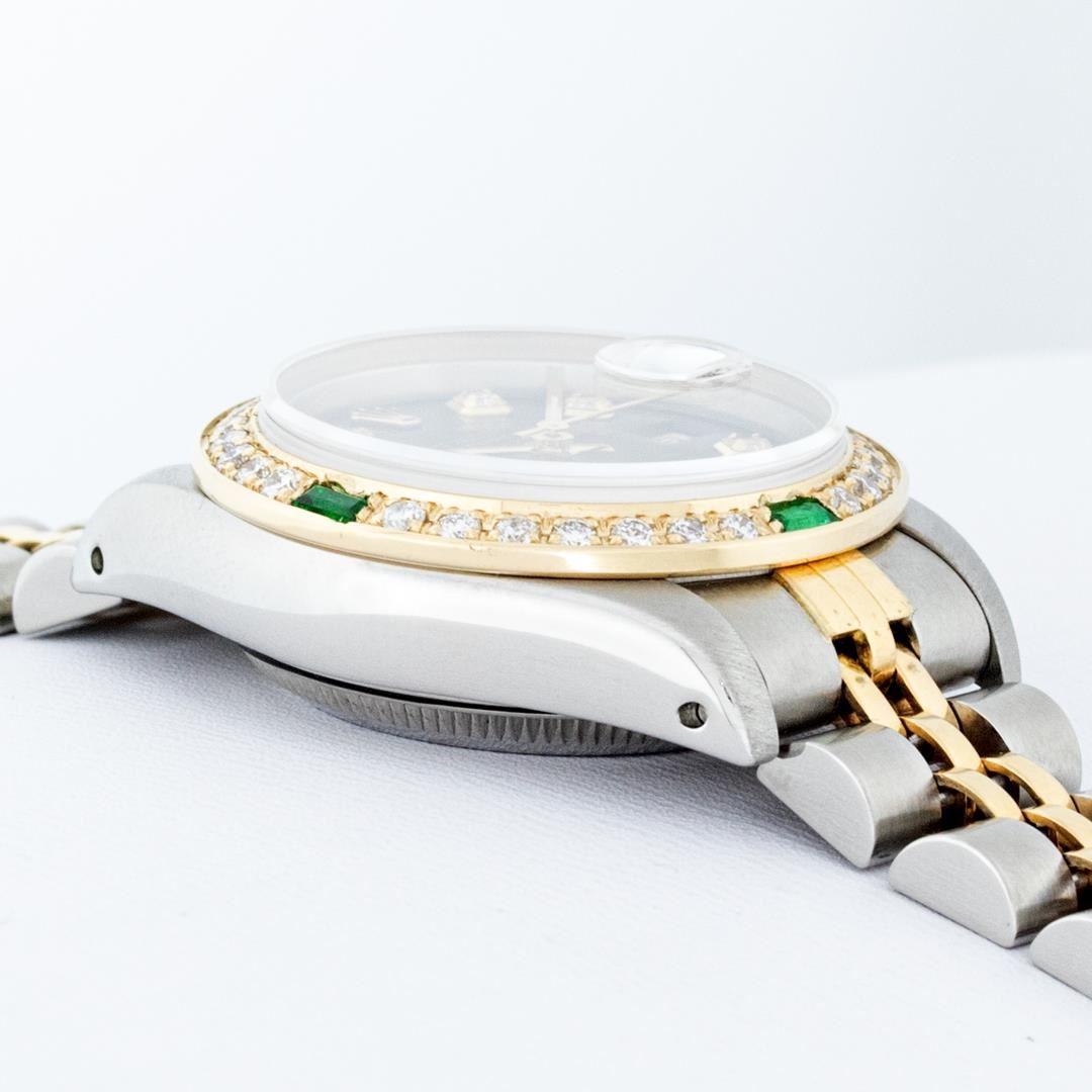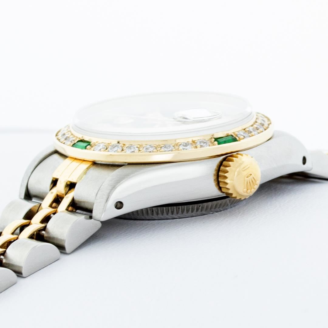 One Ladies Pre Owned Quickset Two Tone 18K Yellow Gold And Stainless Steel Rolex Datejust Polished, Serviced And Electronically Tested, Yellow Gold And Stainless Steel Case: 26mm, Yellow Gold Crown, Custom Bezel: New 18K Yellow Gold Emerald Beadset Diamond Bezel, Diamond + Gem Count: 28 Diamonds + 4 Emeralds. Custom Crystal: New Sapphire With Date Window. Custom Hands: New Luminescent Hands. Rolex Movement: Automatic Winding Movement 2135. Custom Dial: Custom Green Vignette Dial With Added Diamond Hour Markers, Diamond Count: 10 Diamond in Dial. Date Window: 3 O'Clock Position Date Display, Model: Quickset Datejust, Condition: G-6 Extra Fine. Rolex Bracelet: Two Tone Yellow Gold And Stainless Steel Jubilee Band. Bright Polish. 6.0 Inch Length, Adjustable. Standard Clasp, With Rolex Logo. This Watch Has Been Serviced Time Tested And Is In Excellent Condition It Is Free Of All Scratches And Dents.