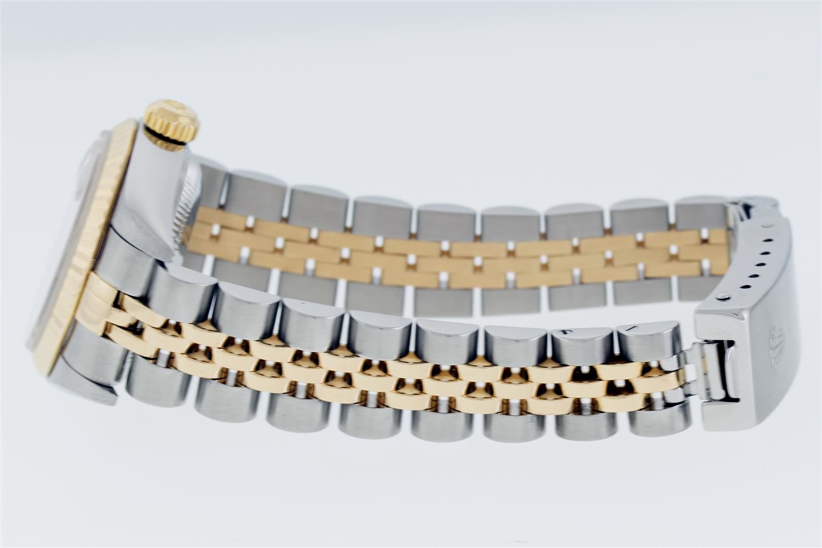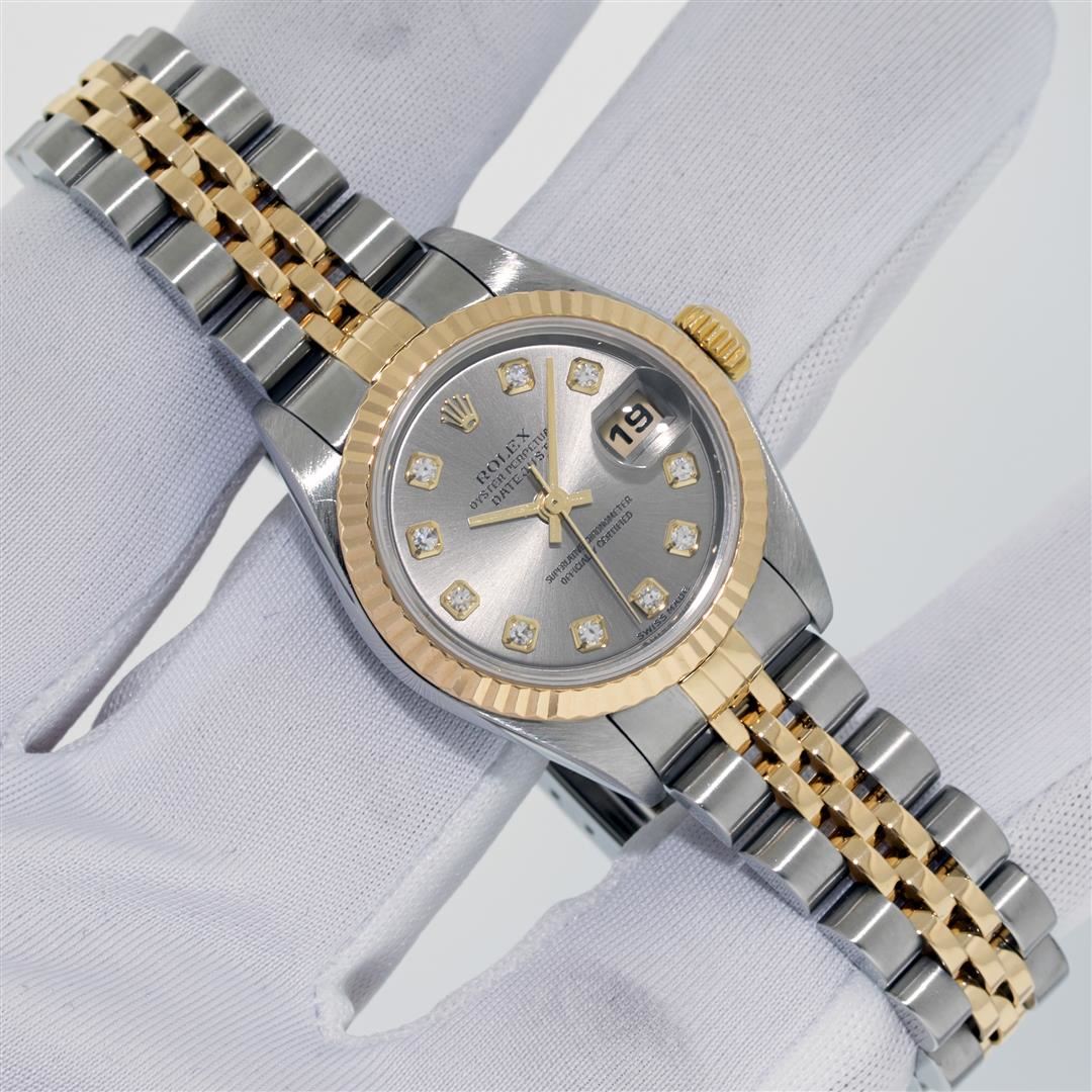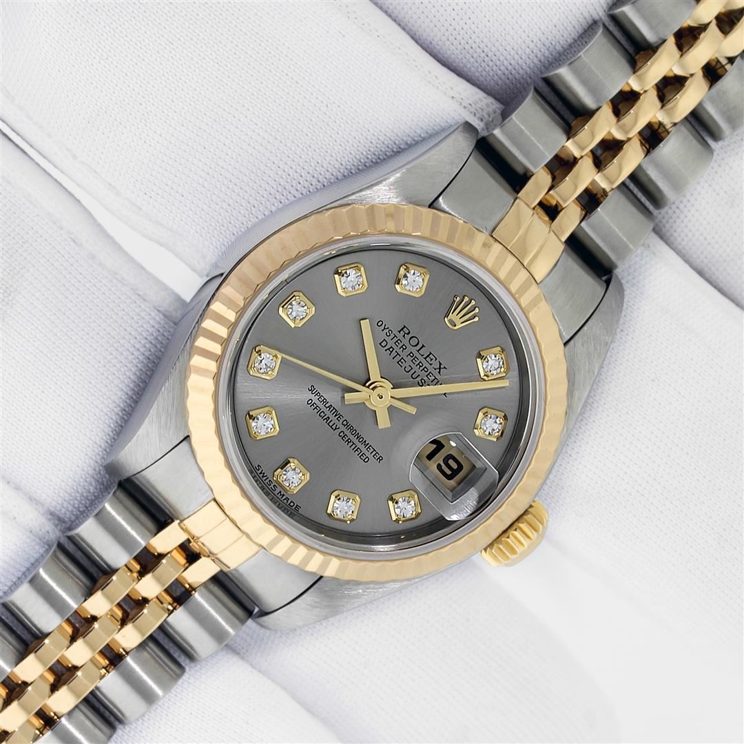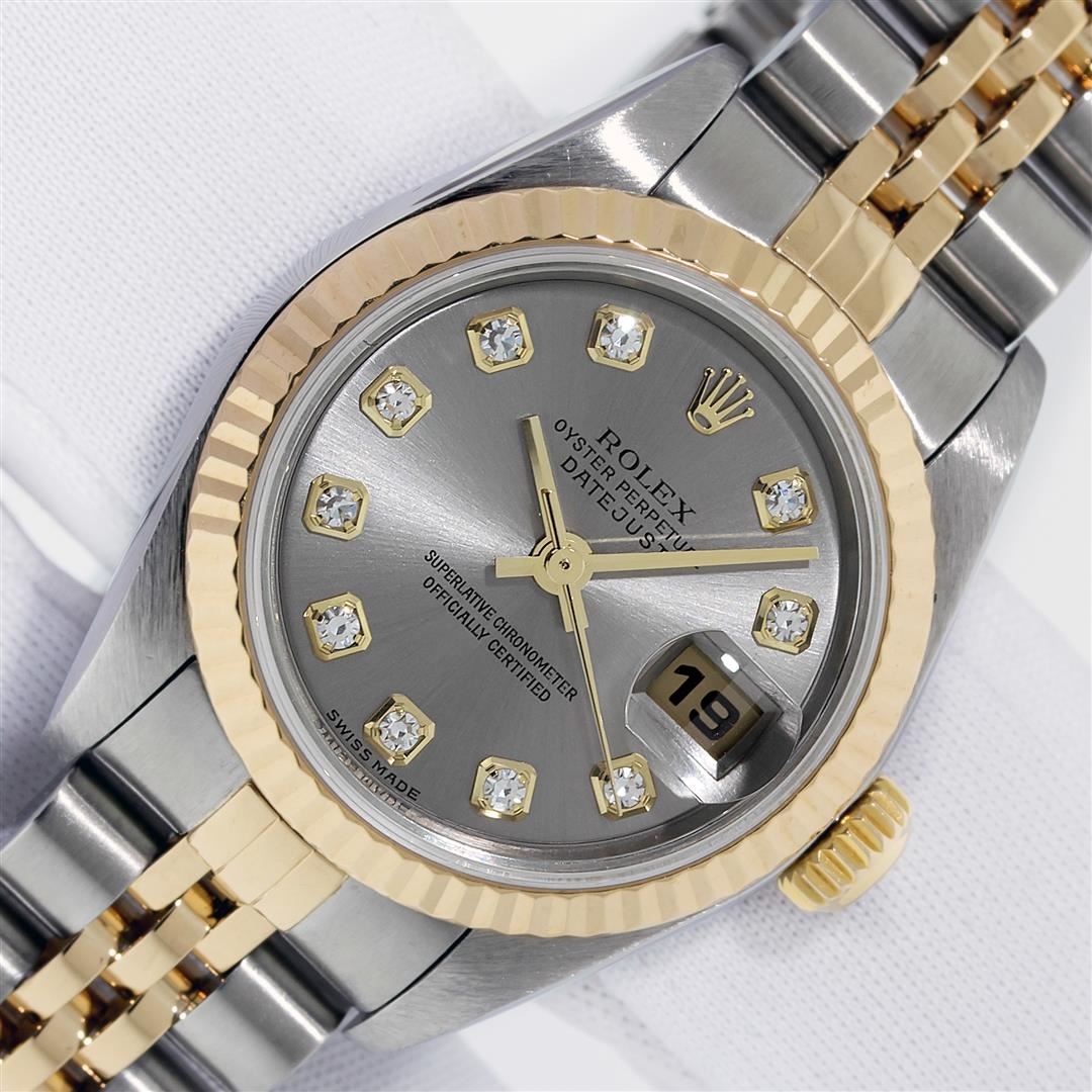 Rolex Ladies Sapphire Quickset 18K Yellow Gold and Stainless Steel Two Tone Wristwatch Polished Bright with Satin Finish, Serviced & Electronically Tested, Stainless Steel Case: 26mm, 18K Yellow Gold Crown, Bezel: Original Rolex 18K Yellow Gold Fluted Bezel. Custom Crystal: New Sapphire With Date Window. Custom Hands: New luminous hands. Movement: Automatic Quickset Winding Movement 2135. Custom Dial: Refinished To Gray With Custom Added Diamonds, Diamond Count: 10 Diamonds In Dial, Clarity: VS, Date Window: 3 O'Clock Position Date Display, Model: Quickset Datejust Quickset Sapphire 79173, Condition: G-6 Extra Fine. Rolex Bracelet: Stainless Steel and 18K Yellow Gold Jubilee Band. Bright Polish & Satin Finish. 6.0 Inch Length, Adjustable. Standard Clasp, With Rolex Logo. This Watch Has Been Serviced Time Tested And Is In Excellent Condition It Is Free Of All Scratches And Dents.