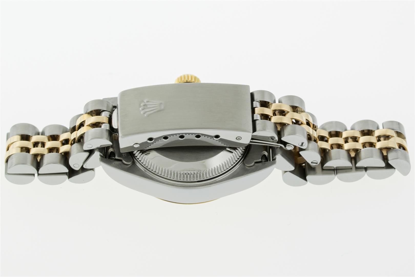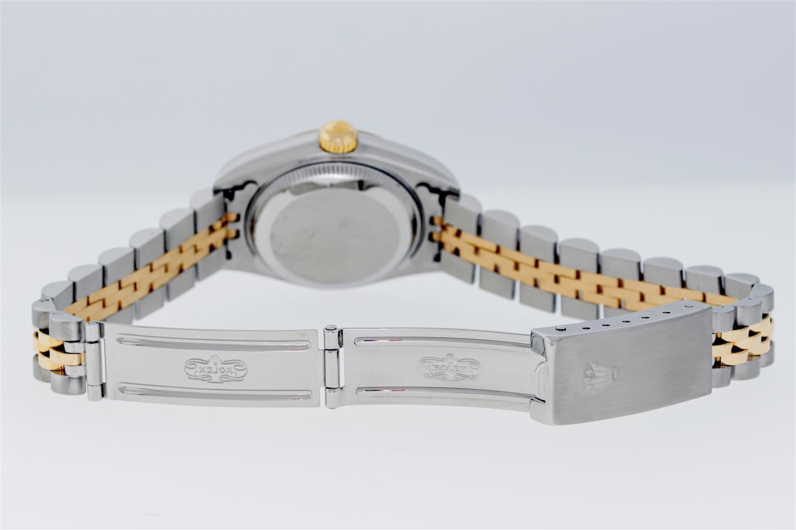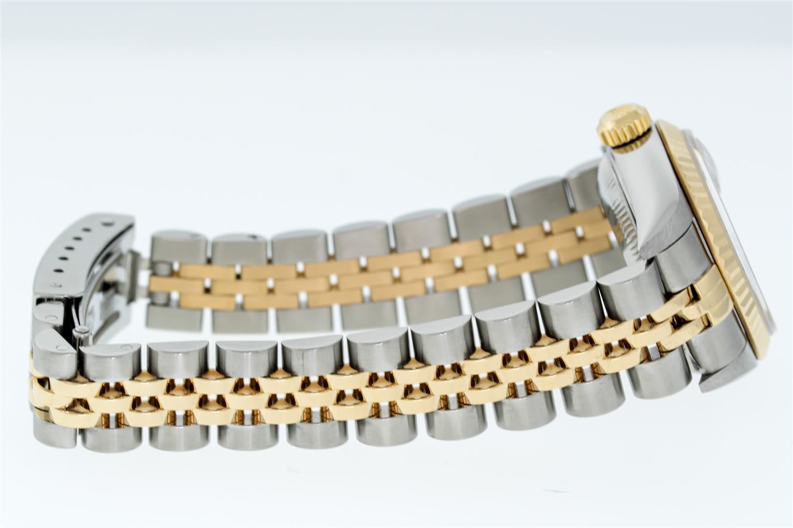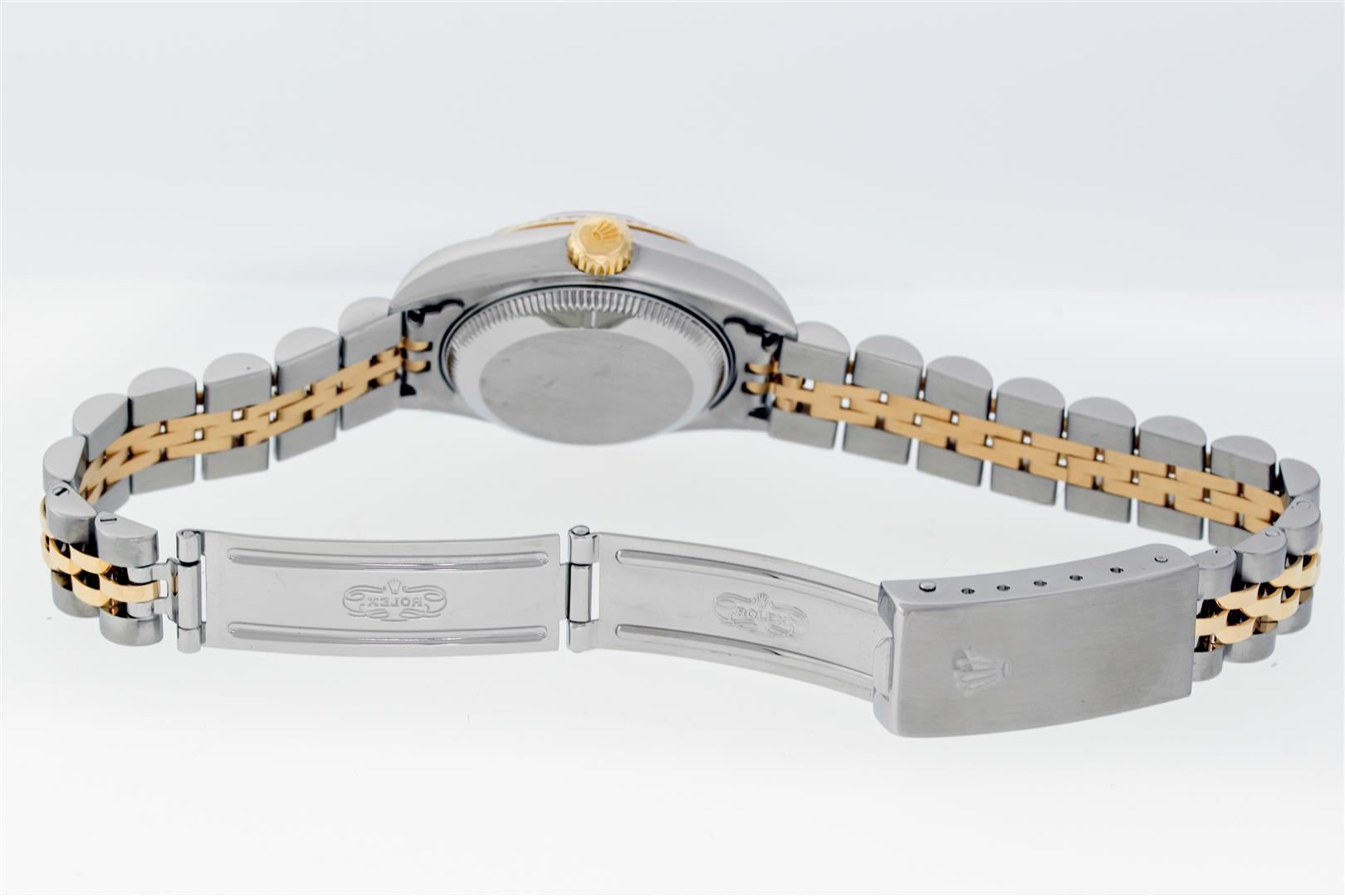 Rolex Ladies Sapphire Quickset 18K Yellow Gold and Stainless Steel Two Tone Wristwatch Polished Bright with Satin Finish, Serviced & Electronically Tested, Stainless Steel Case: 26mm, 18K Yellow Gold Crown, Bezel: Original Rolex 18K Yellow Gold Fluted Bezel. Custom Crystal: New Sapphire With Date Window. Custom Hands: New luminous hands. Movement: Automatic Quickset Winding Movement 2135. Custom Dial: Refinished To Gray With Custom Added Diamonds, Diamond Count: 10 Diamonds In Dial, Clarity: VS, Date Window: 3 O'Clock Position Date Display, Model: Quickset Datejust Quickset Sapphire 79173, Condition: G-6 Extra Fine. Rolex Bracelet: Stainless Steel and 18K Yellow Gold Jubilee Band. Bright Polish & Satin Finish. 6.0 Inch Length, Adjustable. Standard Clasp, With Rolex Logo. This Watch Has Been Serviced Time Tested And Is In Excellent Condition It Is Free Of All Scratches And Dents.