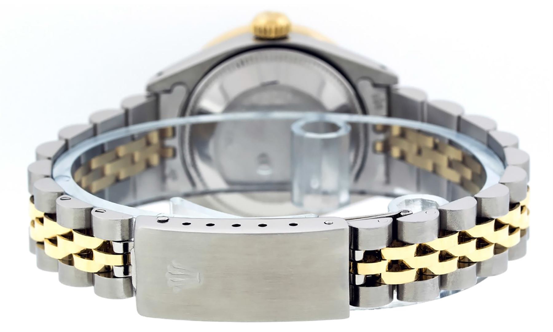 One Ladies Two Tone Rolex Datejust Polished, Serviced & Electronically Tested, Yellow Gold & Stainless Steel Case: 26mm, Yellow Gold Crown, Custom Bezel: New 18K Yellow Gold Pyramid Diamond Bezel, Diamond Count: 24 Diamonds In Bezel. Total Weight .50 Carat, Clarity: SI-VS, Color: G to H. Custom Crystal: New Scratch Resistant Synthetic Sapphire Cyclops Lens. Custom Hands: New Luminescent Hands. Movement: Automatic Winding Movement. Custom Dial: Slate Grey With Roman Hour Markers. Date Window: 3 O'clock Position Date Display, Model: Datejust. Condition: G-6 Extra Fine The Watch Is In Very Good Condition Free Of All Scratches And Dents. Bracelet: Two Tone Yellow Gold & Stainless Steel Jubilee. Bright Polish. 6.0 Inch Length, Adjustable. Standard Clasp, With Rolex Logo. This Watch Has Been Serviced Time Tested And Is In Excellent Condition It Is Free Of All Scratches And Dents.