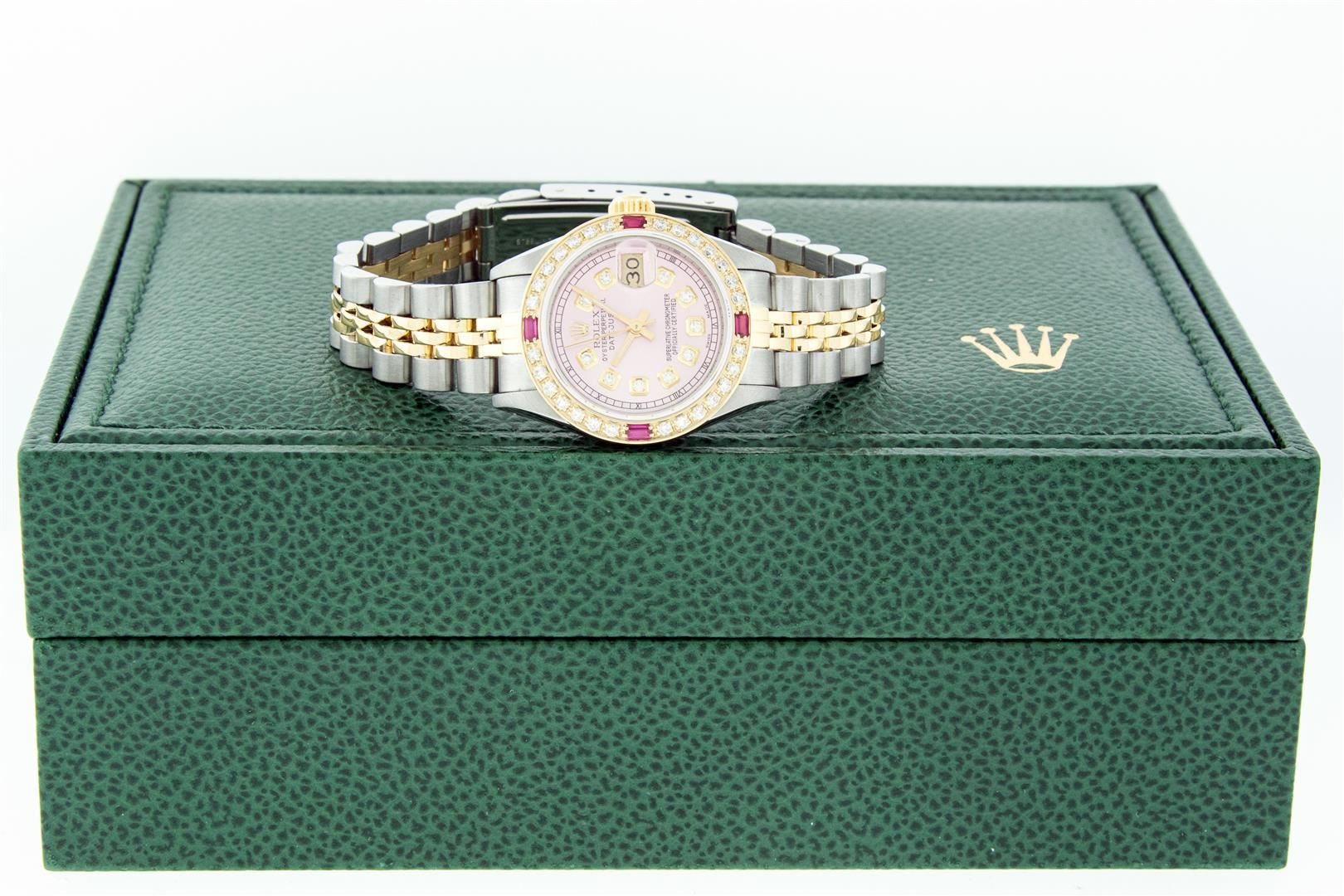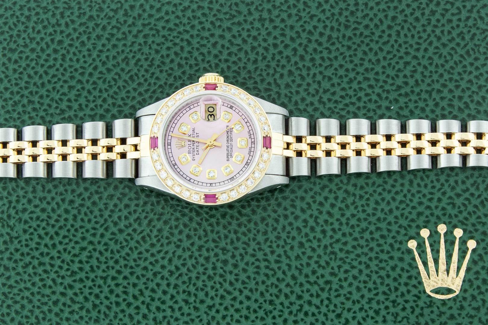 One Ladies Two Tone Rolex Datejust Polished, Serviced & Electronically Tested, Yellow Gold & Stainless Steel Case: 26mm, Yellow Gold Crown, Custom Bezel: New 18K Yellow Gold Ruby Beadset Diamond Bezel, Diamond + Gem Count: 28 Diamonds + 4 Rubies Total Weight .70 Carat, Clarity: SI-VS, Color: G to H. Custom Crystal: New Synthetic Sapphire Cyclops Lens. Custom Hands: New Luminescent Hands. Movement: Automatic Winding Movement. Custom Dial: Ice Pink Set With Diamond Hour Markers, Diamond Count: 10 Diamond in Dial, G To H In Color, Si-VS Clarity. Date Window: 3 O'Clock Position Date Display, Model: Datejust, Condition: G-6 Extra Fine. Bracelet: Two Tone Yellow Gold & Stainless Steel Jubilee. Bright Polish. 6.0 Inch Length, Adjustable. Standard Clasp, With Rolex Logo. This Watch Has Been Serviced Time Tested And Is In Excellent Condition It Is Free Of All Scratches And Dents.