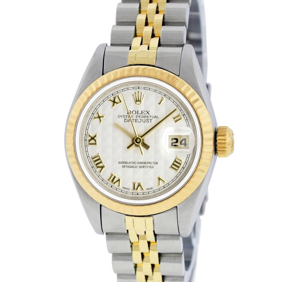 One Ladies Quickset Pre Owned 18K Two Tone Rolex Datejust Polished, Serviced & Electronically Tested, Rolex 18K Yellow Gold & Stainless Steel, Rolex Case Size: 26mm, Rolex 18K Yellow Gold Crown, Rolex Bezel: 18K Yellow Gold Fluted Bezel. Crystal: Sapphire With Magnified Date Window. Hands: Solid Hands. Rolex Movement: Automatic Winding Movement Caliber 2235. Rolex Dial: Ivory Pyramid Roman Dial With Square Track. Date Window: 3 O'Clock Position Date Display, Model: Quickset Datejust. Condition: G-6 Extra Fine. Rolex Bracelet: Two Tone 18K Yellow Gold & Stainless Steel Jubilee Band. Bright Polish. 6.0 Inch Length, Adjustable. Standard Clasp, With Rolex Logo. This Watch Has Been Serviced Time Tested And Is In Excellent Condition It Is Free Of All Scratches And Dents.