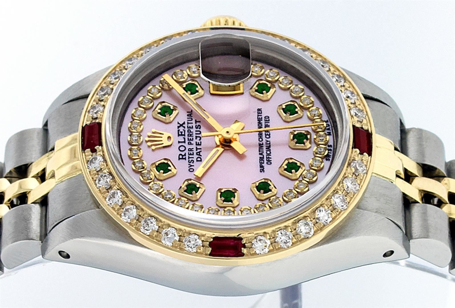 One Ladies Two Tone Rolex Datejust Polished, Serviced & Electronically Tested, Yellow Gold & Stainless Steel Case: 26mm, Yellow Gold Crown, Custom Bezel: New 18K New Yellow Gold Ruby Beadset Diamond Bezel, Stone Count: 28 Diamonds + 4 Rubies In Dial, Total Weight .70 Carat, Clarity: SI-VS, Color: G to H. Custom Crystal: New Scratch Resistant Synthetic Sapphire Cyclops Lens. Custom Hands: New Luminescent Hands. Movement: Automatic Winding Movement. Custom Dial: Pink Mother Of Pearl Emerald String Diamond Dial, Stone Count: 10 Emeralds + 33 Diamonds In Dial, Clarity: SI-VS, Color: G to H. Date Window: 3 O'clock Position Date Display, Model: Datejust. Condition: G-6 Extra Fine. Bracelet: Two Tone Yellow Gold & Stainless Steel Jubilee Band. Bright Polish. 6.0 Inch Length, Adjustable. Standard Clasp, With Rolex Logo. This Watch Has Been Serviced Time Tested And Is In Excellent Condition It Is Free Of All Scratches And Dents.