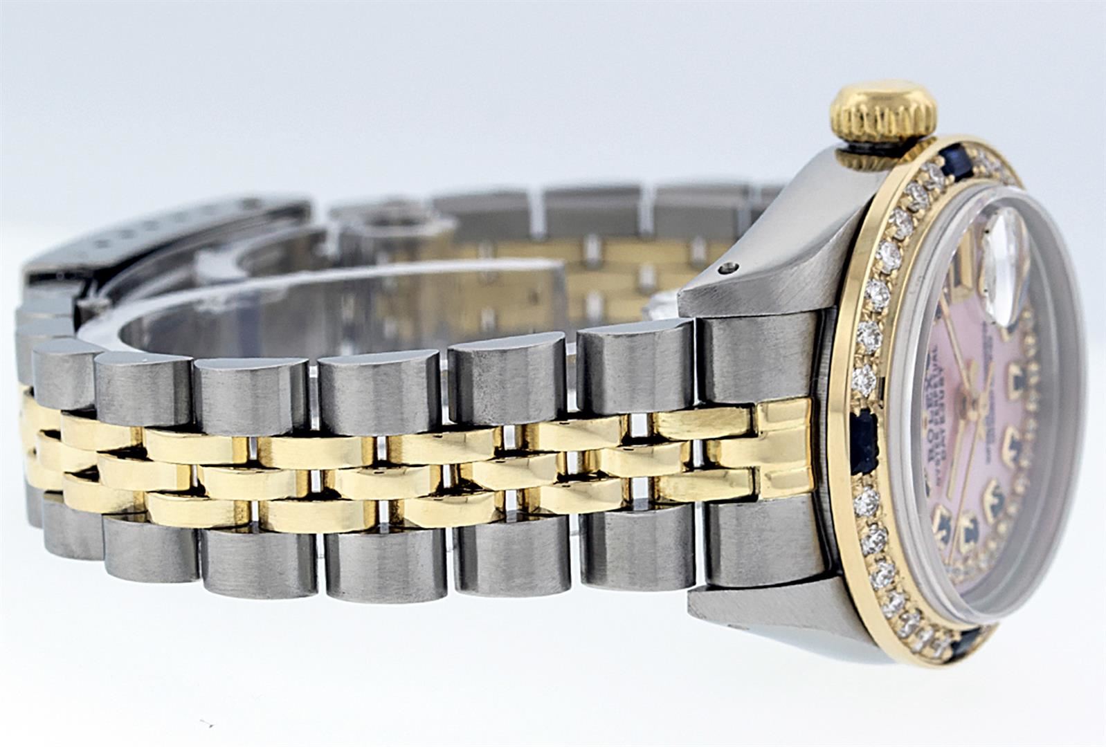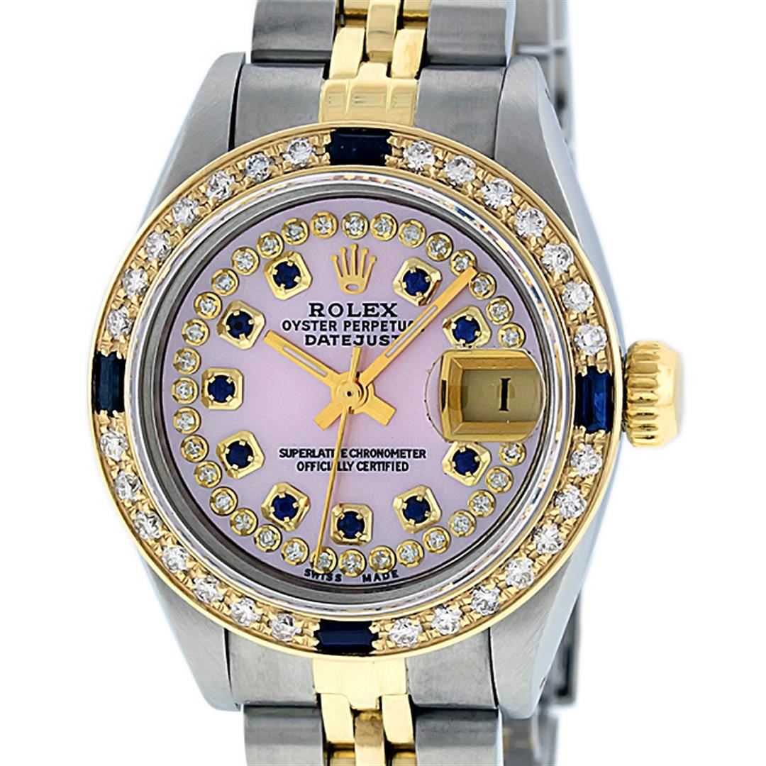 One Ladies Two Tone Rolex Datejust Polished, Serviced & Electronically Tested, Yellow Gold & Stainless Steel Case: 26mm, Yellow Gold Crown, Custom Bezel: New 18K Yellow Gold Sapphire Beadset Diamond Bezel, Diamond Count: 28 Diamonds + 4 Sapphires, Total Weight .70 Carat, Clarity: SI-VS, Color: G to H. Custom Crystal: New Synthetic Sapphire Cyclops Lens. Custom Hands: New Luminescent Hands. Movement: Automatic Winding Movement. Custom Dial: Pink Mother Of Pearl With Sapphire String Diamond Hour Markers. Stone Count: 10 Sapphires + 33 Diamonds In Dial, Clarity: SI-VS, Color: G to H. Date Window: 3 O'clock Position Date Display, Model: Datejust. Condition: G-6 Extra Fine. Bracelet: Two Tone Yellow Gold & Stainless Steel Jubilee. Bright Polish. 6.0 Inch Length, Adjustable. Standard Clasp, With Rolex Logo. This Watch Has Been Serviced Time Tested And Is In Excellent Condition It Is Free Of All Scratches And Dents.