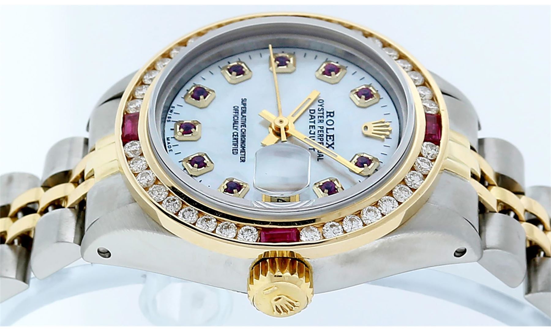 One Ladies Two Tone Rolex Datejust Polished, Serviced & Electronically Tested, Yellow Gold & Stainless Steel Case: 26mm, Yellow Gold Crown, Custom Bezel: New 18K Yellow Gold Ruby Channel Set Diamond Bezel, Diamond + Gem Count: 36 Diamonds + 4 Rubies Total Weight 1.00 Carat, Clarity: SI-VS, Color: G to H. Custom Crystal: New Synthetic Sapphire Cyclops Lens. Custom Hands: New Luminescent Hands. Movement: Automatic Winding Movement. Custom Dial: Mother Of Pearl with Ruby Hour Markers, Stone Count: 10 Rubies In Dial. Date Window: 3 O'Clock Position Date Display, Model: Datejust, Condition: G-6 Extra Fine. Bracelet: Two Tone Yellow Gold & Stainless Steel Jubilee. Bright Polish. 6.0 Inch Length, Adjustable. Standard Clasp, With Rolex Logo. This Watch Has Been Serviced Time Tested And Is In Excellent Condition It Is Free Of All Scratches And Dents.