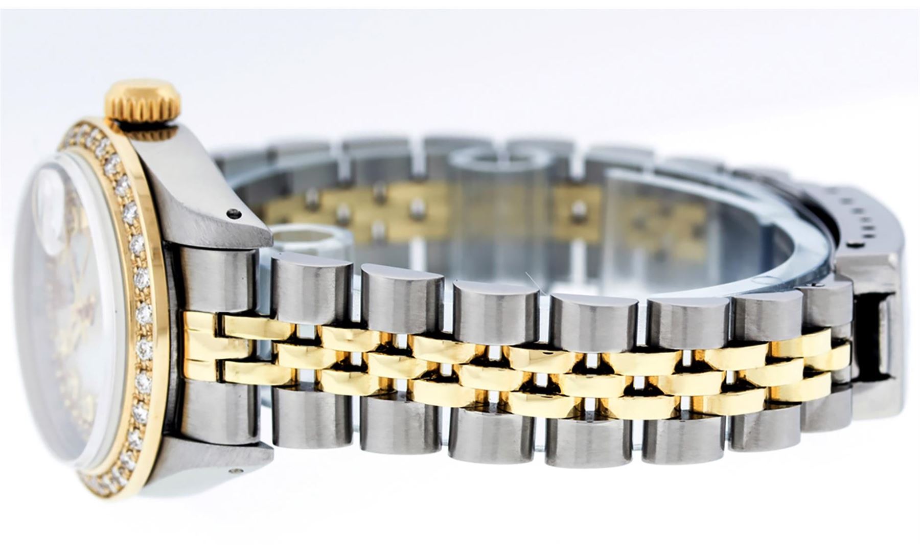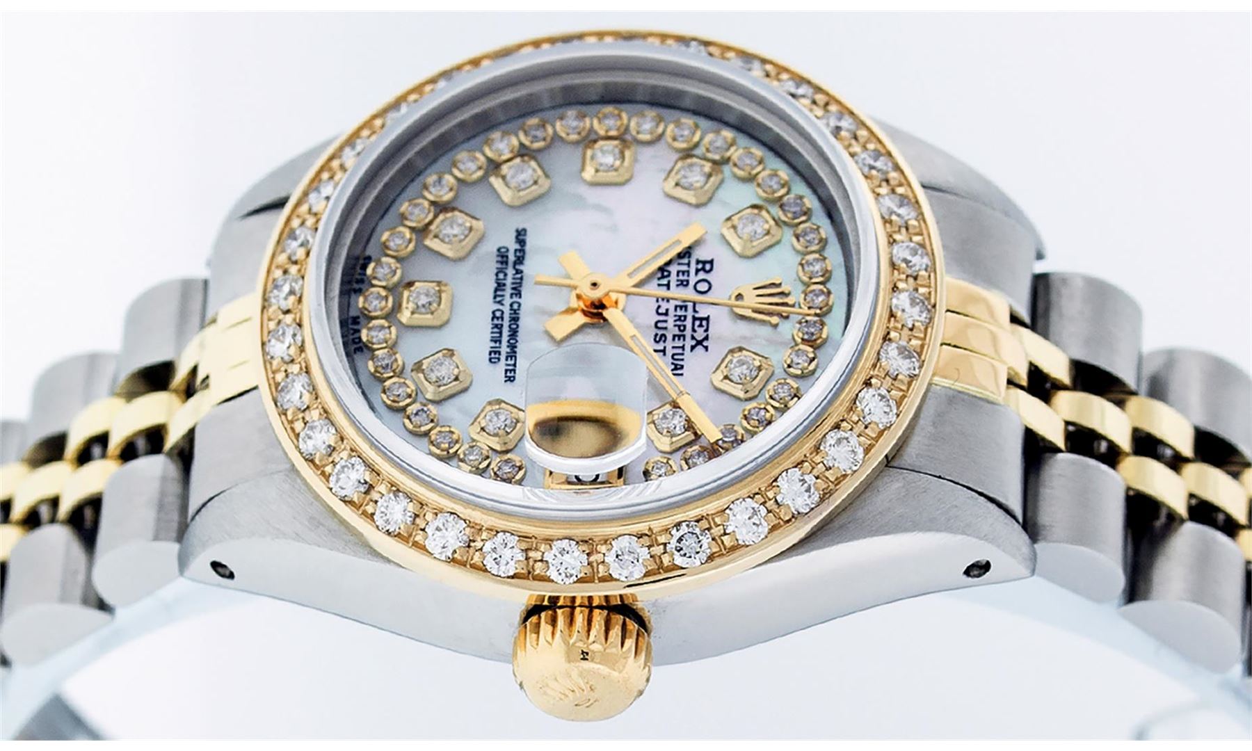 One Ladies Two Tone Rolex Datejust Polished, Serviced & Electronically Tested, Yellow Gold & Stainless Steel Case: 26mm, Yellow Gold Crown, Custom Bezel: New 18K Yellow Gold Beadset Diamond Bezel, Clarity: SI-VS, Color: G to H. Custom Crystal: New Synthetic Sapphire Cyclops Lens. Custom Hands: New Luminescent Hands. Movement: Automatic Winding Movement. Custom Dial: Mother Of Pearl String Diamond Dial, Diamond Count: 43 Diamonds, Clarity: SI-VS, Color: G to H. Date Window: 3 O'Clock Position Date Display, Model: Datejust. Condition: G-6 Extra Fine. Bracelet: Two Tone Yellow Gold & Stainless Steel Jubilee Band. Bright Polish. 6.0 Inch Length, Adjustable. Standard Clasp, With Rolex Logo. This Watch Has Been Serviced Time Tested And Is In Excellent Condition It Is Free Of All Scratches And Dents.