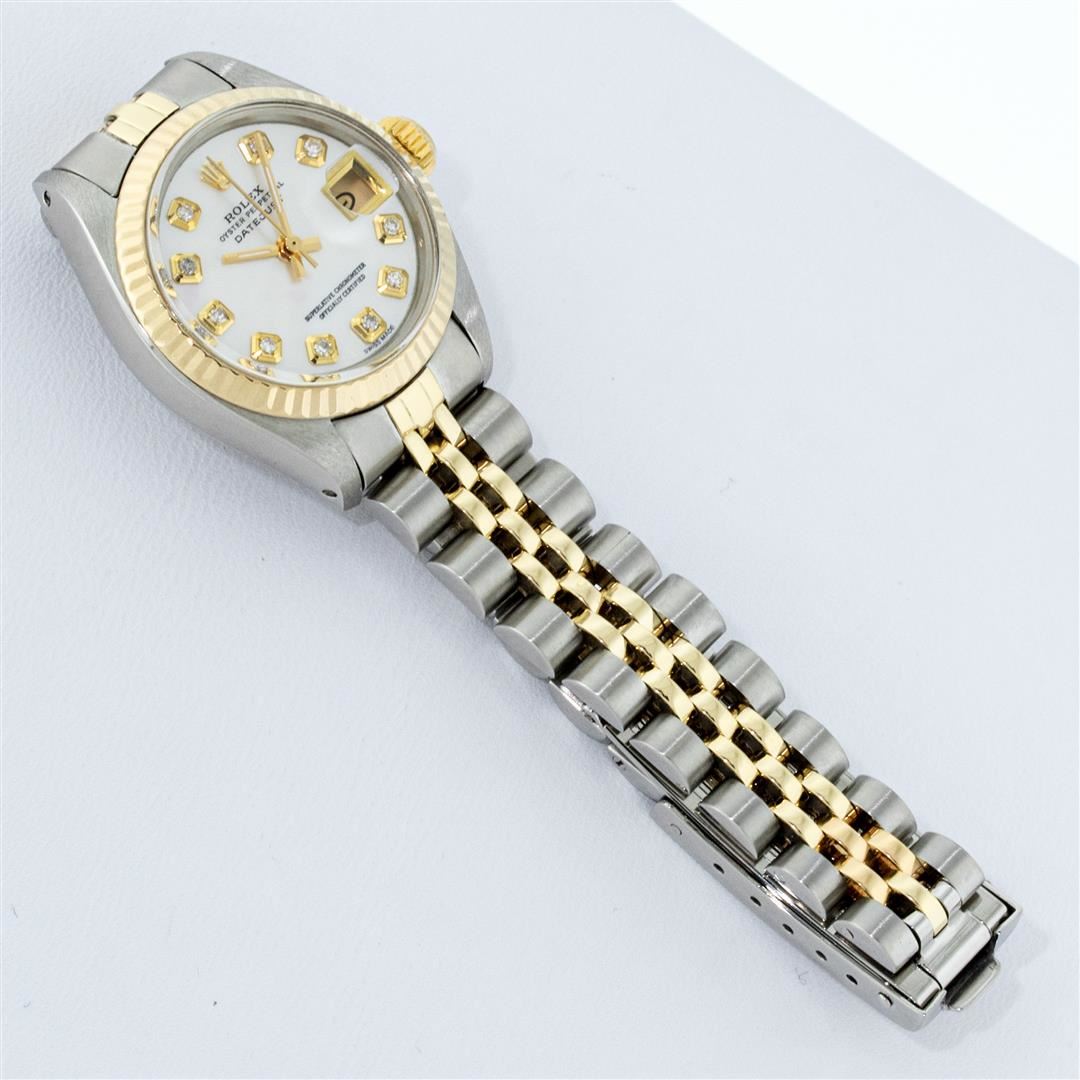 One Ladies Pre Owned Two Tone Rolex Datejust Polished, Serviced & Electronically Tested, Rolex Yellow Gold & Stainless Steel Case: 26mm, Rolex Yellow Gold Crown, Rolex Bezel: Yellow Gold Fluted Bezel. Custom Crystal: New Acrylic Cyclops Lens. Custom Hands: New Luminescent Hands. Rolex Movement: Automatic Winding Movement. Custom Dial: Refinished To Mother Of Pearl With Added Diamond Hour Markers, Diamond Count: 10 Diamonds In Dial, Color: G to H, Clarity: VS2-SI1. Date Window: 3 O'Clock Position Date Display, Model: Datejust. Condition: G-6 Extra Fine. Rolex Bracelet: Two Tone Yellow Gold & Stainless Steel Jubilee Band. Bright Polish. 6.0 Inch Length, Adjustable. Standard Clasp, With Rolex Logo. This Watch Has Been Serviced Time Tested And Is In Excellent Condition It Is Free Of All Scratches And Dents.