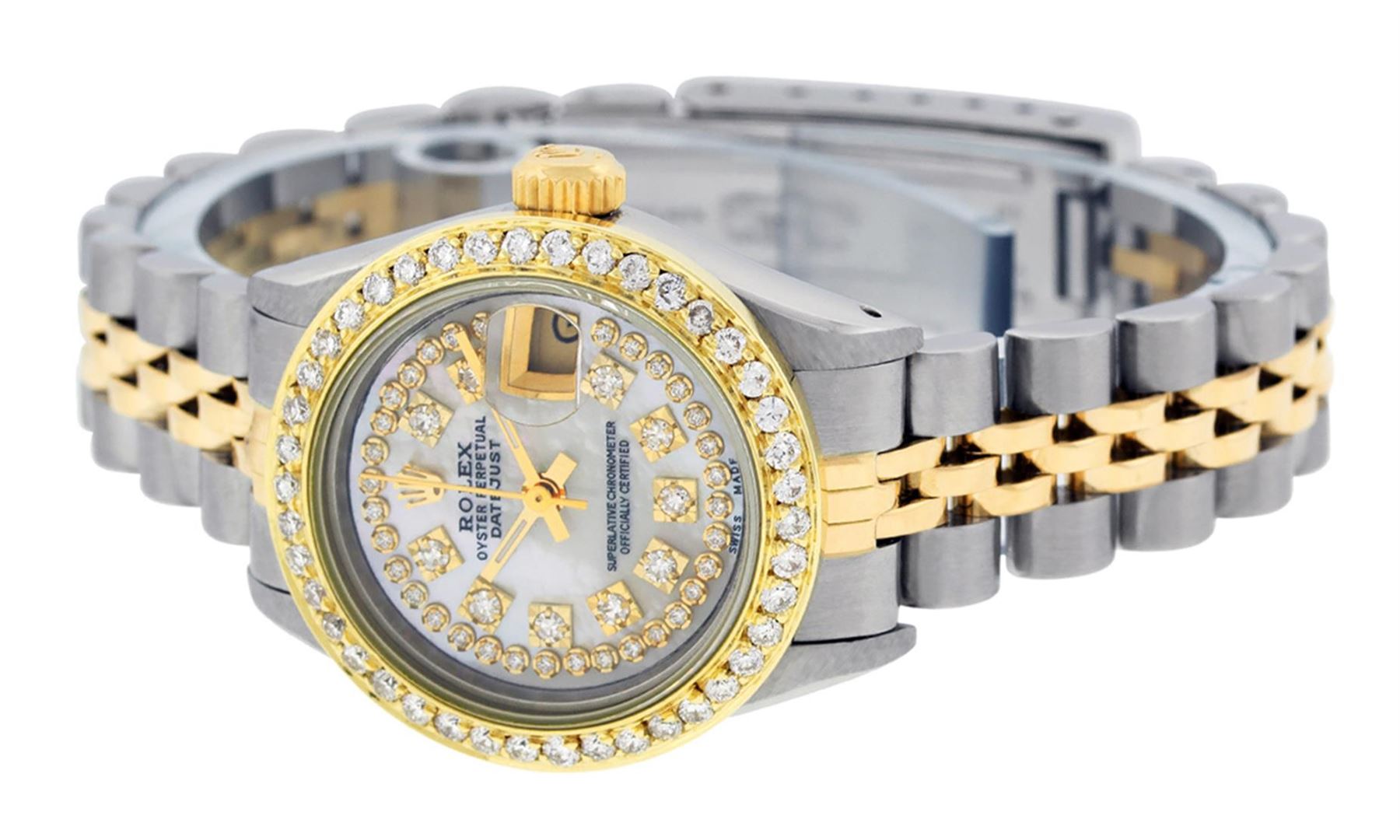 One Ladies 14K Two Tone Rolex Datejust Polished, Serviced & Electronically Tested, 14K Yellow Gold & Stainless Steel Case: 26mm, 14K Yellow Gold Crown, Custom Bezel: New 18K 1ctw Yellow Gold Beadset Diamond Bezel, Diamond Count: 44 Diamonds, Total Weight 1.00 Carat, Clarity: Si-VS, Color: G to H. Custom Crystal: New Synthetic Sapphire Cyclops Lens. Custom Hands: New Luminescent Hands. Movement: Automatic Winding Movement Caliber 2030. Custom Dial: Mother Of Pearl String Diamond Dial, Diamond Count: 43 Single Cut Diamonds in Dial, G To H In Color, VS Clarity. Date Window: 3 O'Clock Position Date Display, Model: Datejust, Condition: G-6 Extra Fine. Bracelet: Two Tone 14K Yellow Gold & Stainless Steel Jubilee. Bright Polish. 6.0 Inch Length, Adjustable. Standard Clasp, With Rolex Logo. This Watch Has Been Serviced Time Tested And Is In Excellent Condition It Is Free Of All Scratches And Dents.