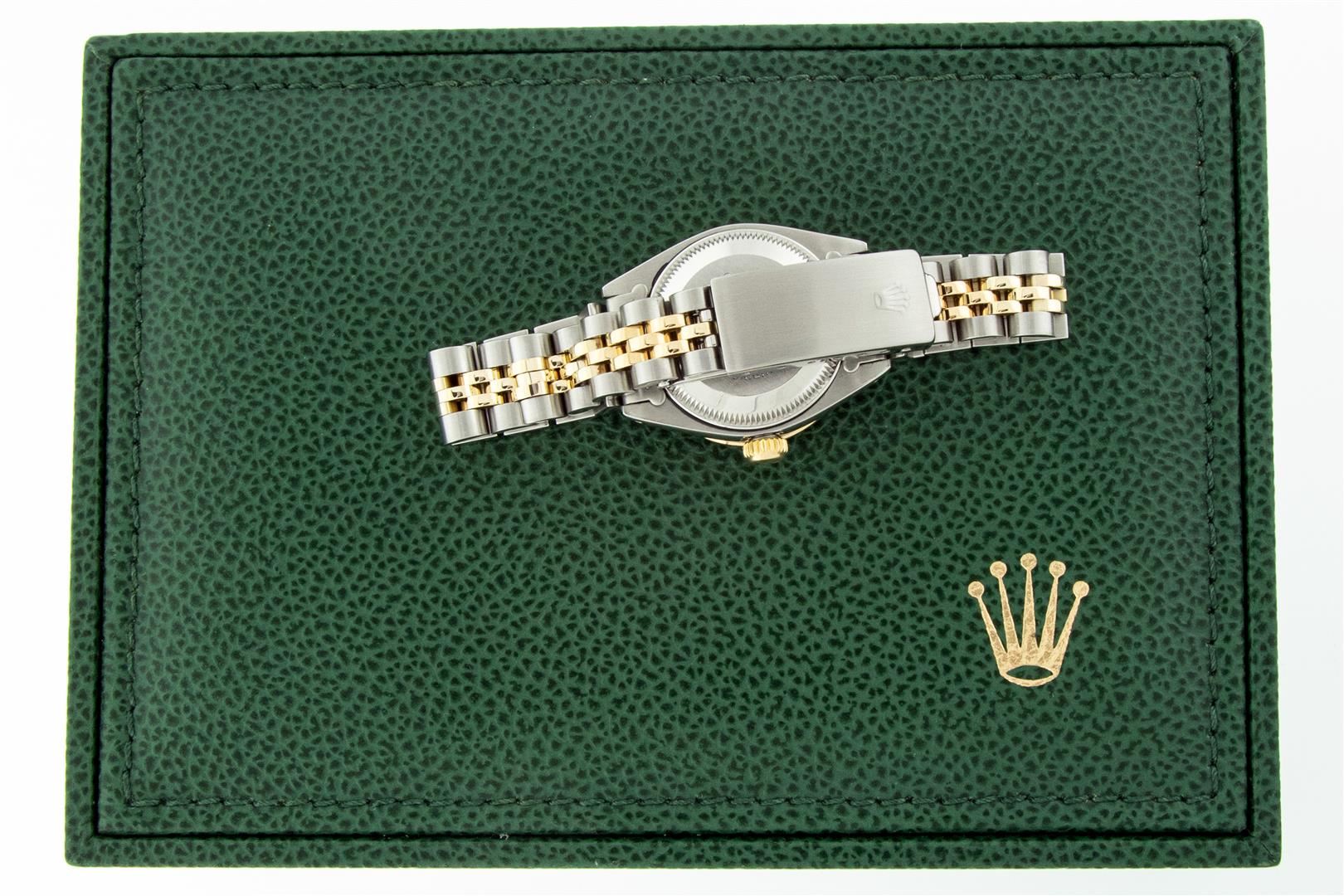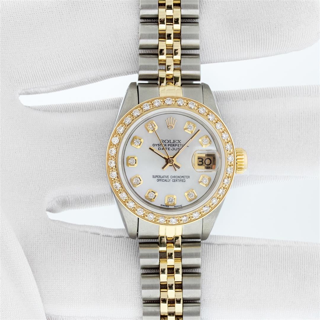 One Ladies Two Tone Rolex Datejust Polished, Serviced & Electronically Tested, Rolex Yellow Gold & Stainless Steel Case: 26mm, Rolex Yellow Gold Crown, Custom Bezel: 18K Yellow Gold Beadset Diamond Bezel, Diamond Count: 32 Diamonds Total Weight .70 Carat, Clarity: Si-VS, Color: G to H. Custom Crystal: Sapphire With Magnified Date Window. Custom Hands: New Luminescent Hands. Rolex Movement: Automatic Winding Movement Caliber. Custom Dial: Mother Of Pearl Dial Set With Diamond Hour Markers, 10 Diamond in Dial G To H In Color, SI-VS Clarity. Date Window: 3 O'clock Position Date Display, Model: Datejust. Condition: G-6 Extra Fine. Rolex Bracelet: Two Tone Yellow Gold & Stainless Steel Jubilee Band. Bright Polish. 6.0 Inch Length, Adjustable. Standard Clasp, With Rolex Logo. This Pre Owned Watch Has Been Serviced Time Tested And Is In Excellent Condition It Is Free Of All Scratches And Dents. This Watch Comes With A Rolex Box.