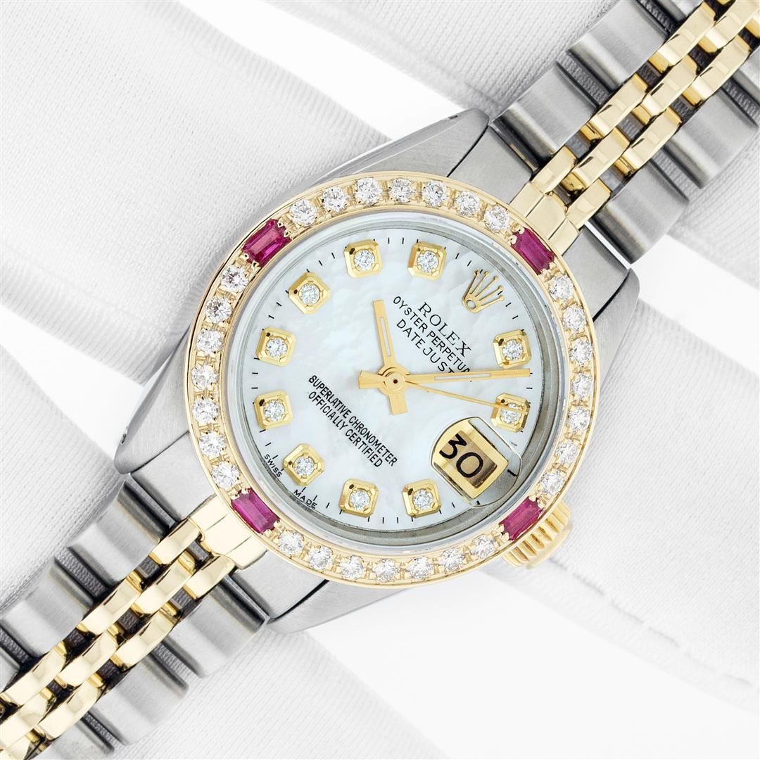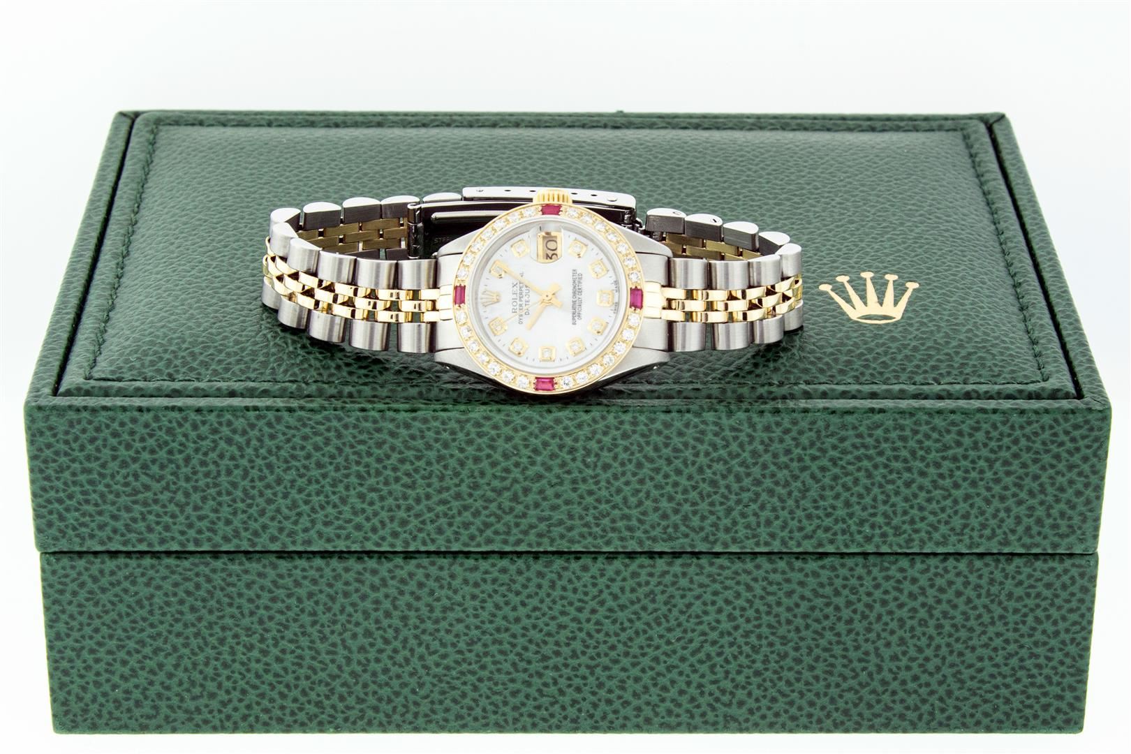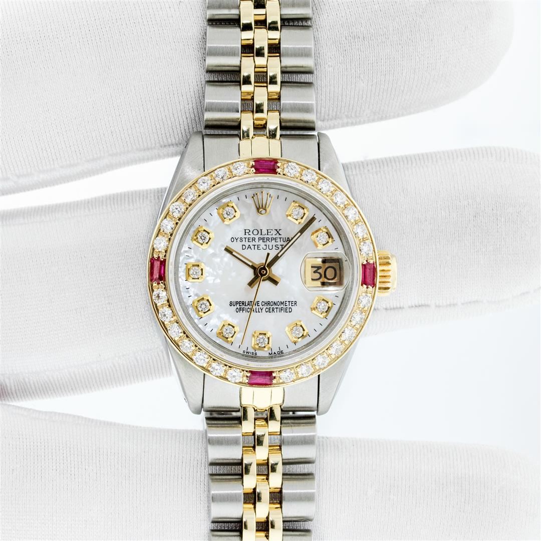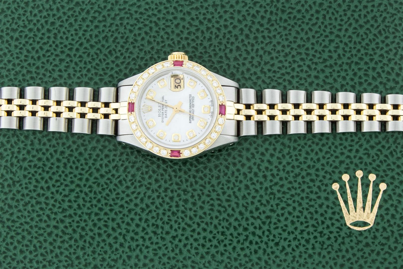 One Ladies Two Tone Rolex Datejust Polished, Serviced & Electronically Tested, Yellow Gold & Stainless Steel Case: 26mm, Rolex Yellow Gold Crown, Custom Bezel: New 18K Yellow Gold Ruby Beadset Diamond Bezel, Diamond + Gem Count: 28 Diamonds + 4 Rubies Total Weight .70 Carat, Clarity: Si-VS, Color: G to H. Custom Crystal: New Sapphire With Magnified Date Window. Custom Hands: New Luminescent Hands. Rolex Movement: Automatic Winding Movement. Custom Dial: Mother Of Pearl Set With Custom Added Diamond Hour Markers, Diamond Count: 10 Diamond in Dial, G To H In Color, SI-VS Clarity. Date Window: 3 O'clock Position Date Display, Model: Datejust, Condition: G-6 Extra Fine. Rolex Bracelet: Two Tone Yellow Gold & Stainless Steel Jubilee Band. Bright Polish. 6.0 Inch Length, Adjustable. Standard Clasp, With Rolex Logo. This Pre Owned Watch Has Been Serviced Time Tested And Is In Excellent Condition It Is Free Of All Scratches And Dents. This Watch Comes With A Rolex Box.