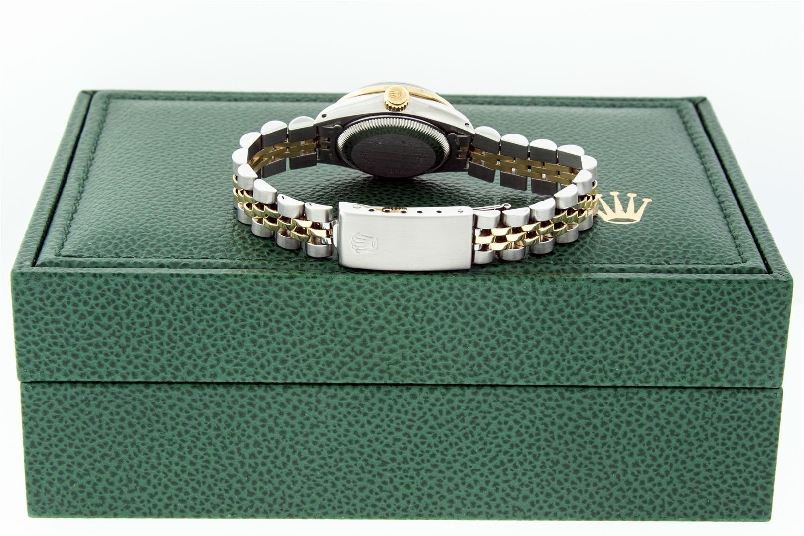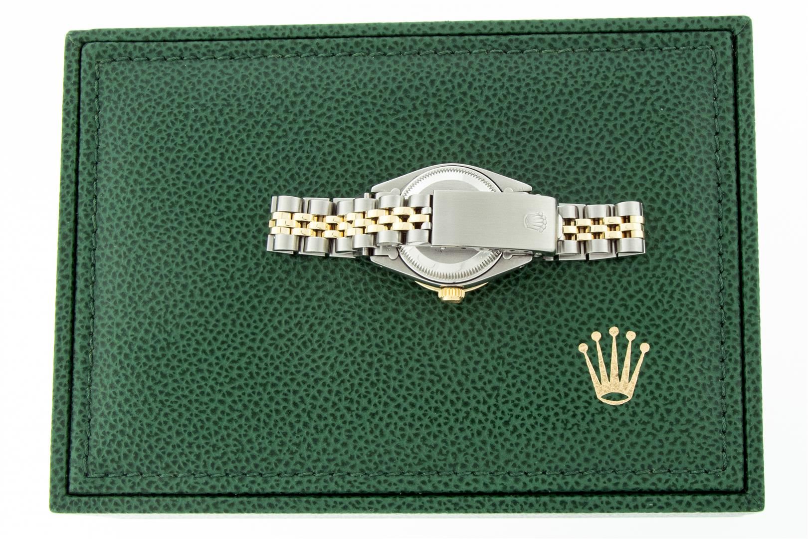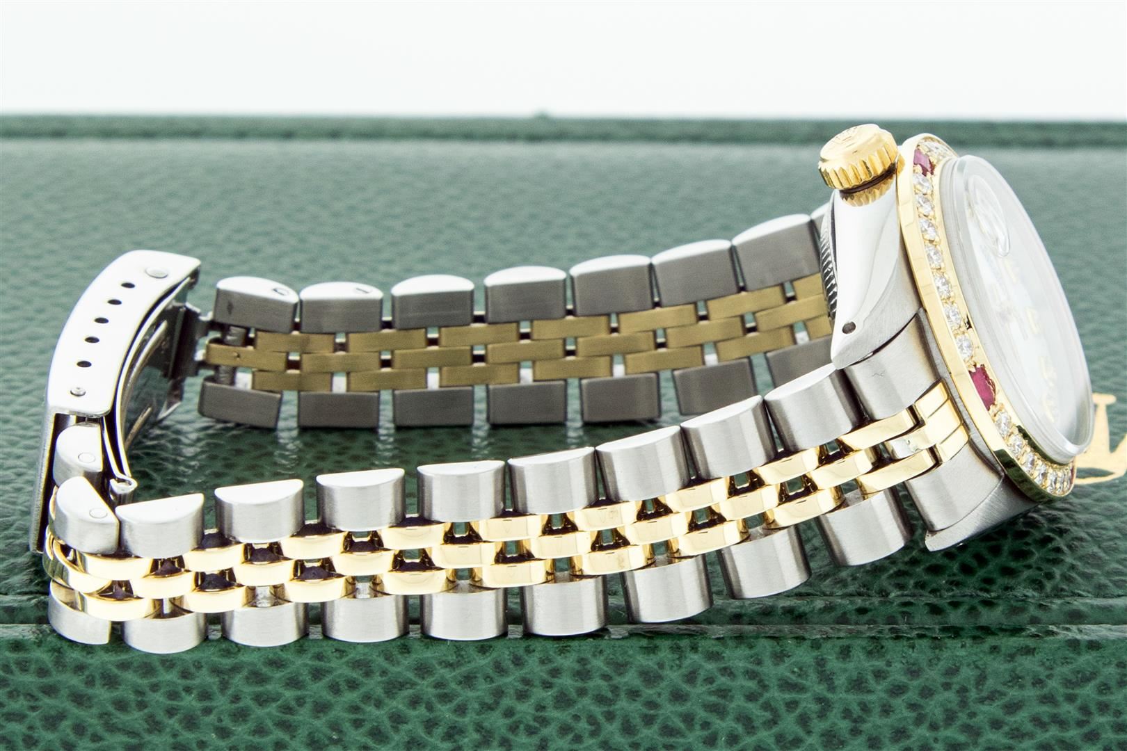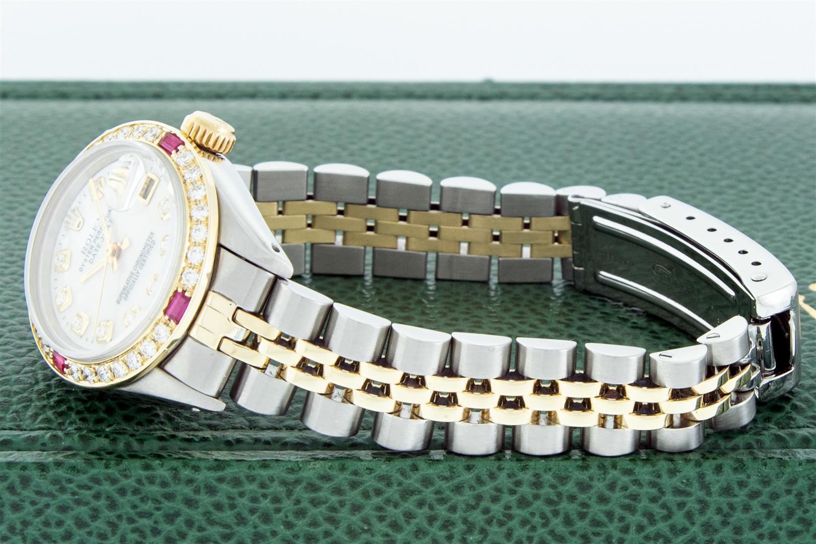 One Ladies Two Tone Rolex Datejust Polished, Serviced & Electronically Tested, Yellow Gold & Stainless Steel Case: 26mm, Rolex Yellow Gold Crown, Custom Bezel: New 18K Yellow Gold Ruby Beadset Diamond Bezel, Diamond + Gem Count: 28 Diamonds + 4 Rubies Total Weight .70 Carat, Clarity: Si-VS, Color: G to H. Custom Crystal: New Sapphire With Magnified Date Window. Custom Hands: New Luminescent Hands. Rolex Movement: Automatic Winding Movement. Custom Dial: Mother Of Pearl Set With Custom Added Diamond Hour Markers, Diamond Count: 10 Diamond in Dial, G To H In Color, SI-VS Clarity. Date Window: 3 O'clock Position Date Display, Model: Datejust, Condition: G-6 Extra Fine. Rolex Bracelet: Two Tone Yellow Gold & Stainless Steel Jubilee Band. Bright Polish. 6.0 Inch Length, Adjustable. Standard Clasp, With Rolex Logo. This Pre Owned Watch Has Been Serviced Time Tested And Is In Excellent Condition It Is Free Of All Scratches And Dents. This Watch Comes With A Rolex Box.