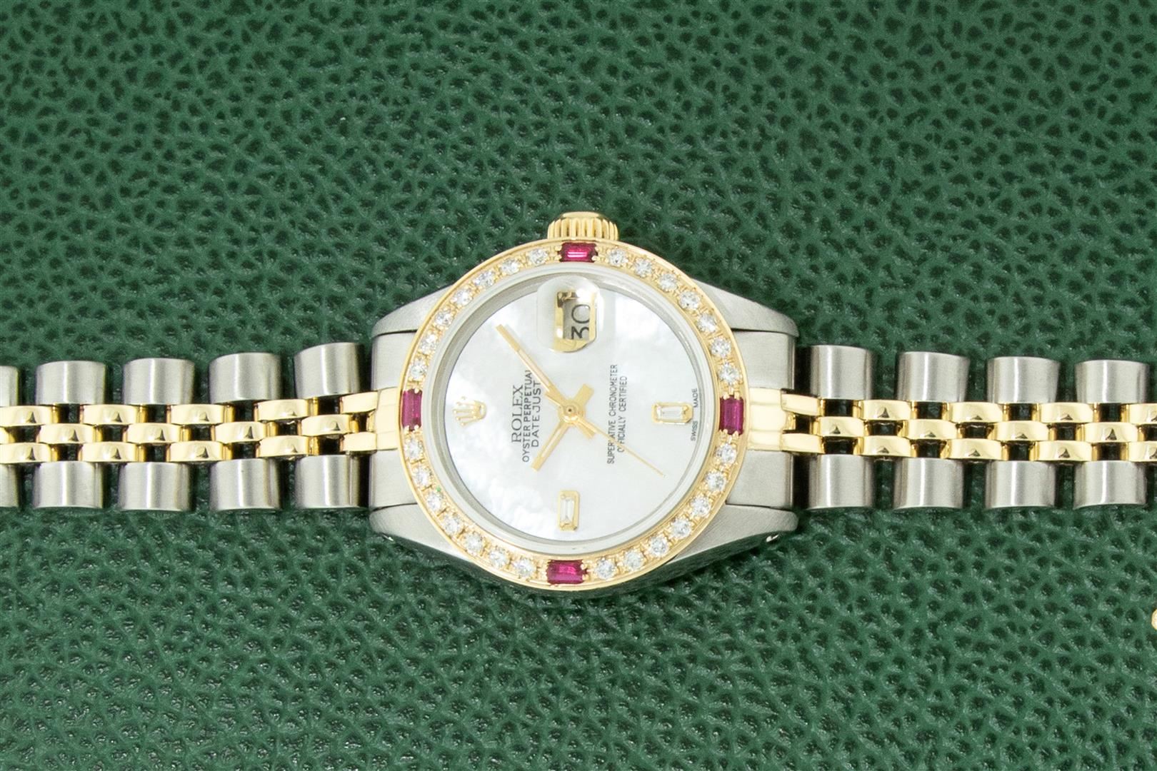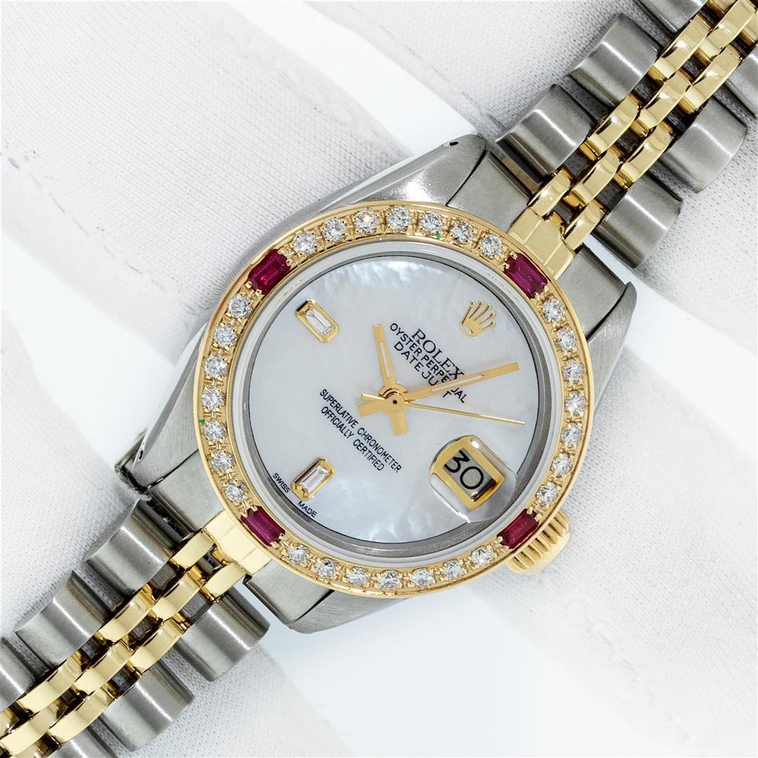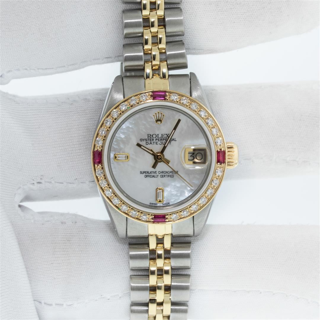 One Ladies Two Tone Rolex Oyster Perpetual Datejust Polished, Serviced & Electronically Tested, Rolex Yellow Gold & Stainless Steel Case: 26mm, Rolex Yellow Gold Crown, Custom Bezel: New 18K Yellow Gold Sapphire Beadset Diamond Bezel, Diamond Count: 28 Diamonds + 4 Ruby In Bezel. Total Weight .70 Carat, Clarity: SI-VS, Color: G to H. Custom Crystal: New Sapphire With Magnified Date Window. Custom Hands: New Luminescent Hands. Rolex Movement: Automatic Winding Movement. Custom Dial: Mother Of Pearl With Baguette Diamonds, Stone Count: 2 Baguettes. Date Window: 3 O'clock Position Date Display, Model: Datejust. Condition: G-6 Extra Fine. Rolex Bracelet: Two Tone Yellow Gold & Stainless Steel Jubilee Band. Bright Polish. 6.0 Inch Length, Adjustable. Standard Clasp, With Rolex Logo. This Pre Owned Watch Has Been Serviced Time Tested And Is In Excellent Condition It Is Free Of All Scratches And Dents. This Watch Comes With A Rolex Box.