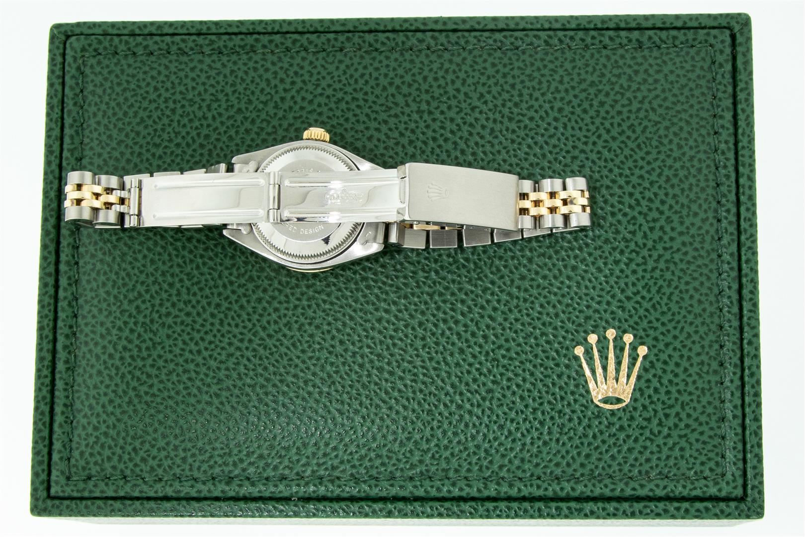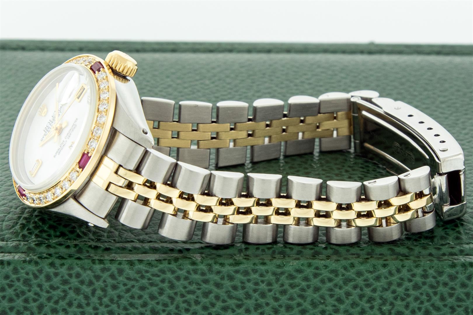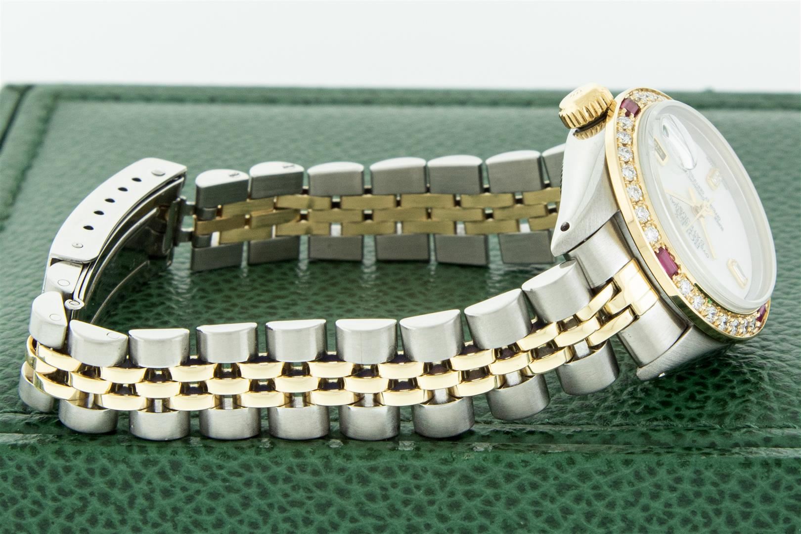 One Ladies Two Tone Rolex Oyster Perpetual Datejust Polished, Serviced & Electronically Tested, Rolex Yellow Gold & Stainless Steel Case: 26mm, Rolex Yellow Gold Crown, Custom Bezel: New 18K Yellow Gold Sapphire Beadset Diamond Bezel, Diamond Count: 28 Diamonds + 4 Ruby In Bezel. Total Weight .70 Carat, Clarity: SI-VS, Color: G to H. Custom Crystal: New Sapphire With Magnified Date Window. Custom Hands: New Luminescent Hands. Rolex Movement: Automatic Winding Movement. Custom Dial: Mother Of Pearl With Baguette Diamonds, Stone Count: 2 Baguettes. Date Window: 3 O'clock Position Date Display, Model: Datejust. Condition: G-6 Extra Fine. Rolex Bracelet: Two Tone Yellow Gold & Stainless Steel Jubilee Band. Bright Polish. 6.0 Inch Length, Adjustable. Standard Clasp, With Rolex Logo. This Pre Owned Watch Has Been Serviced Time Tested And Is In Excellent Condition It Is Free Of All Scratches And Dents. This Watch Comes With A Rolex Box.