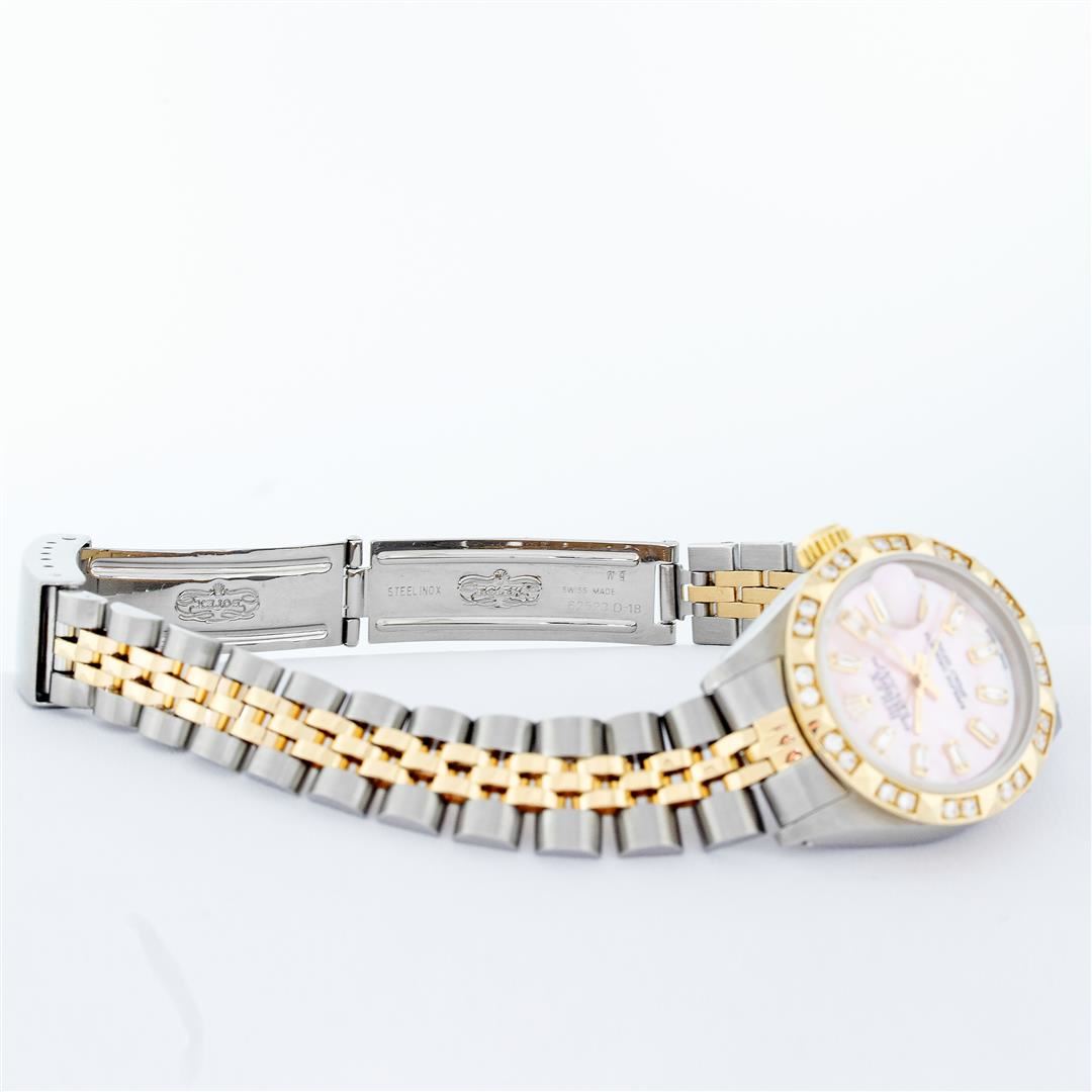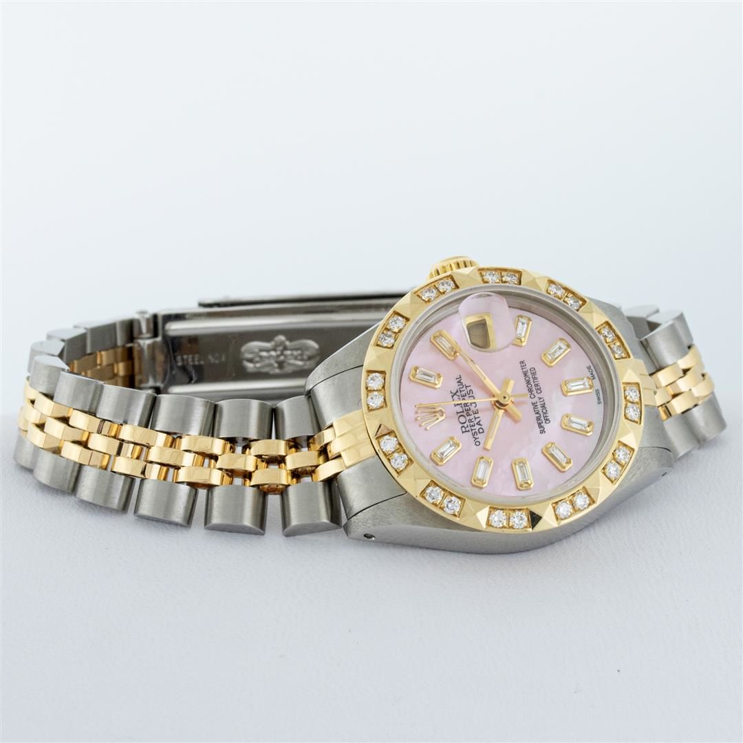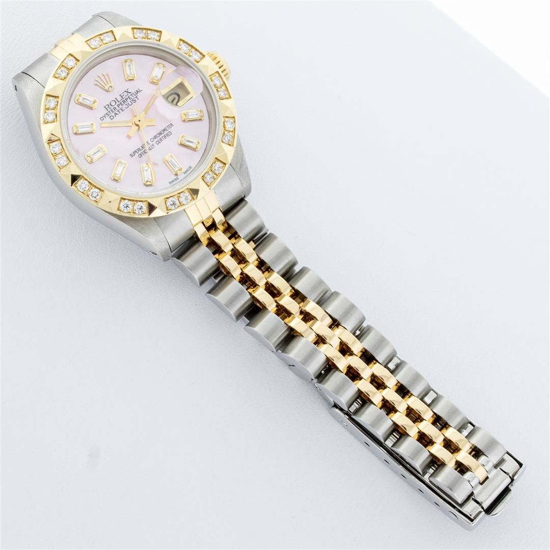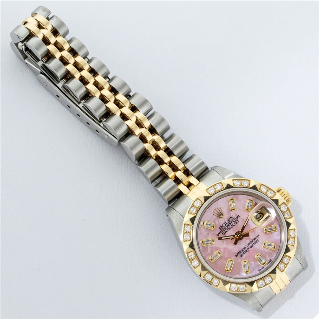 One Ladies Yellow Gold Two Tone and Stainless Steel Rolex Datejust Polished, Serviced & Electronically Tested, Yellow Gold & Stainless Steel Case: 26mm, Yellow Gold Crown, Custom Bezel: 18K Yellow Gold Pyramid Diamond Bezel, Diamond Count: 24 Diamonds Total Weight .50 Carat, Clarity: SI-VS, Color: G to H. Custom Crystal: New Scratch Resistant Synthetic Sapphire Cyclops Lens. Custom Hands: New Luminescent Hands. Movement: Automatic Winding Movement. Custom Dial: Pink Mother Of Pearl Baguette Diamond Hour Markers. 10 Baguette Diamonds In Dial, Clarity: SI-VS, Color: G to H. Date Window: 3 O'Clock Position Date Display, Model: Datejust. Condition: G-6 Extra Fine. Bracelet: Two Tone Yellow Gold & Stainless Steel Jubilee. Bright Polish. 6.0 Inch Length, Adjustable. Standard Clasp, With Rolex Logo. This Watch Has Been Serviced Time Tested And Is In Excellent Condition It Is Free Of All Scratches And Dents.