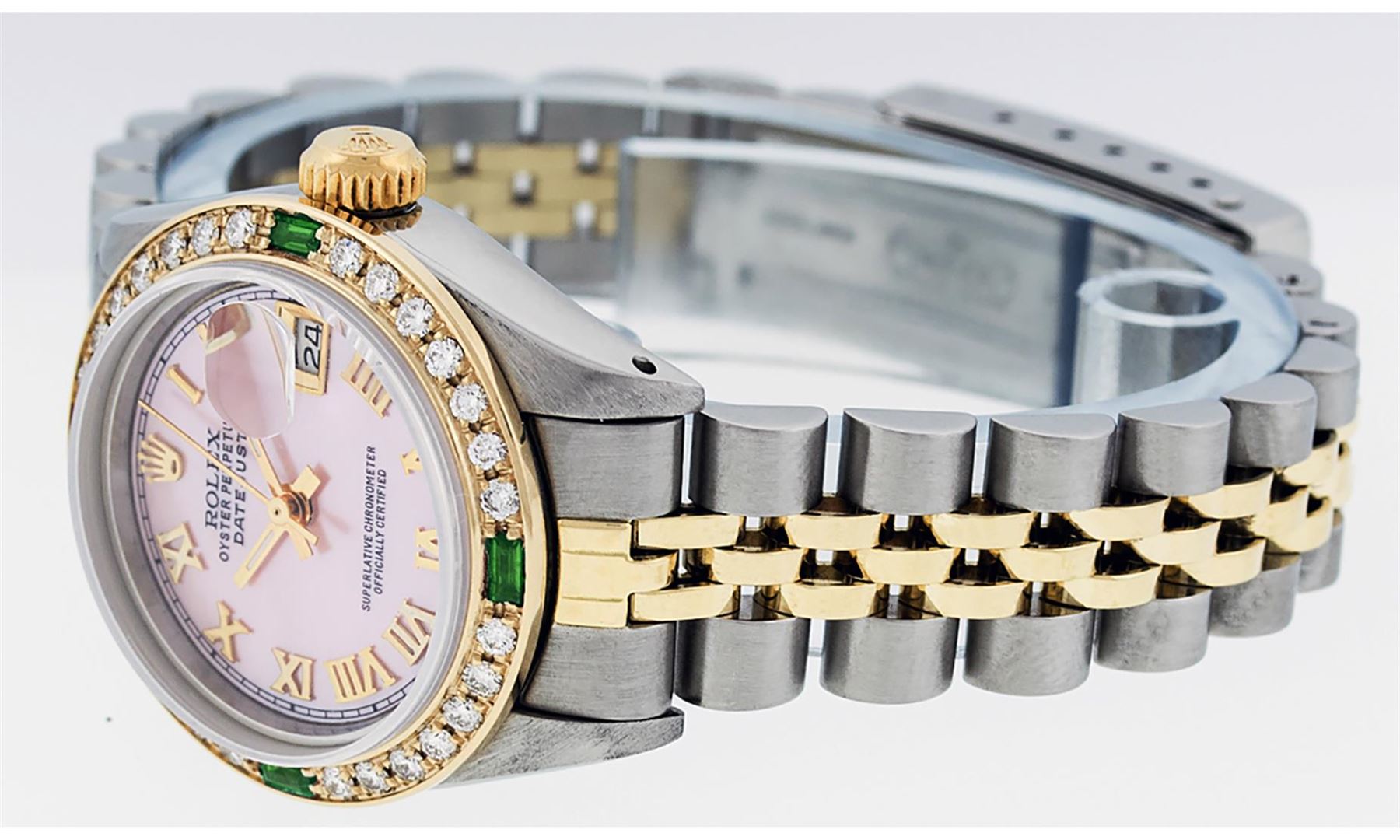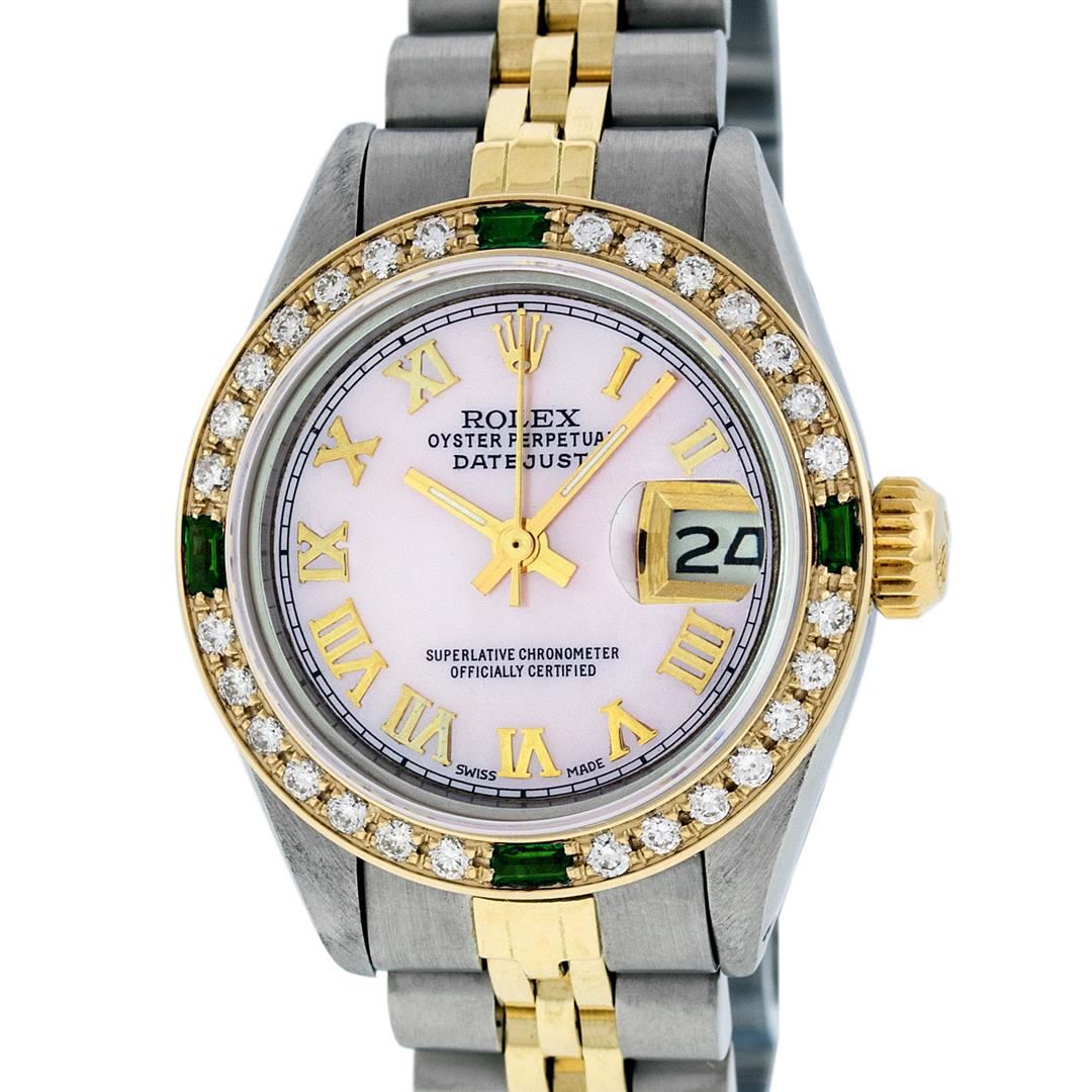 One Ladies Two Tone Rolex Datejust Polished, Serviced & Electronically Tested, Yellow Gold & Stainless Steel Case: 26mm, Yellow Gold Crown, Custom Bezel: New 18K Yellow Gold Emerald Beadset Diamond Bezel, Diamond + Gem Count: 28 Diamonds + 4 Emeralds Total Weight .70 Carat, Clarity: SI-VS, Color: G to H. Custom Crystal: New Scratch Resistant Synthetic Sapphire Cyclops Lens. Custom Hands: New Luminescent Hands. Movement: Automatic Winding Movement. Custom Dial: Pink Mother Of Pearl With Roman Hour Markers and Square Track. Date Window: 3 O'clock Position Date Display, Model: Datejust, Condition: G-6 Extra Fine. Bracelet: Two Tone Yellow Gold & Stainless Steel Jubilee Band. Bright Polish. 6.0 Inch Length, Adjustable. Standard Clasp, With Rolex Logo. This Watch Has Been Serviced Time Tested And Is In Excellent Condition It Is Free Of All Scratches And Dents.