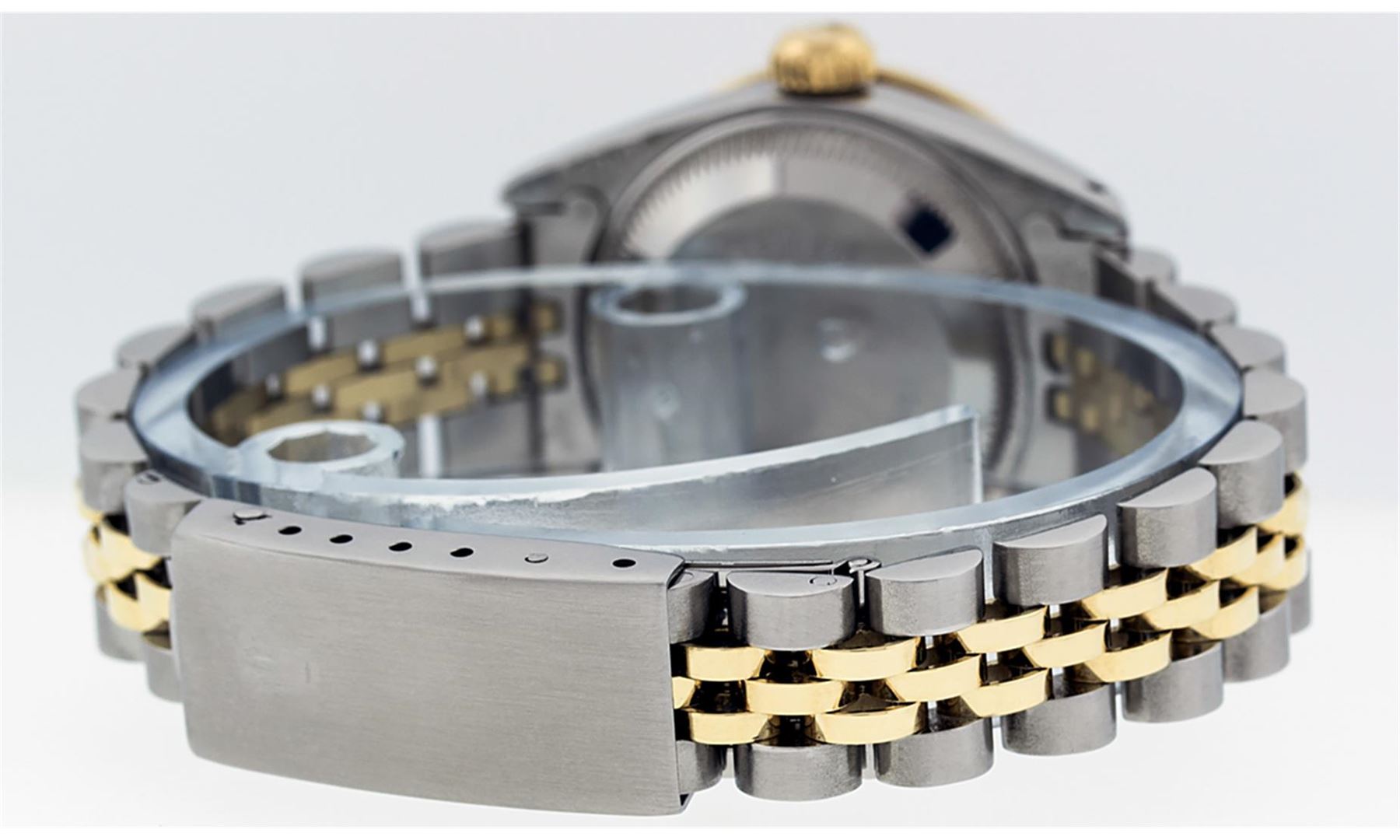 One Ladies Two Tone Rolex Datejust Polished, Serviced & Electronically Tested, Yellow Gold & Stainless Steel Case: 26mm, Yellow Gold Crown, Diamond Lugs: 24 Diamonds On Lugs, Clarity: SI-VS, Color: G to H. Custom Bezel: New 18K Yellow Gold Pyramid Diamond Bezel, Diamond Count: 24 Diamonds, Total Bezel Weight .50 Carat, Clarity: SI-VS, Color: G to H. Custom Crystal: New Scratch Resistant Synthetic Sapphire Cyclops Lens. Custom Hands: New Luminescent Hands. Movement: Automatic Winding Movement. Custom Dial: Pink Mother Of Pearl With Diamond Hour Markers, Diamond Count: 10 Diamonds In Dial, Clarity: SI-VS, Color: G to H. Date Window: 3 O'clock Position Date Display, Model: Datejust. Condition: G-6 Extra Fine. Bracelet: Two Tone Yellow Gold & Stainless Steel Jubilee Band. Bright Polish. 6.0 Inch Length, Adjustable. Standard Clasp, With Rolex Logo. This Watch Has Been Serviced Time Tested And Is In Excellent Condition It Is Free Of All Scratches And Dents.