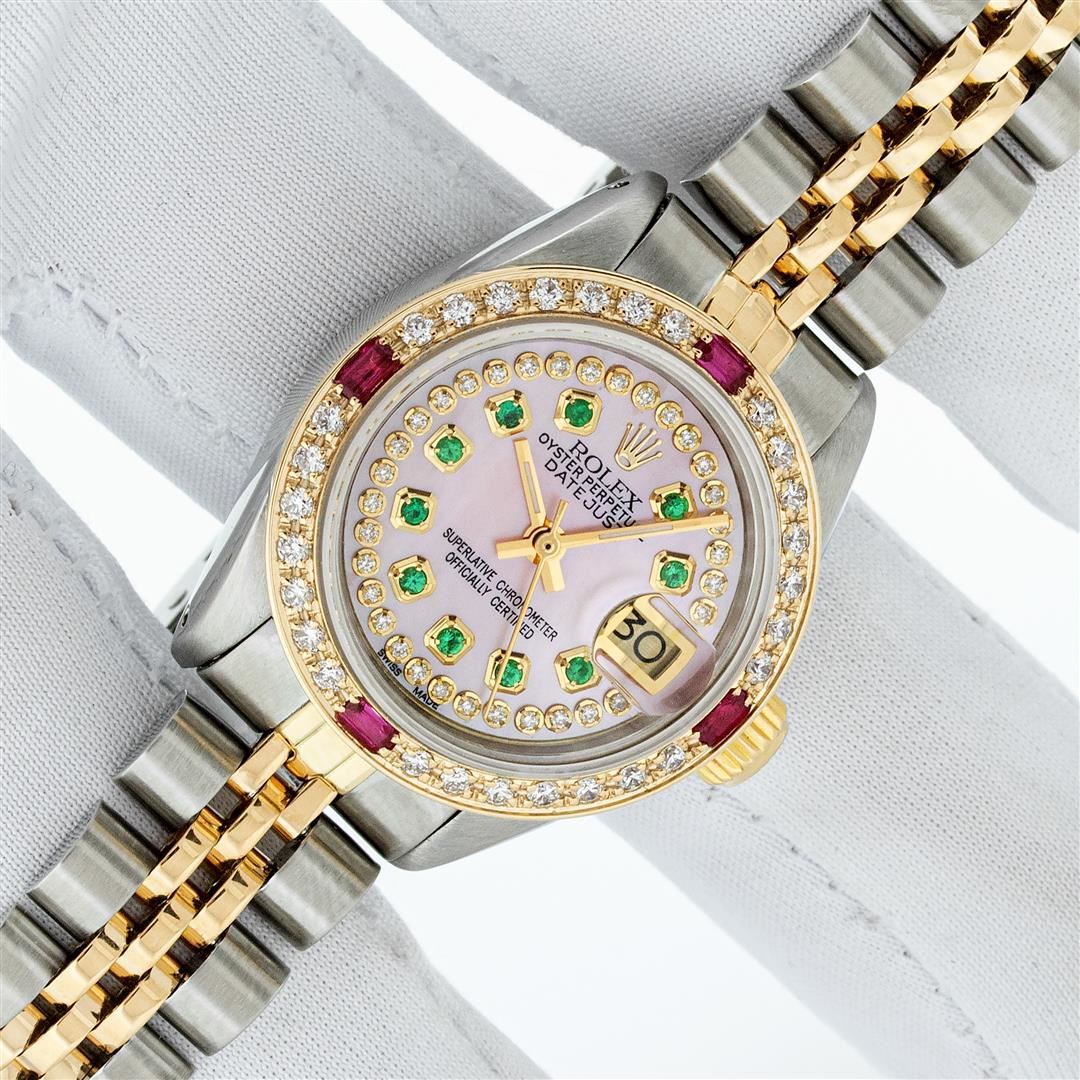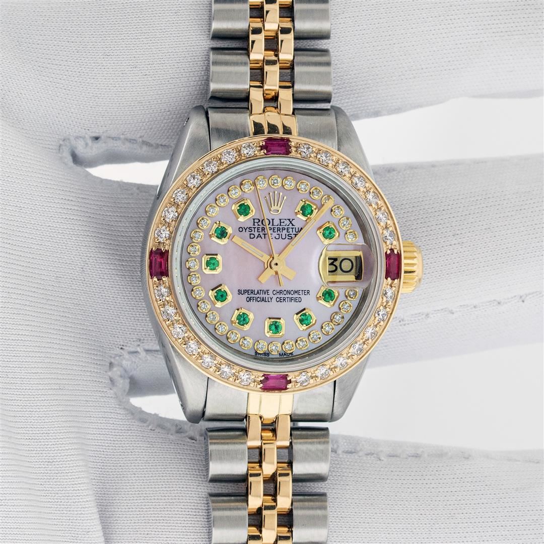 Rolex Ladies Two Tone Pink MOP Emerald, Ruby and Diamond Datejust Wristwatch