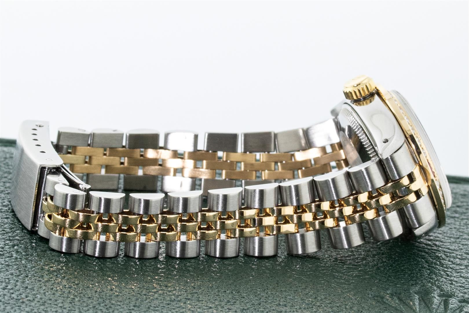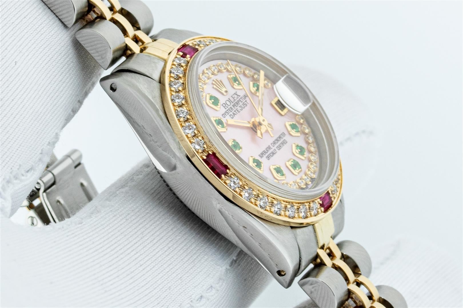 One Ladies Two Tone Rolex Datejust Polished, Serviced & Electronically Tested, Yellow Gold & Stainless Steel Case: 26mm, Yellow Gold Crown, Custom Bezel: New 18K New Yellow Gold Ruby Beadset Diamond Bezel, Stone Count: 28 Diamonds + 4 Rubies In Dial, Clarity: SI-VS, Color: G to H. Custom Crystal: New Sapphire With Date Window. Custom Hands: New Luminescent Hands. Rolex Movement: Automatic Winding Movement. Custom Dial: Pink Mother Of Pearl Emerald String Diamond Dial, Stone Count: 10 Emeralds + 33 Diamonds In Dial, Clarity: SI-VS, Color: G to H. Date Window: 3 O'Clock Position Date Display, Model: Datejust. Condition: G-6 Extra Fine. Rolex Bracelet: Two Tone Yellow Gold & Stainless Steel Jubilee Band. Bright Polish. 6.0 Inch Length, Adjustable. Standard Clasp, With Rolex Logo. This Watch Has Been Serviced Time Tested And Is In Excellent Condition It Is Free Of All Scratches And Dents. This Watch Comes With A Rolex Box.