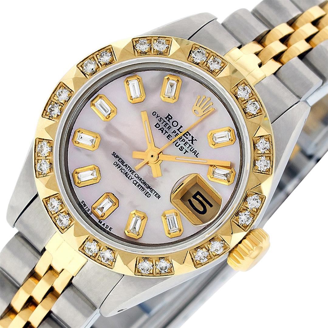 One Ladies Two Tone Rolex Datejust Polished, Serviced & Electronically Tested, Yellow Gold & Stainless Steel Case: 26mm, Yellow Gold Crown, Custom Bezel: 18K Yellow Gold Pyramid Diamond Bezel, Diamond Count: 24 Diamonds Total Weight .50 Carat, Clarity: Si-VS, Color: G to H. Custom Crystal: Synthetic Sapphire Cyclops Lens. Custom Hands: New Luminescent Hands. Movement: Automatic Winding Movement. Custom Dial: Pink Mother Of Pearl Baguette Diamond Hour Markers. 10 Baguette Diamonds In Dial, Clarity: SI-VS, Color: G to H. Date Window: 3 O'clock Position Date Display, Model: Datejust. Condition: G-6 Extra Fine. Bracelet: Two Tone Yellow Gold & Stainless Steel Jubilee. Bright Polish. 6.0 Inch Length, Adjustable. Standard Clasp, With Rolex Logo. This Watch Has Been Serviced Time Tested And Is In Excellent Condition It Is Free Of All Scratches And Dents.