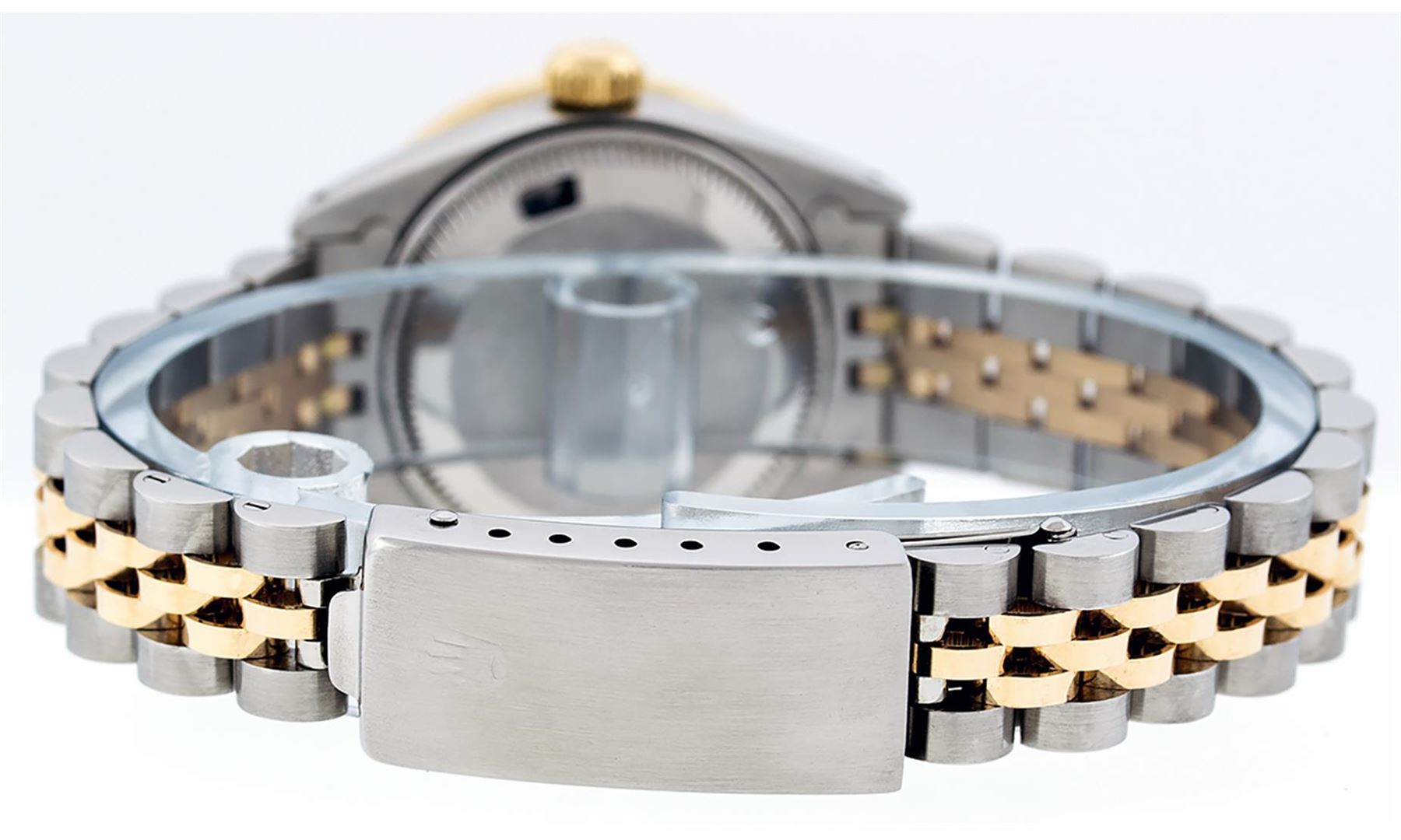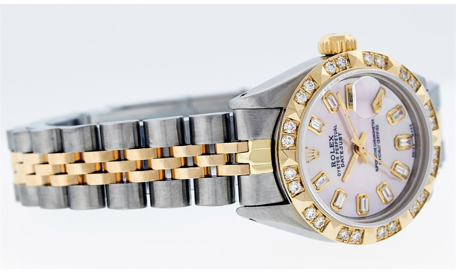 One Ladies Two Tone Rolex Datejust Polished, Serviced & Electronically Tested, Yellow Gold & Stainless Steel Case: 26mm, Yellow Gold Crown, Custom Bezel: 18K Yellow Gold Pyramid Diamond Bezel, Diamond Count: 24 Diamonds Total Weight .50 Carat, Clarity: Si-VS, Color: G to H. Custom Crystal: Synthetic Sapphire Cyclops Lens. Custom Hands: New Luminescent Hands. Movement: Automatic Winding Movement. Custom Dial: Pink Mother Of Pearl Baguette Diamond Hour Markers. 10 Baguette Diamonds In Dial, Clarity: SI-VS, Color: G to H. Date Window: 3 O'clock Position Date Display, Model: Datejust. Condition: G-6 Extra Fine. Bracelet: Two Tone Yellow Gold & Stainless Steel Jubilee. Bright Polish. 6.0 Inch Length, Adjustable. Standard Clasp, With Rolex Logo. This Watch Has Been Serviced Time Tested And Is In Excellent Condition It Is Free Of All Scratches And Dents.