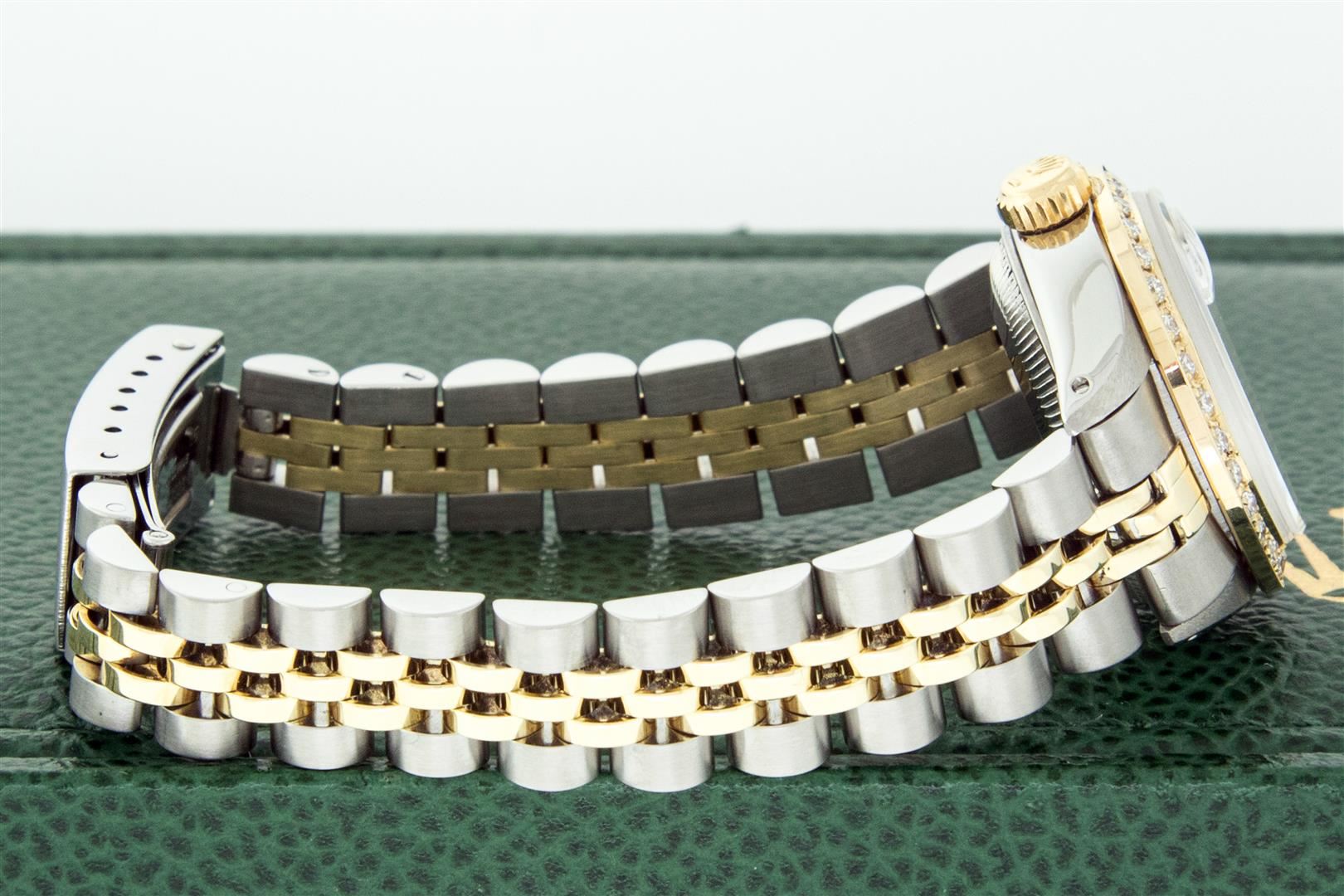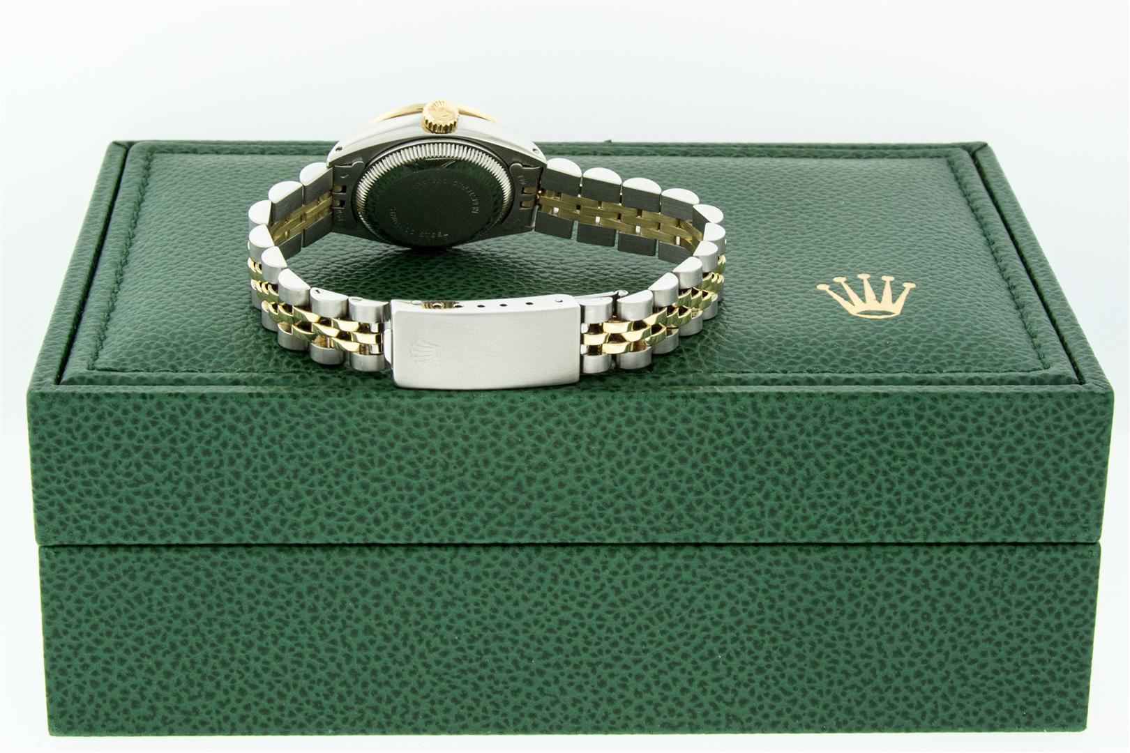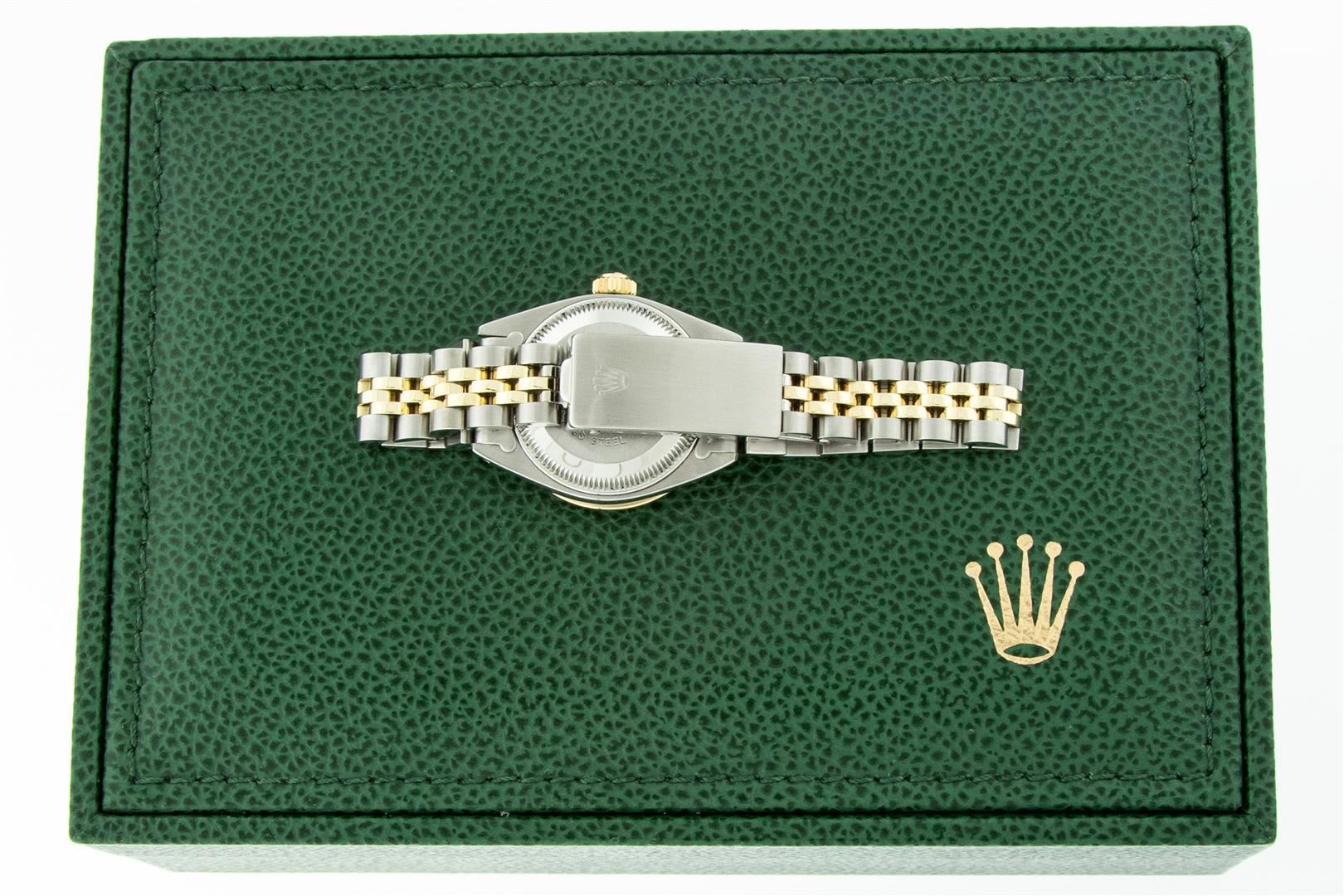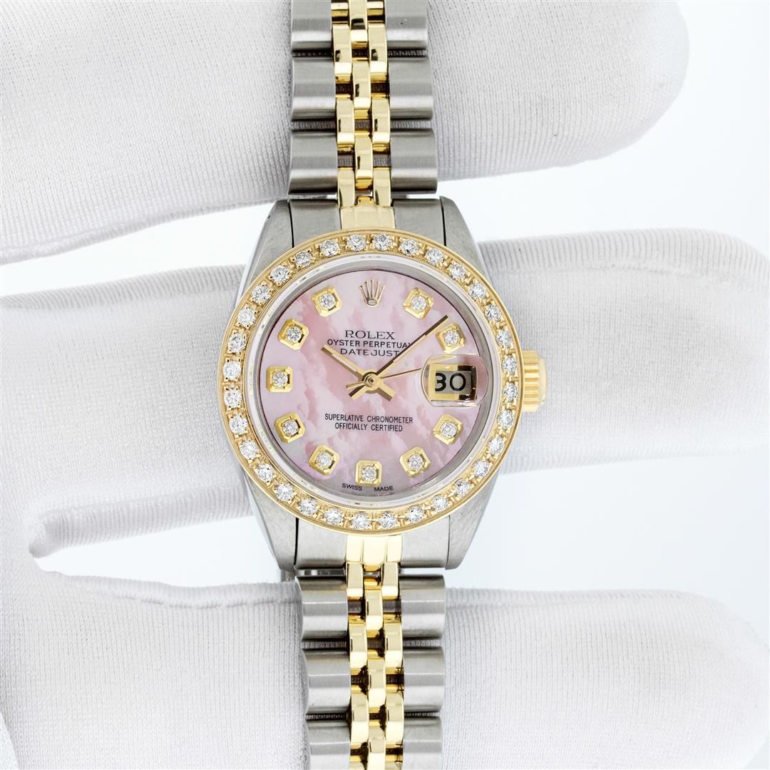 One Ladies Two Tone Rolex Datejust Polished, Serviced & Electronically Tested, Rolex Yellow Gold & Stainless Steel Case: 26mm, Rolex Yellow Gold Crown, Custom Bezel: New 18K Yellow Gold Beadset Diamond Bezel, Diamond Count: 32 Diamonds, Total Weight .70 Carat, Clarity: SI-VS, Color: G to H. Custom Crystal: New Sapphire With Magnified Date Window. Custom Hands: New Luminescent Hands. Rolex Movement: Automatic Winding Movement. Custom Dial: Pink Mother Of Pearl Diamond Dial, Diamond Count: 10 Diamonds in Dial, G To H In Color, VS Clarity. Date Window: 3 O'clock Position Date Display, Model: Datejust, Condition: G-6 Extra Fine. Rolex Bracelet: Two Tone Yellow Gold & Stainless Steel Jubilee Band. Bright Polish. 6.0 Inch Length, Adjustable. Standard Clasp, With Rolex Logo. This Pre Owned Watch Has Been Serviced Time Tested And Is In Excellent Condition It Is Free Of All Scratches And Dents. This Watch Comes With A Rolex Box.