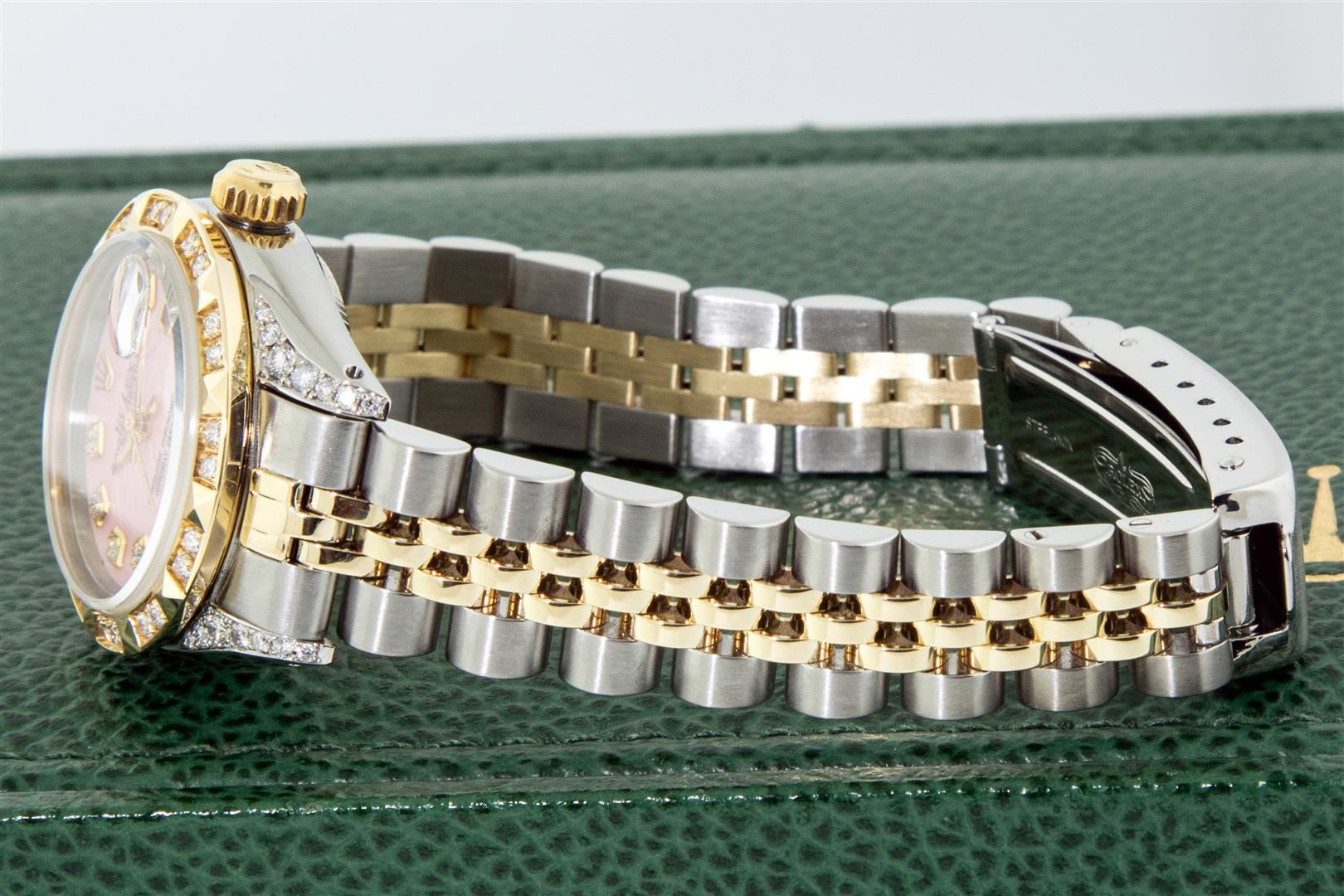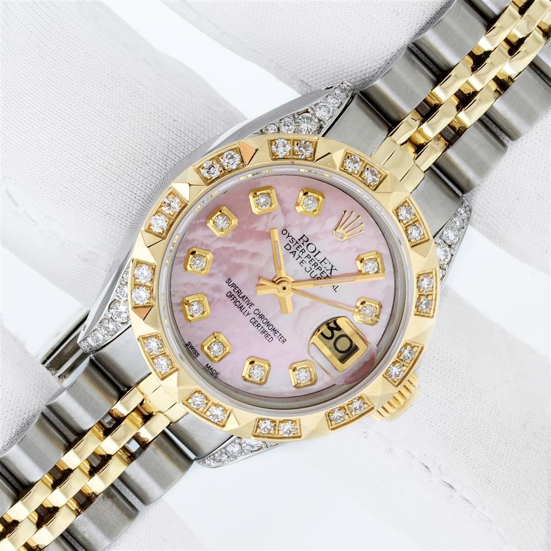 One Ladies Two Tone Rolex Datejust Polished, Serviced & Electronically Tested, Rolex Yellow Gold & Stainless Steel Case: 26mm, Rolex Yellow Gold Crown, Custom Diamond Lugs: 24 Diamonds On Lugs, Clarity: SI-VS, Color: G to H. Custom Bezel: New 18K Yellow Gold Pyramid Diamond Bezel, Diamond Count: 24 Diamonds, Total Bezel Weight .50 Carat, Clarity: SI-VS, Color: G to H. Custom Crystal: New Sapphire With Magnified Date Window. Custom Hands: New Luminescent Hands. Rolex Movement: Automatic Winding Movement. Custom Dial: Pink Mother Of Pearl With Diamond Hour Markers, Diamond Count: 10 Diamonds In Dial, Clarity: SI-VS, Color: G to H. Date Window: 3 O'clock Position Date Display, Model: Datejust. Condition: G-6 Extra Fine. Rolex Bracelet: Two Tone Yellow Gold & Stainless Steel Jubilee Band. Bright Polish. 6.0 Inch Length, Adjustable. Standard Clasp, With Rolex Logo. This Pre Owned Watch Has Been Serviced Time Tested And Is In Excellent Condition It Is Free Of All Scratches And Dents. This Watch Comes With A Rolex Box.