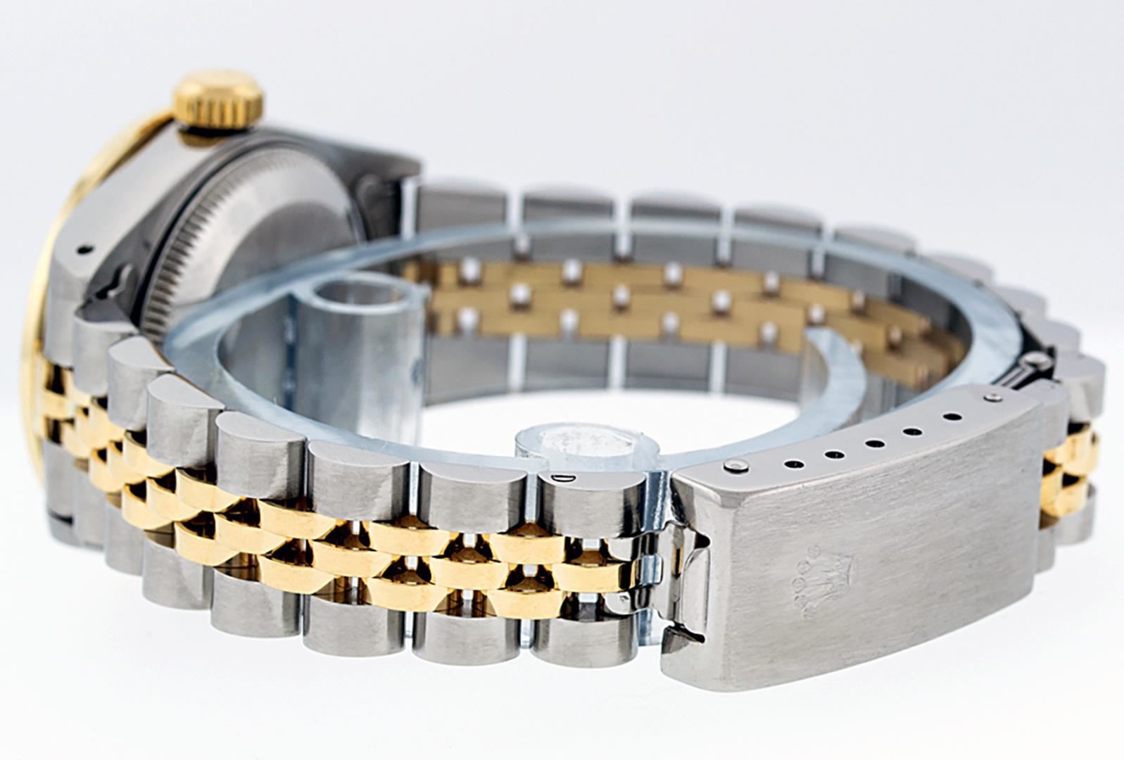 One Ladies Pre Owned Quickset Two Tone Yellow Gold And Stainless Steel Rolex Datejust Polished, Serviced And Electronically Tested, Yellow Gold and Stainless Steel Case: 26mm, Yellow Gold Crown, Custom Bezel: New 18K 1ctw Yellow Gold Beadset Diamond Bezel, Diamond Count: 42 Diamonds, Total Weight 1.00 Carat. Custom Crystal: New Sapphire With Magnified Date. Custom Hands: New Luminescent Hands. Rolex Movement: Automatic Winding Movement 2135. Custom Dial: Custom Blue Vignette Dial With Added Diamonds, Diamond Count: 10 Single Cut Diamonds On Dial. Date Window: 3 O'Clock Position Date Display, Model: Datejust, Condition: G-6 Extra Fine. Rolex Bracelet: Two Tone Yellow Gold And Stainless Steel Jubilee Band. Bright Polish. 6.0 Inch Length, Adjustable. Standard Clasp, With Rolex Logo. This Watch Has Been Serviced Time Tested And Is In Excellent Condition It Is Free Of All Scratches And Dents.