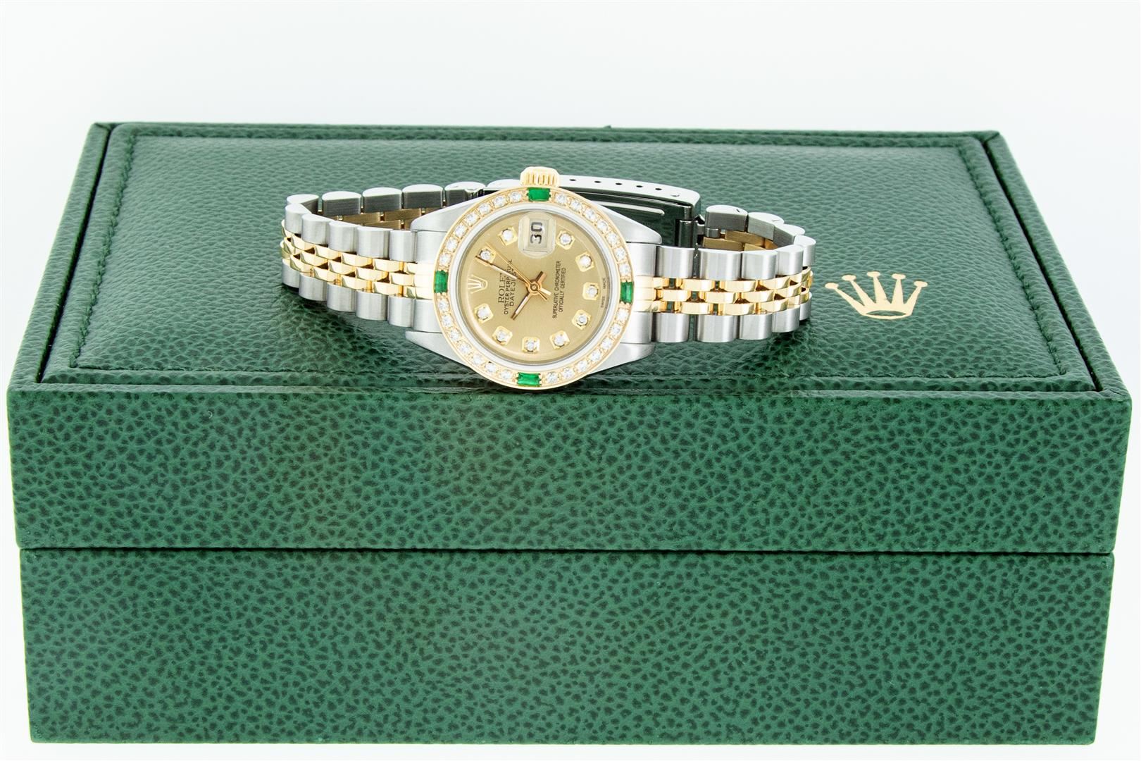 One Ladies 18K Two Tone Rolex Datejust Polished, Serviced & Electronically Tested, 18K Yellow Gold & Stainless Steel Case: 26mm, Rolex 18K Yellow Gold Crown, Custom Bezel: New 18K Yellow Gold Emerald Beadset Diamond Bezel, Diamond + Gem Count: 28 Diamonds + 4 Emeralds Total Weight .70 Carat, Clarity: SI-VS, Color: G to H. Custom Crystal: New Sapphire With Magnified Date Window. Custom Hands: New Luminescent Hands. Rolex Movement: Quickset Automatic Winding Movement. Custom Dial: Refinished To Champagne With Custom Added Diamonds, Diamond Count: 10 Single Cut VS Diamonds in Dial, G To H In Color, VS Clarity. Date Window: 3 O'clock Position Date Display, Model: Datejust, Condition: G-6 Extra Fine. Rolex Bracelet: Two Tone 18K Yellow Gold & Stainless Steel Jubilee Band. Bright Polish. 6.0 Inch Length, Adjustable. Standard Clasp, With Rolex Logo. This Pre Owned Watch Has Been Serviced Time Tested And Is In Excellent Condition It Is Free Of All Scratches And Dents. This Watch Comes With A Rolex Box.