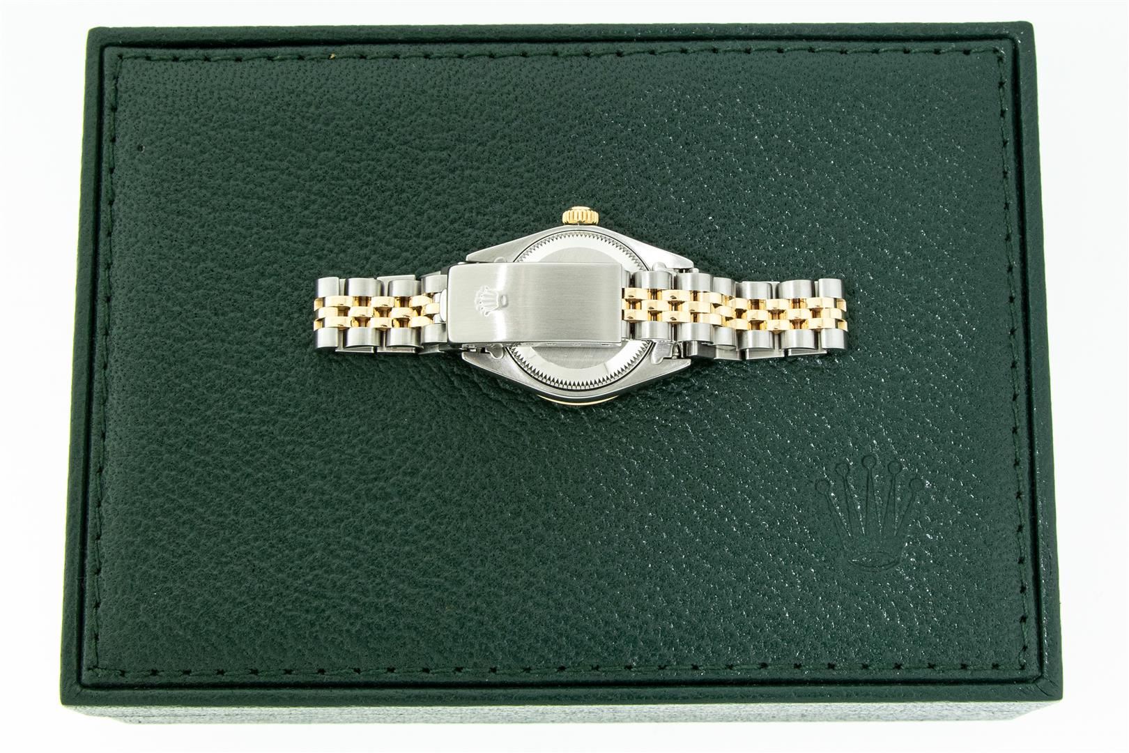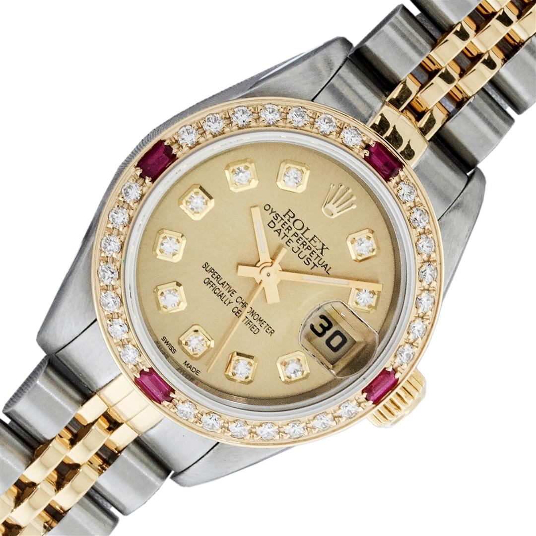 Rolex Ladies 18K Two Tone & Stainless Steel Rolex Datejust Polished, Serviced & Electronically Tested, 18K Yellow Gold & Stainless Steel Case: 26mm, Rolex 18K Yellow Gold Crown, Custom Bezel: New 18K Yellow Gold Ruby Beadset Diamond Bezel, Diamond + Gem Count: 28 Diamonds + 4 Rubies, Clarity: SI-VS, Color: G to H. Custom Crystal: New Sapphire With Magnified Date Window. Custom Hands: New Luminescent Hands. Rolex Movement: Automatic Winding Movement. Custom Dial: Refinished To Champagne With Custom Added Diamonds, Diamond Count: 10 Champagne Single Cut Diamonds in Dial, G To H In Color, VS Clarity. Date Window: 3 O'clock Position Date Display, Model: Datejust, Condition: G-6 Extra Fine. Rolex Bracelet: Two Tone 18K Yellow Gold & Stainless Steel Jubilee Band. Bright Polish. 6.0 Inch Length, Adjustable. Standard Clasp, With Rolex Logo. This Pre Owned Watch Has Been Serviced Time Tested And Is In Excellent Condition It Is Free Of All Scratches And Dents. This Watch Comes With A Rolex Box.