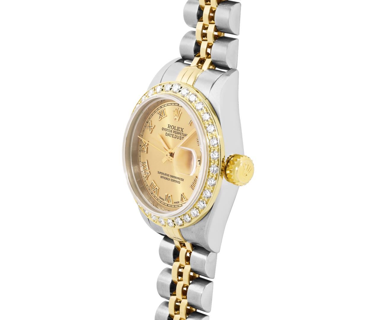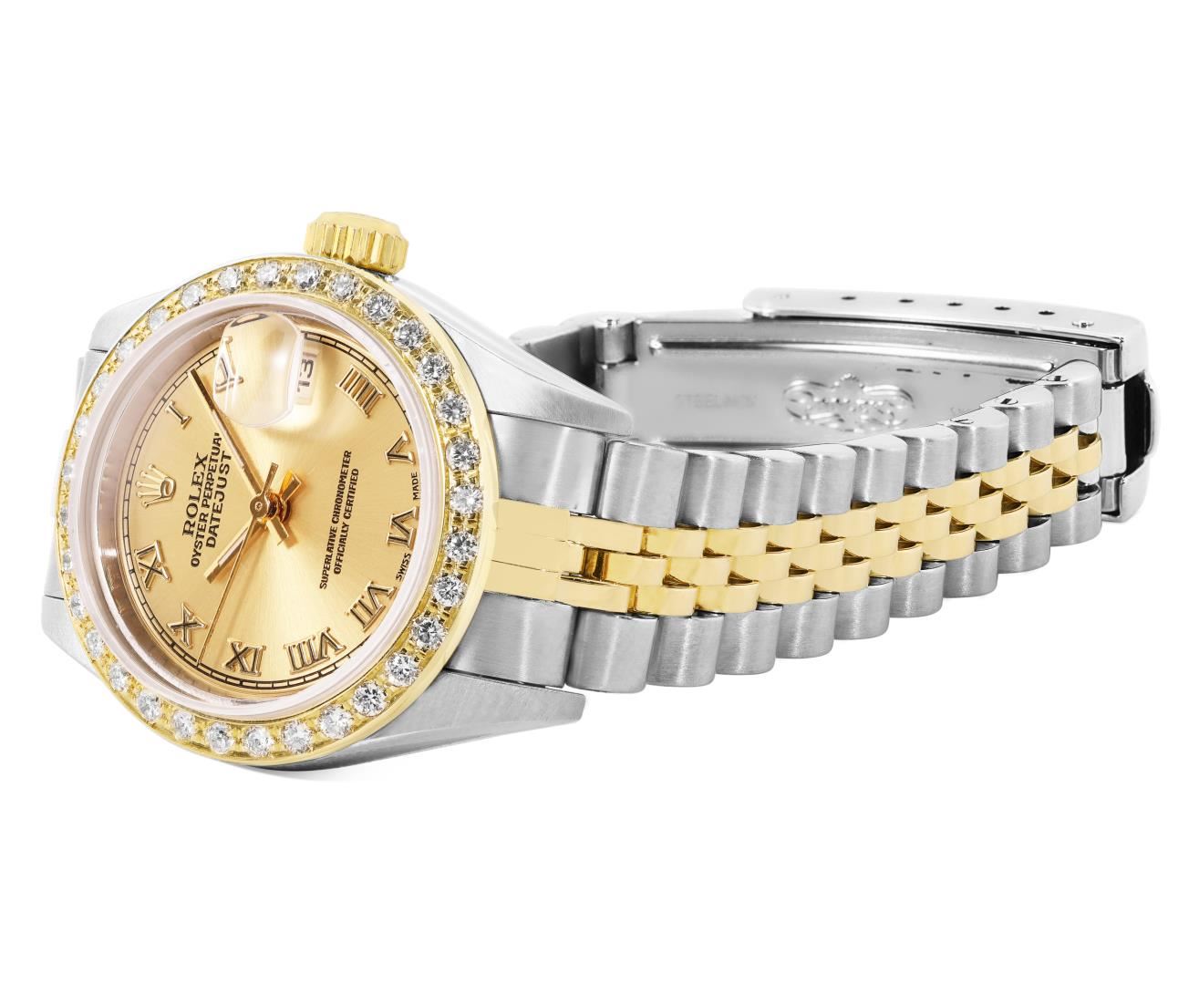Rolex Ladies Pre Owned Sapphire Quickset Two Tone 18K Yellow Gold and Stainless Steel Datejust Polished Bright with Satin Finish, Serviced And Electronically Tested, Rolex Stainless Steel Case: 26mm, Rolex 18K Yellow Gold Crown, Custom Bezel: New 18K Yellow Gold Beadset Diamond Bezel, Diamond Count: 32 Diamonds On Bezel. Custom Crystal: New Sapphire With Magnified Date Window. Custom Hands: New Luminescent Hands. Rolex Movement: Automatic Winding Movement 2235. Rolex Dial: Factory Champagne With Roman Hour Markers And Square Track. Date Window: 3 O'Clock Position Date Display, Model: Quickset Datejust, Condition: G-6 Extra Fine. Rolex Bracelet: 18K Yellow Gold And Stainless Steel Jubilee Band. Bright Polish And Satin Finish. 6.0 Inch Length, Adjustable. Standard Clasp, With Rolex Logo. This Watch Has Been Serviced Time Tested And Is In Excellent Condition It Is Free Of All Scratches And Dents.