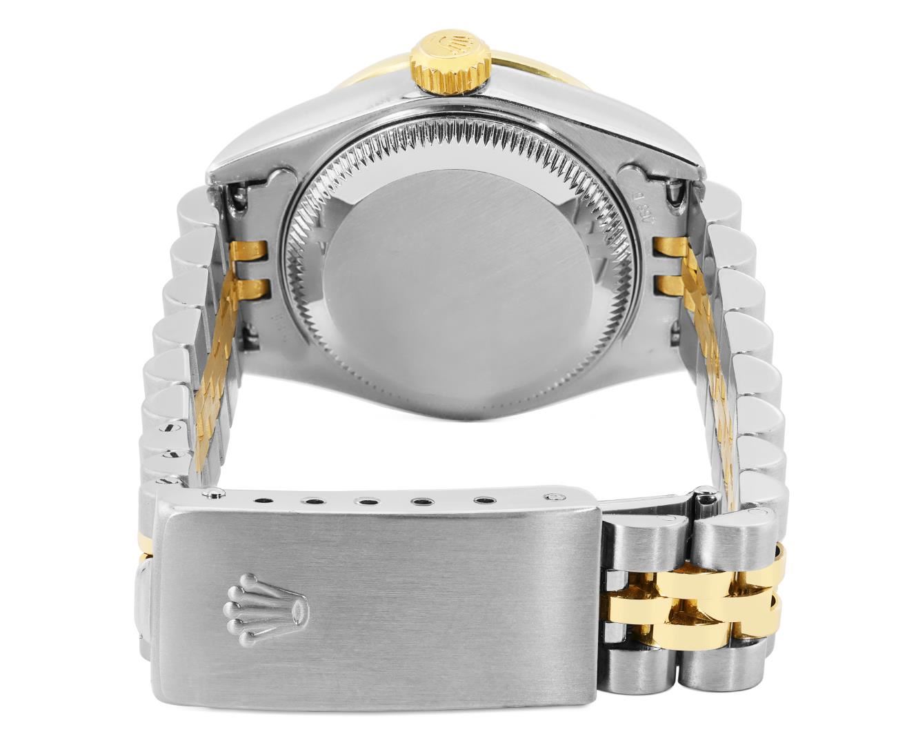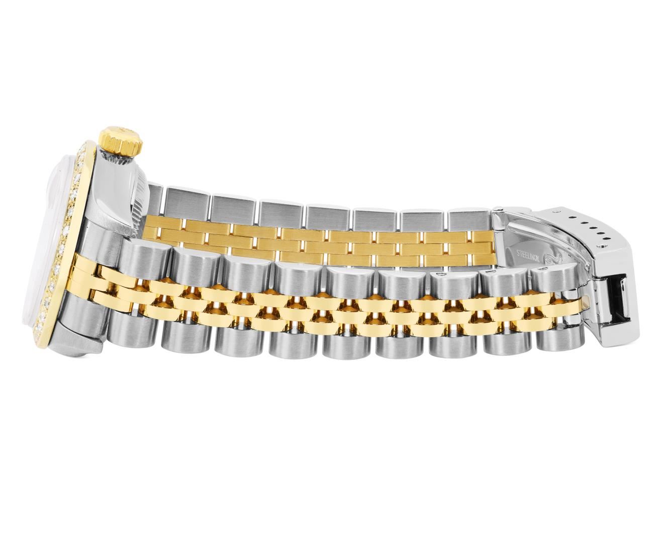 Rolex Ladies Pre Owned Sapphire Quickset Two Tone 18K Yellow Gold and Stainless Steel Datejust Polished Bright with Satin Finish, Serviced And Electronically Tested, Rolex Stainless Steel Case: 26mm, Rolex 18K Yellow Gold Crown, Custom Bezel: New 18K Yellow Gold Beadset Diamond Bezel, Diamond Count: 32 Diamonds On Bezel. Custom Crystal: New Sapphire With Magnified Date Window. Custom Hands: New Luminescent Hands. Rolex Movement: Automatic Winding Movement 2235. Rolex Dial: Factory Champagne With Roman Hour Markers And Square Track. Date Window: 3 O'Clock Position Date Display, Model: Quickset Datejust, Condition: G-6 Extra Fine. Rolex Bracelet: 18K Yellow Gold And Stainless Steel Jubilee Band. Bright Polish And Satin Finish. 6.0 Inch Length, Adjustable. Standard Clasp, With Rolex Logo. This Watch Has Been Serviced Time Tested And Is In Excellent Condition It Is Free Of All Scratches And Dents.