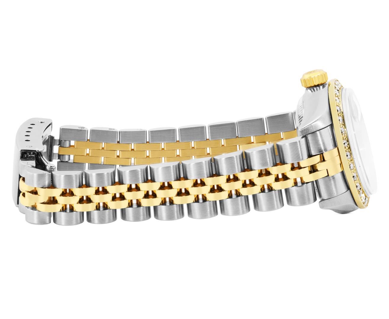 Rolex Ladies Pre Owned Sapphire Quickset Two Tone 18K Yellow Gold and Stainless Steel Datejust Polished Bright with Satin Finish, Serviced And Electronically Tested, Rolex Stainless Steel Case: 26mm, Rolex 18K Yellow Gold Crown, Custom Bezel: New 18K Yellow Gold Beadset Diamond Bezel, Diamond Count: 32 Diamonds On Bezel. Custom Crystal: New Sapphire With Magnified Date Window. Custom Hands: New Luminescent Hands. Rolex Movement: Automatic Winding Movement 2235. Rolex Dial: Factory Champagne With Roman Hour Markers And Square Track. Date Window: 3 O'Clock Position Date Display, Model: Quickset Datejust, Condition: G-6 Extra Fine. Rolex Bracelet: 18K Yellow Gold And Stainless Steel Jubilee Band. Bright Polish And Satin Finish. 6.0 Inch Length, Adjustable. Standard Clasp, With Rolex Logo. This Watch Has Been Serviced Time Tested And Is In Excellent Condition It Is Free Of All Scratches And Dents.